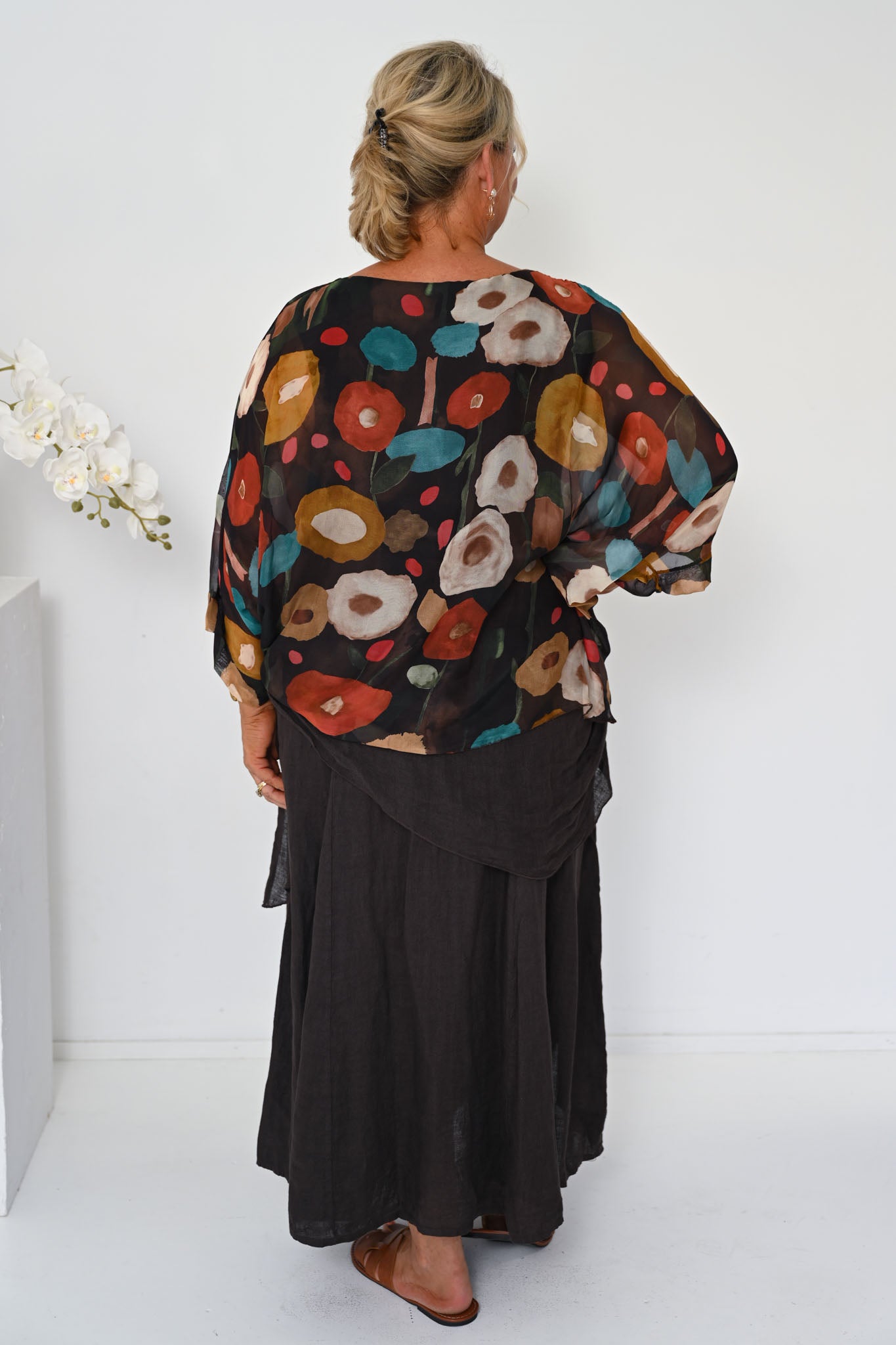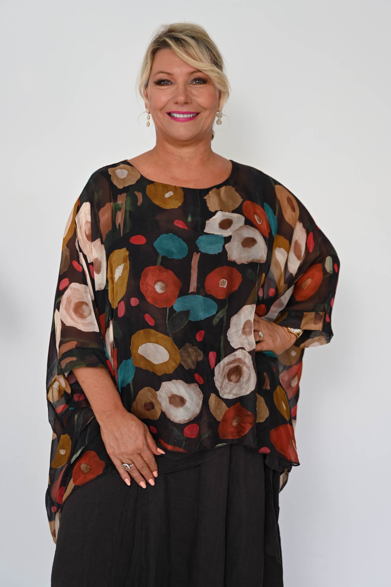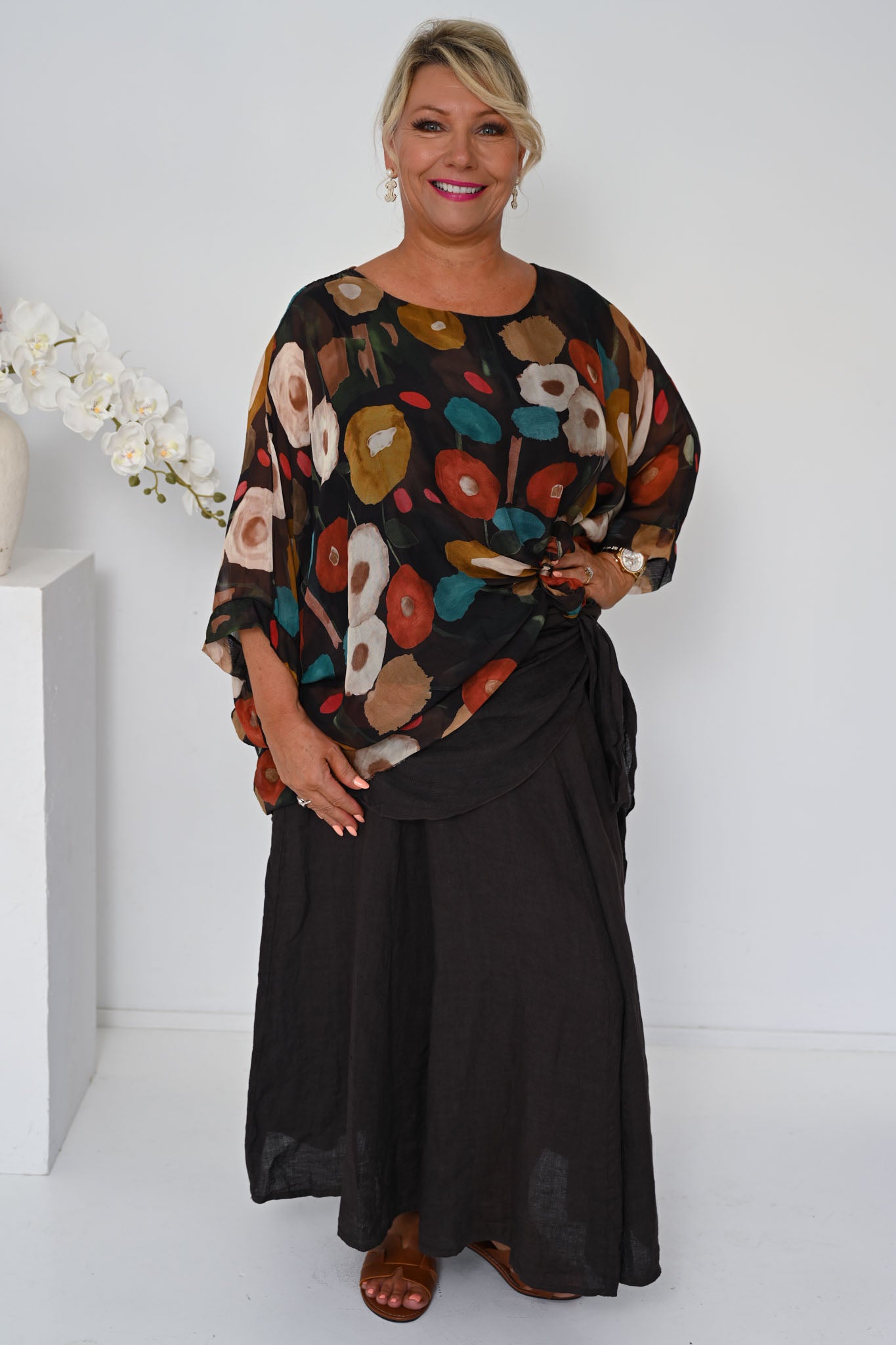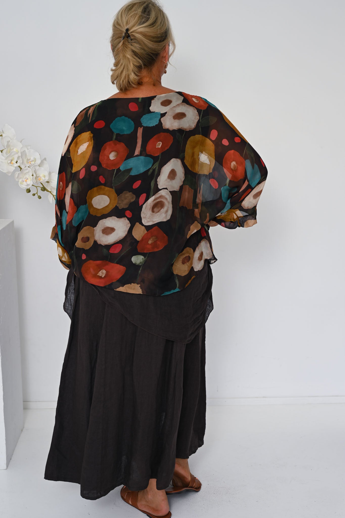 The Poppy Silk Top in Cocco brings together rich, earthy tones in a striking yet elegant design. Set against a deep brown base, the fabric is detailed with circular motifs in warm burnt orange and deep teal, creating a beautifully layered pattern with depth and character.