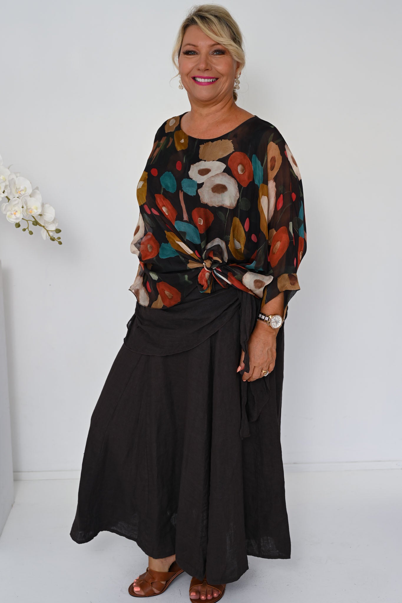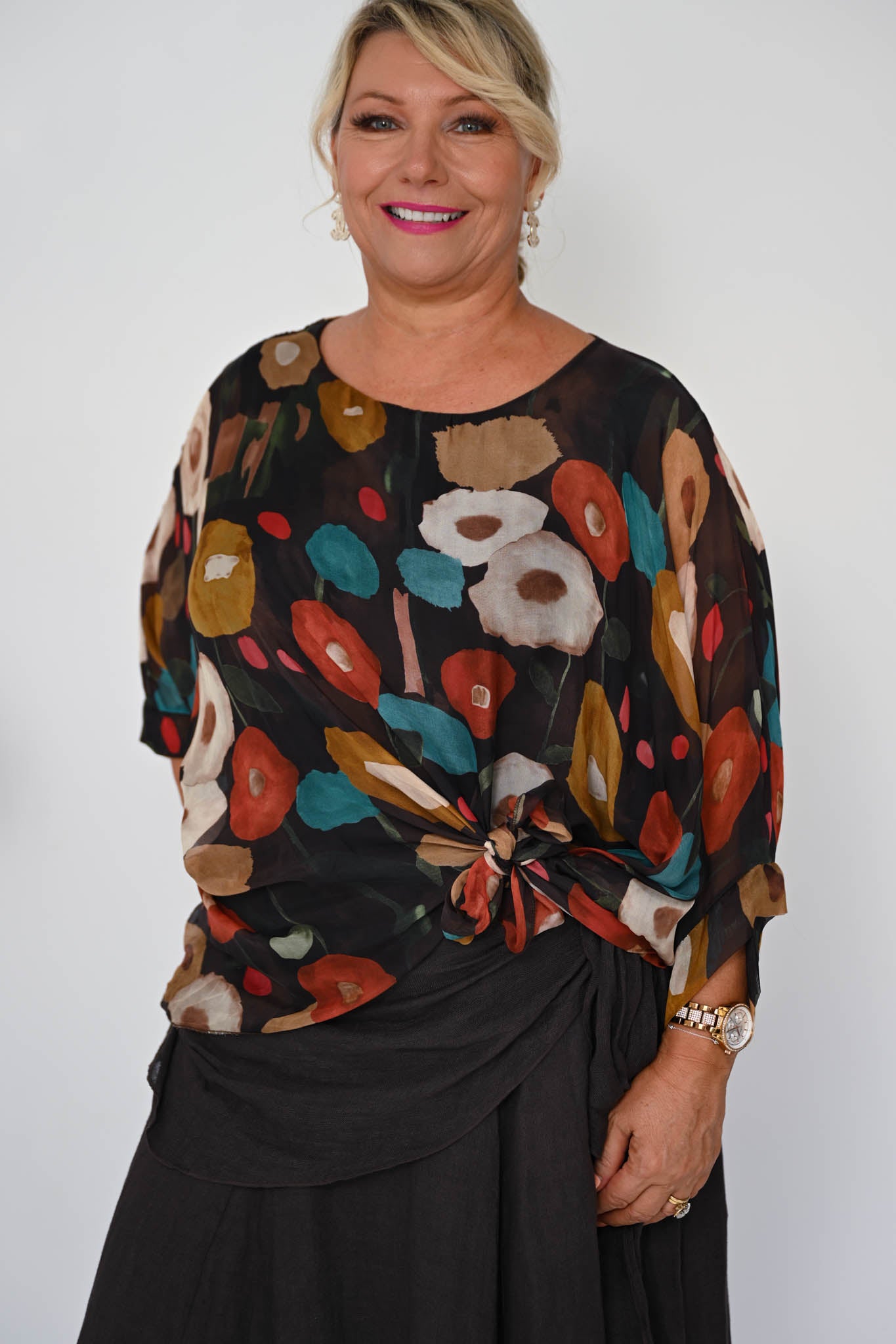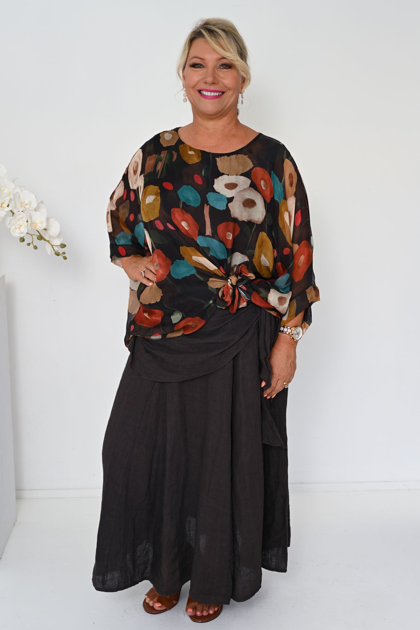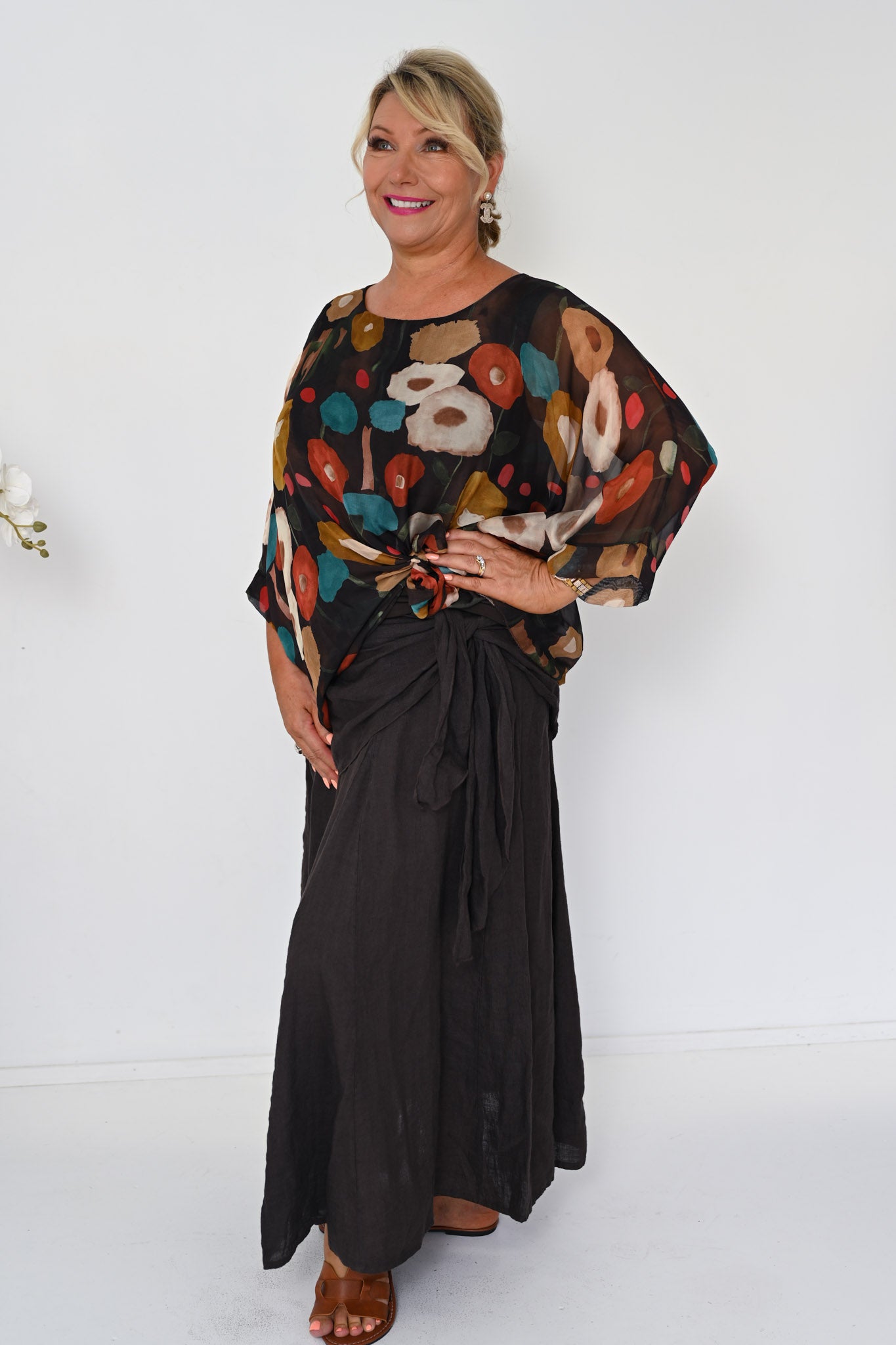 The Poppy Silk Top in Cocco brings together rich, earthy tones in a striking yet elegant design. Set against a deep brown base, the fabric is detailed with circular motifs in warm burnt orange and deep teal, creating a beautifully layered pattern with depth and character.