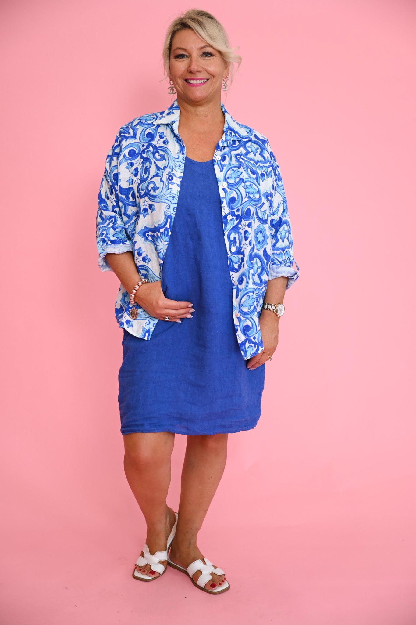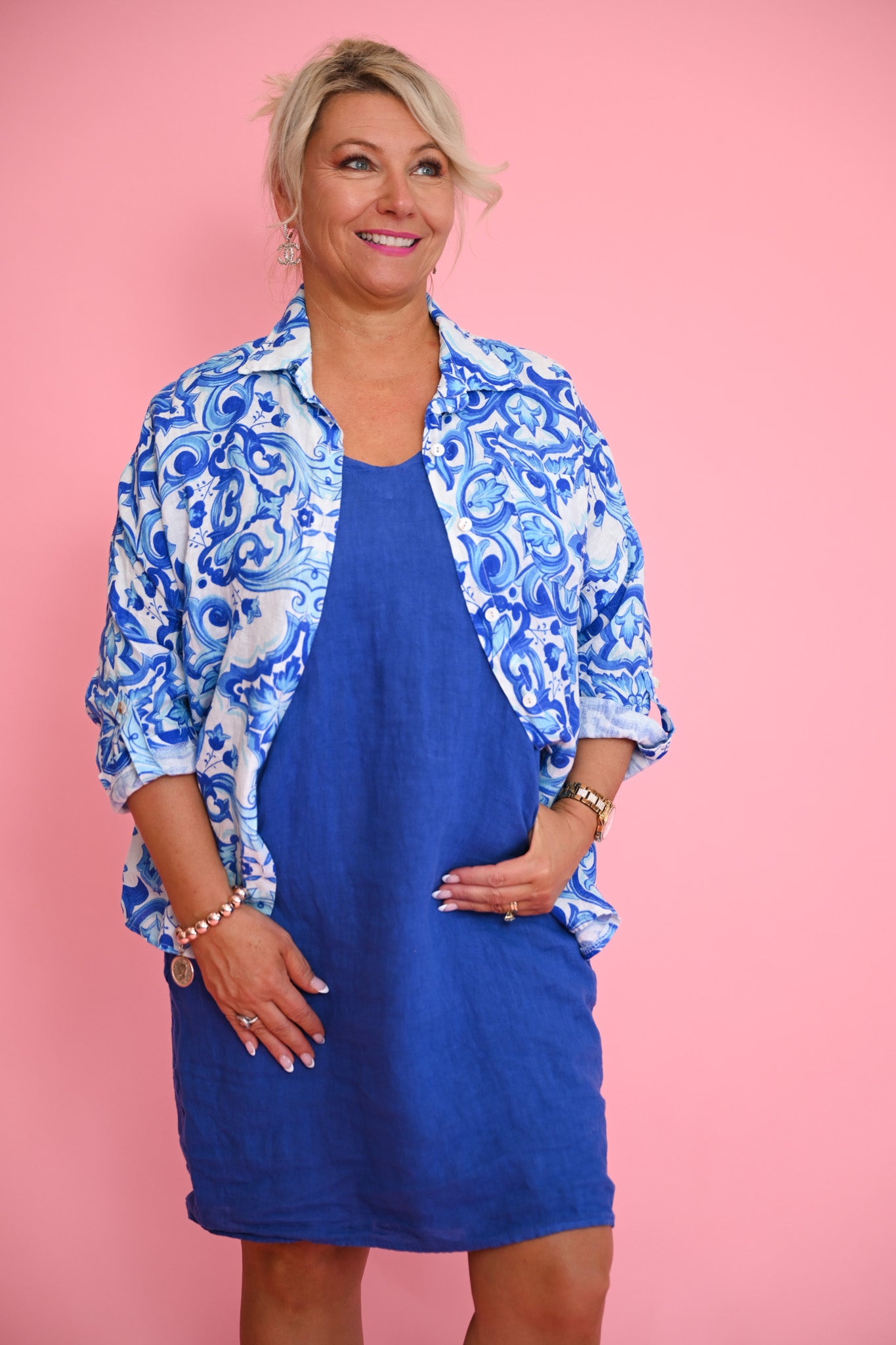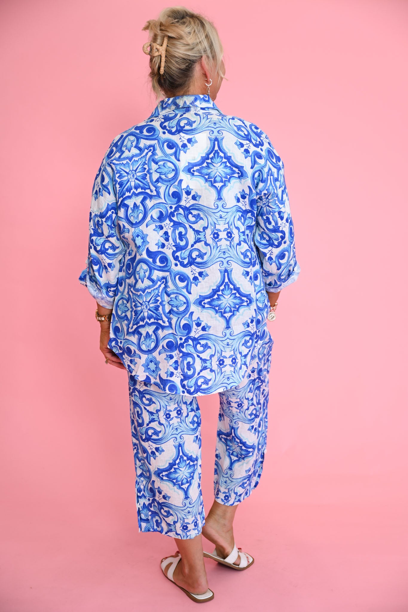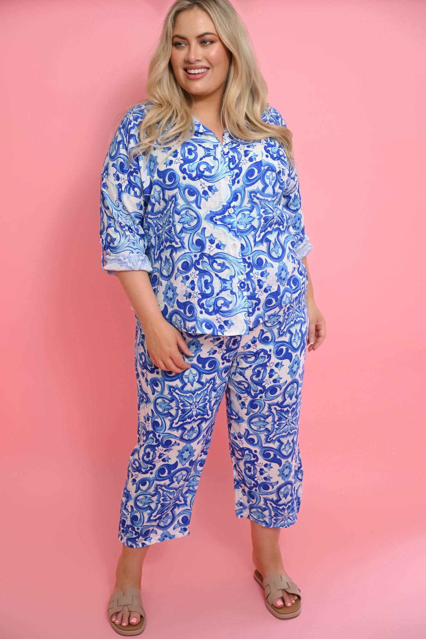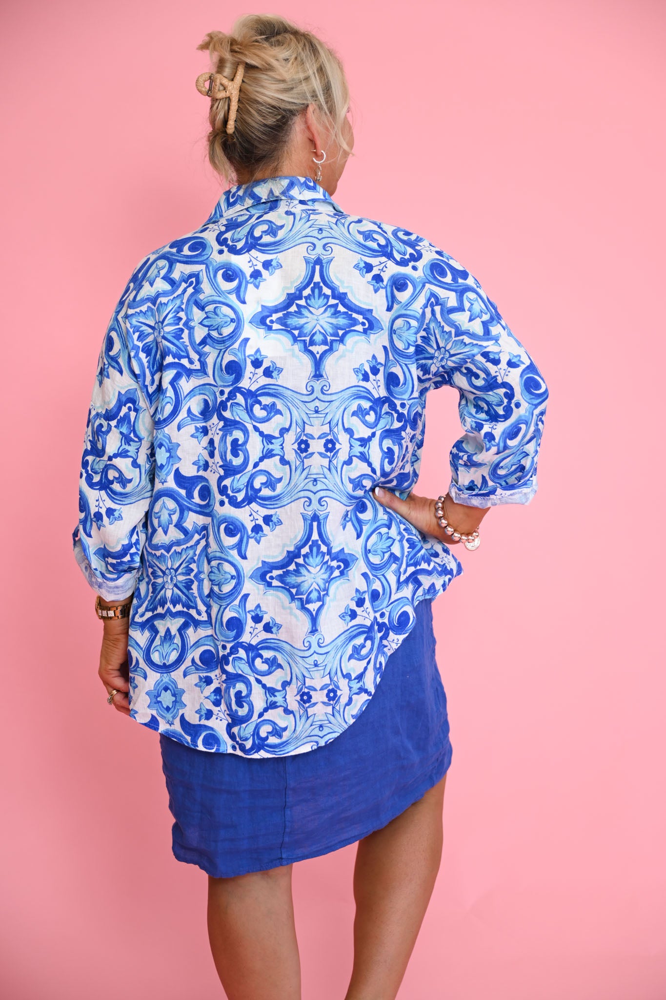 Designed with a button-tab cuff and a single chest pocket, the Porcelain Shirt combines practical detailing with elegant design. The intricate blue mosaic pattern adds subtle visual interest, making it perfect for pairing with neutral trousers, skirts, or other linen pieces for a refined, summery look.
