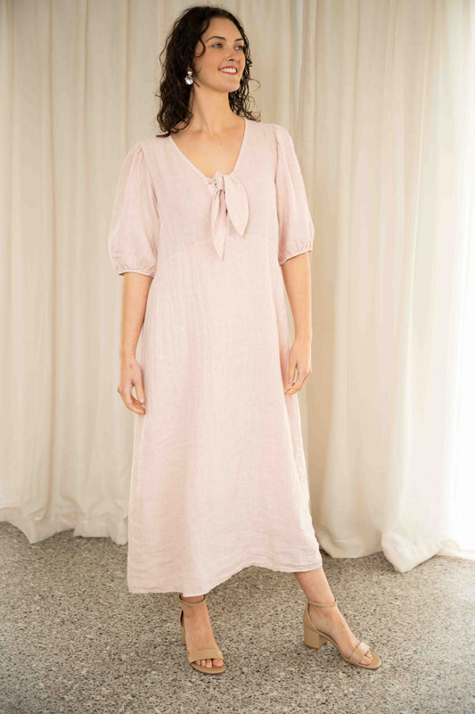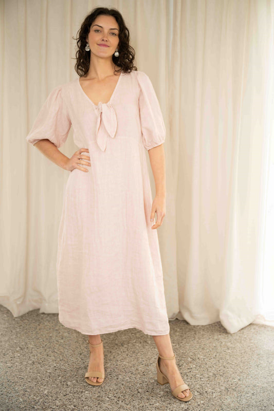 A soft V-neckline is accented with a delicate tie at the point, while puff sleeves add a subtle volume that complements the silhouette. The high waistline enhances the flattering A-line shape, which falls gracefully to mid-calf for a comfortable, flowing fit. A seam down the back adds quiet structure and shape to this elegant, wear-anywhere piece. The Emma Dress is simplicity done beautifully—easy to wear, easy to love.