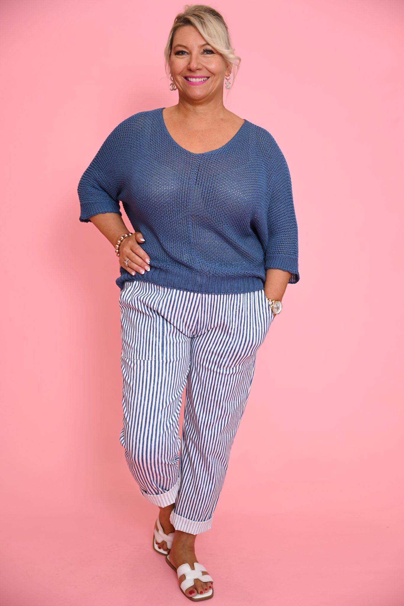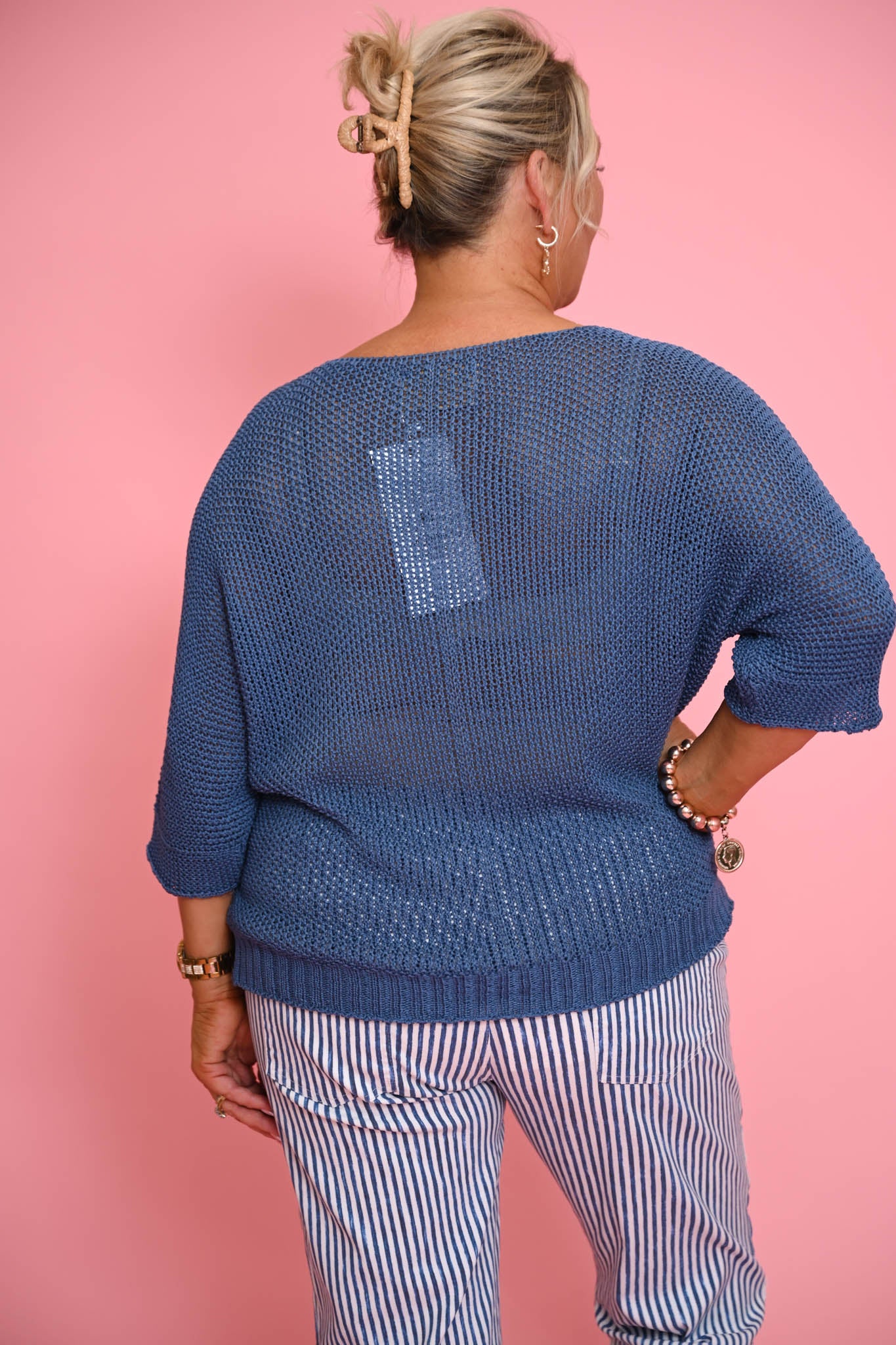 Perfect for layering over singlets, slip dresses, or cotton tees, the Jeans Knit in this washed blue tone offers the right balance of comfort and style—ideal for transitional dressing or cool summer evenings.