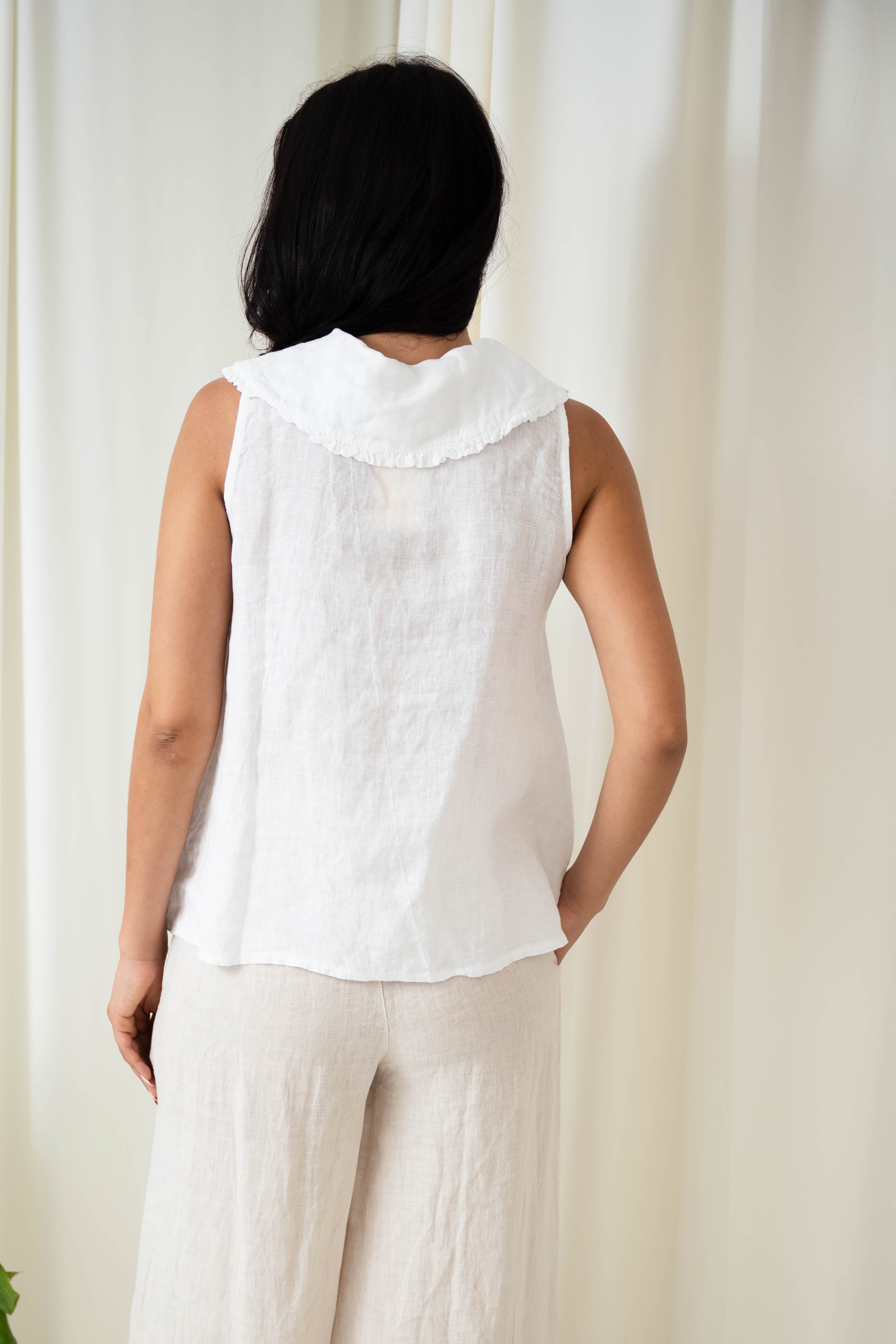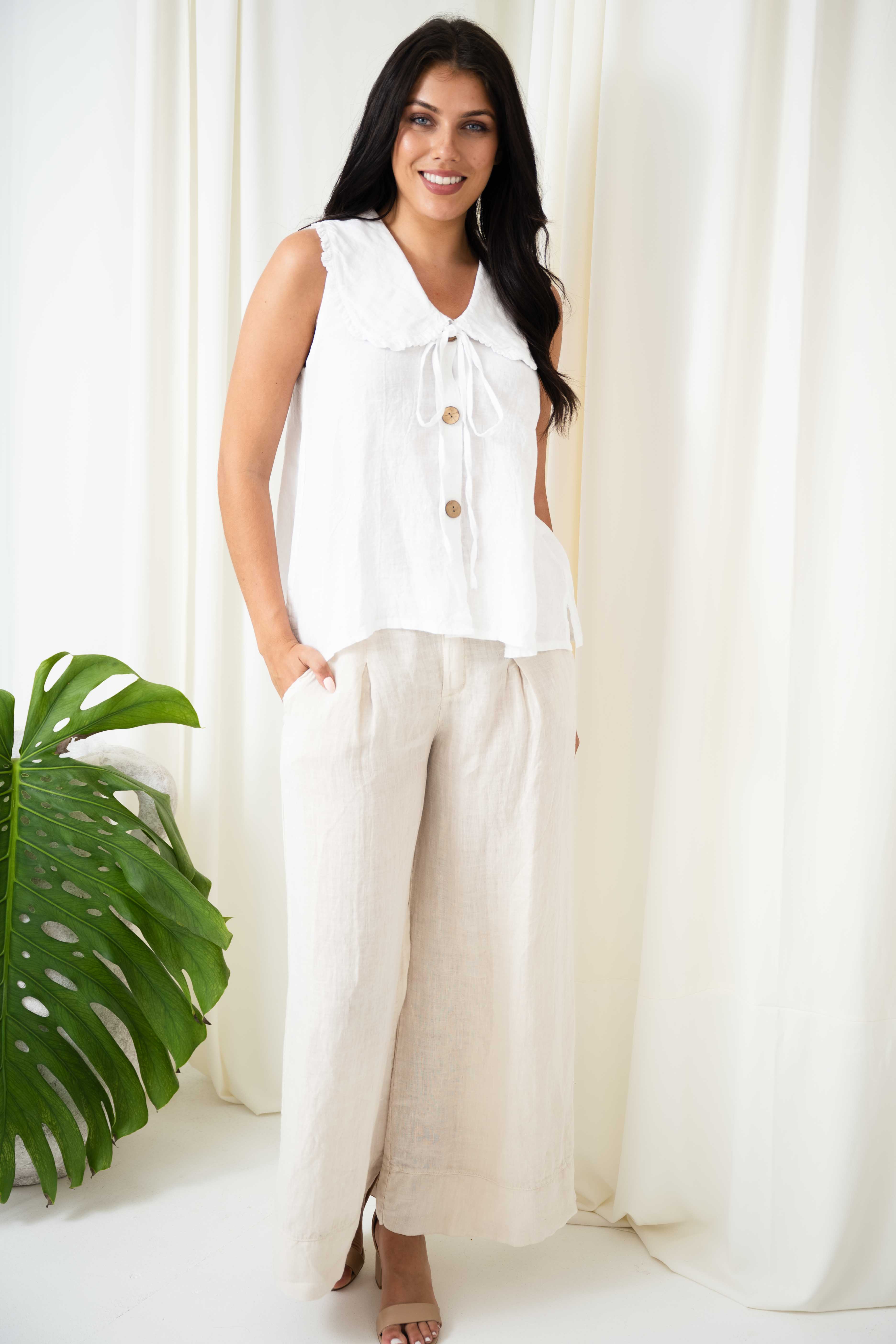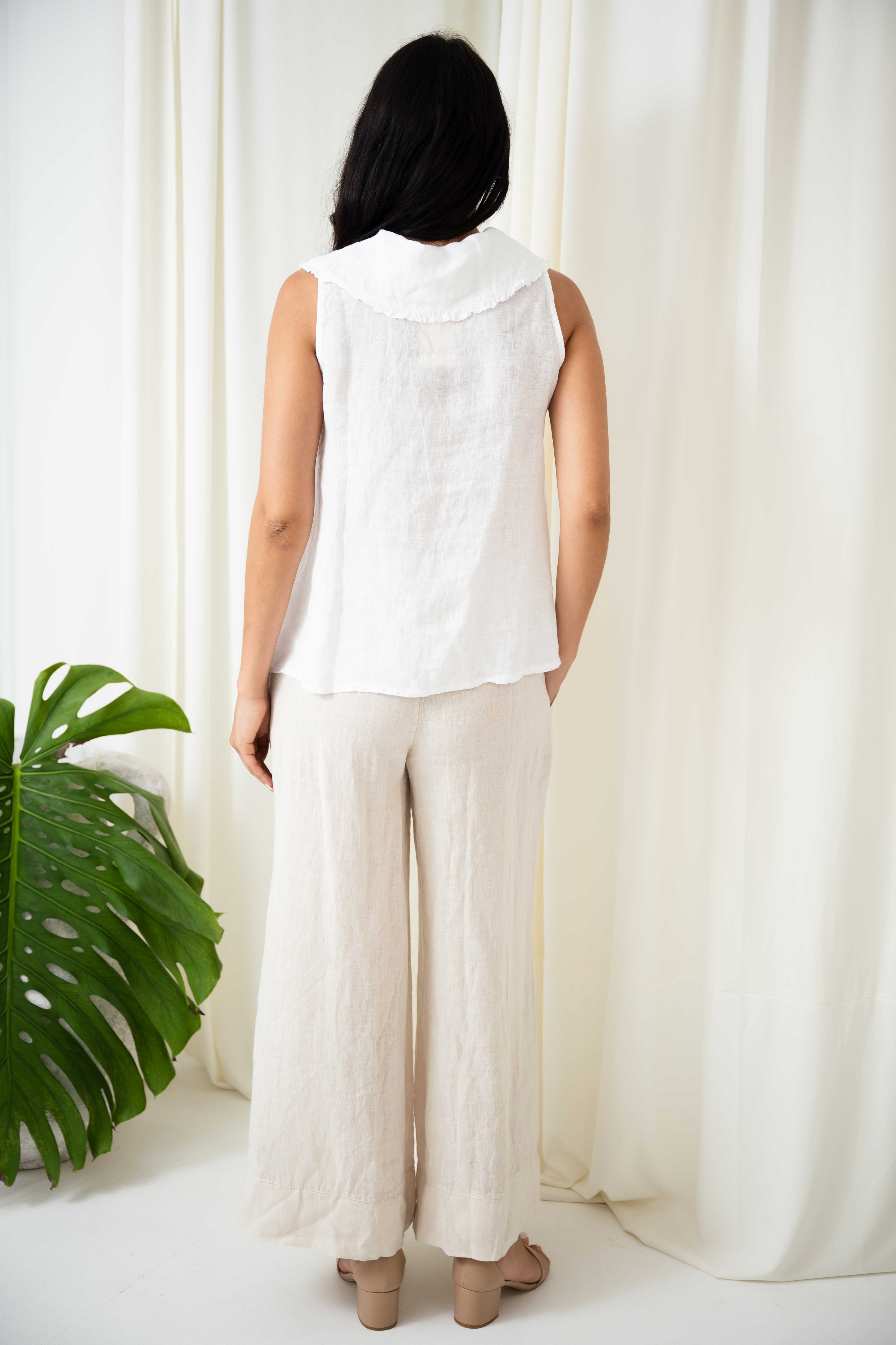 Sleeveless design with tie front peasant collar and button closure down the centre front. Made of quality Italian linen, this top will keep you cool and comfortable during warm days out and about.