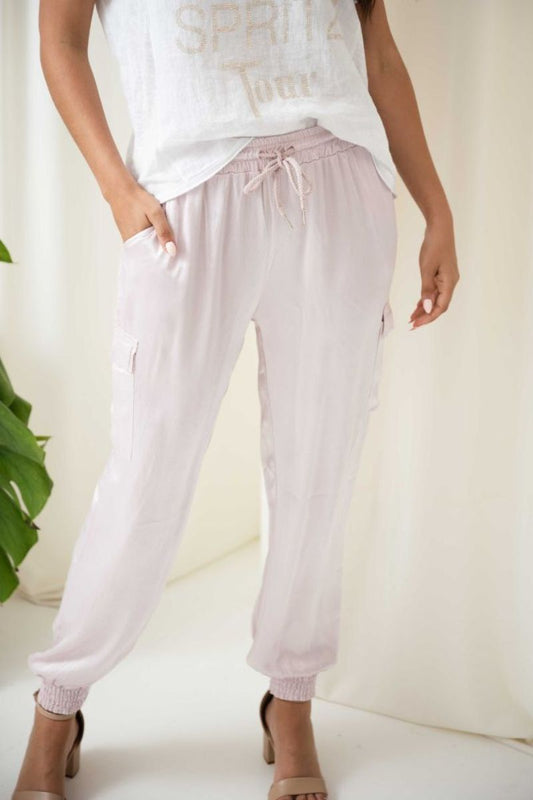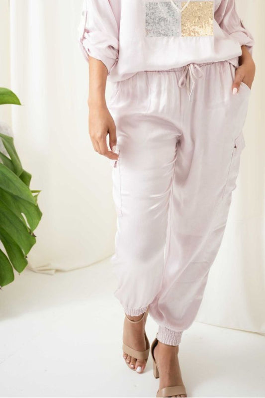 The Sass Satin Cargo Pants in Soft Pink bring a touch of laid-back luxury to your everyday wardrobe. Made from Viscose Satin, these pants combine comfort and style effortlessly. The elasticated drawstring waist offers a relaxed fit, while the loose leg tapers at the cuffed ankles for a flattering, modern silhouette. Practical pockets on the hips and bold cargo pockets on the leg add an extra design edge to this versatile piece.