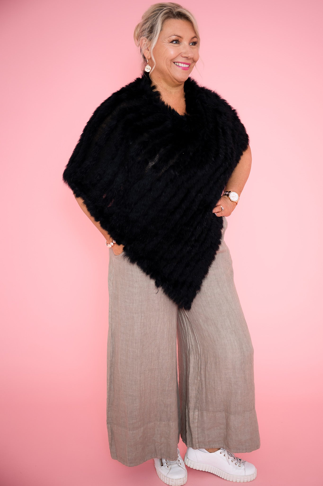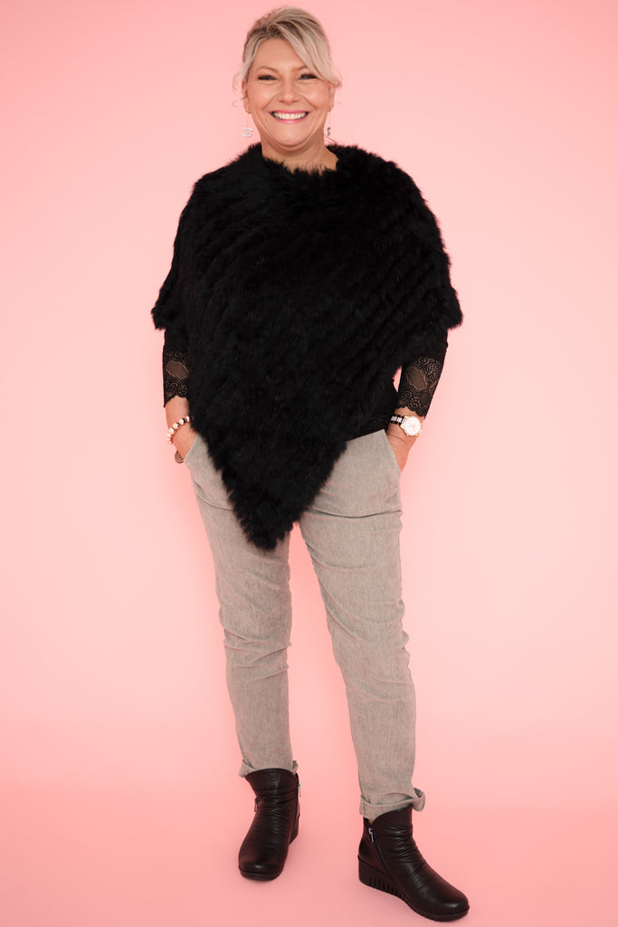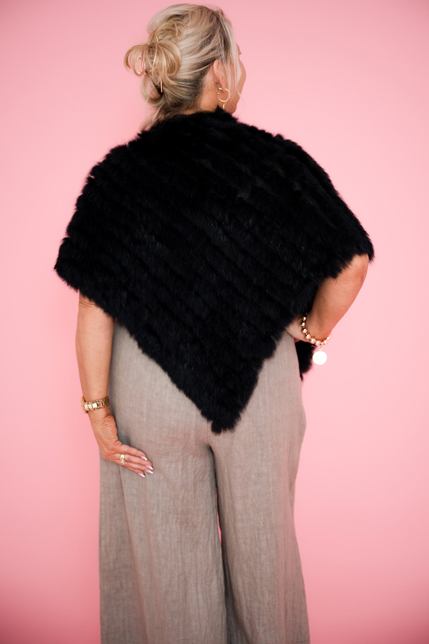 Chic and contemporary, the Black Rabbit Fur Poncho is the perfect statement layer to remain sophisticated and stylish on those cooler days. Designed in a dramatic diamond shape, it features soft points at the front and back that create a flowing, elongated silhouette.