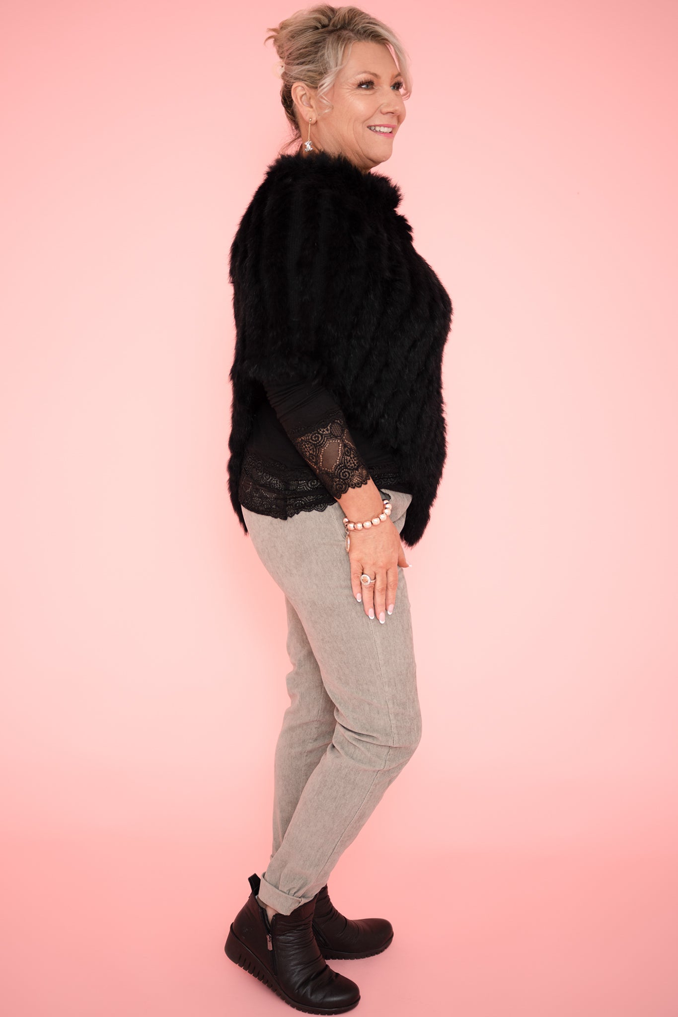 Crafted from a warm yet lightweight acrylic blend, this piece is trimmed with plush 80% rabbit fur—running diagonally across the body and outlining the full hem—for a rich, tactile finish. The boat neckline adds a refined touch, making it easy to throw on over any outfit for an instant lift in style.