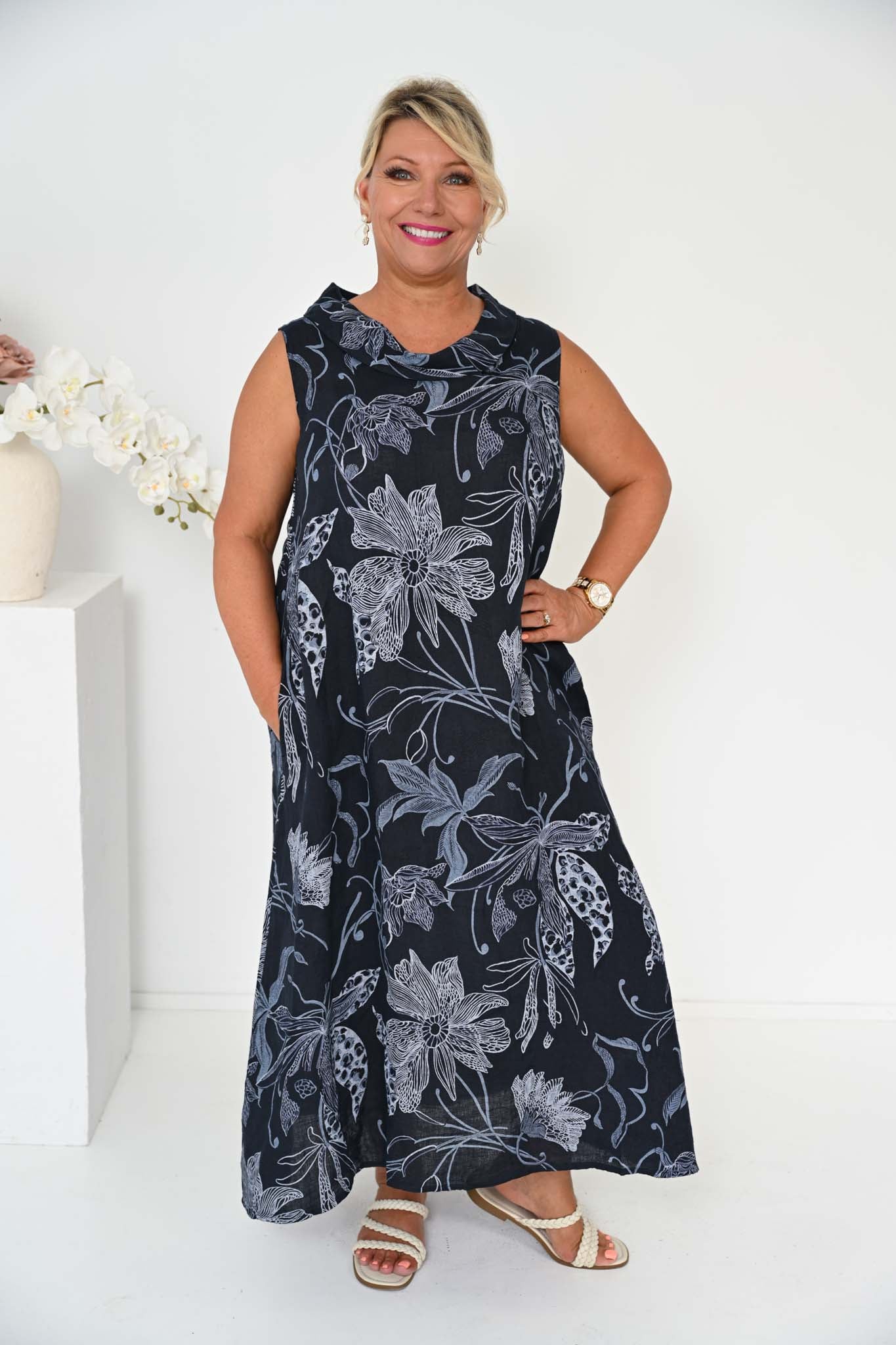 A softly draped cowl neckline introduces gentle movement to the sleeveless silhouette, while the A-line cut flows effortlessly through the body, finishing at an ankle-skimming length. Subtle shaping through a back seam enhances the fit without disrupting the clean, easy lines, and discreet side pockets add everyday functionality.