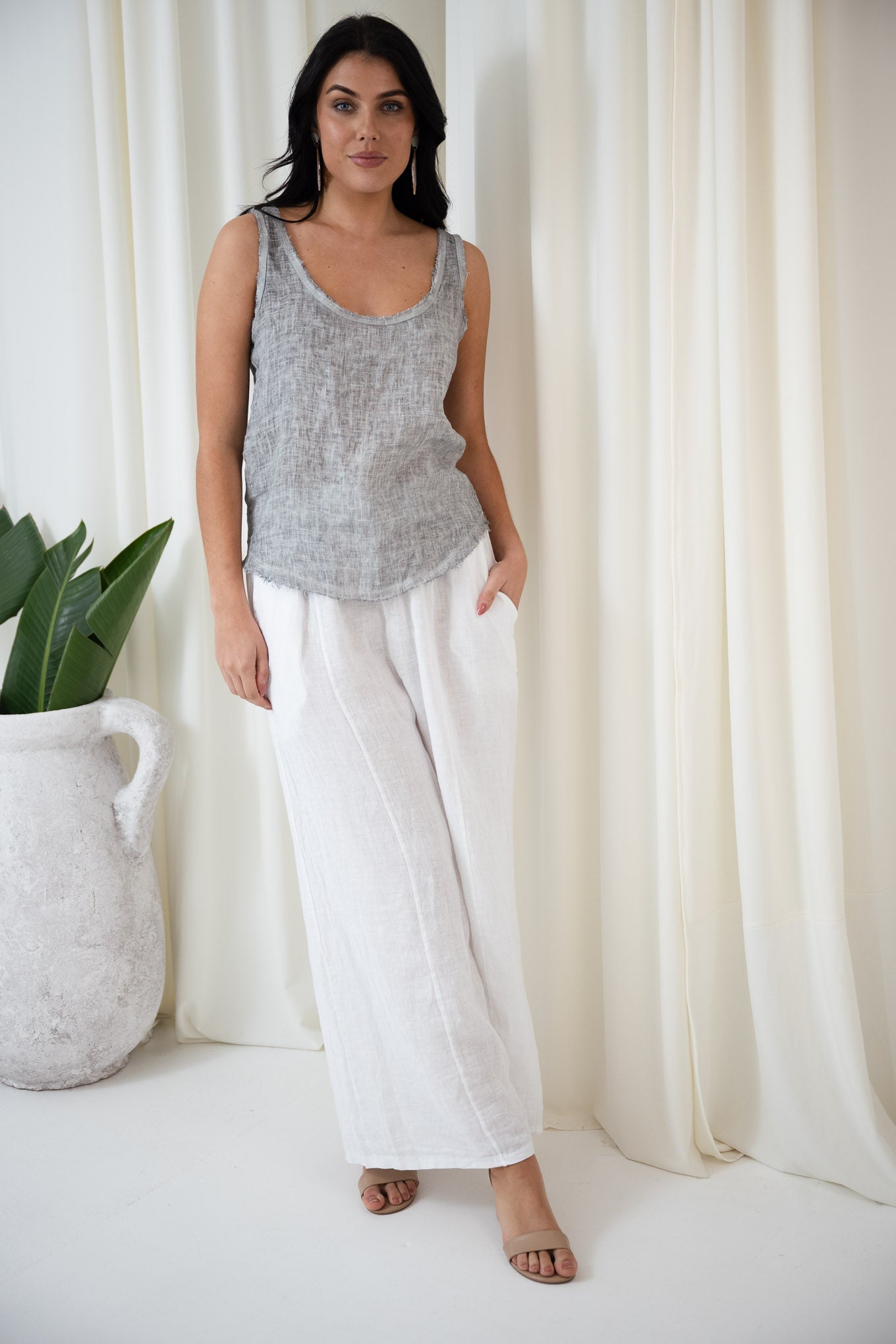 The Raw Edge Linen Cami in Grey offers a fresh, understated tone that’s ideal for warm weather. Its wide scoop neck and thick straps create a flattering silhouette, while the frayed hems add a relaxed, textured detail. Made from 100% Italian linen with a slightly gauzy finish, this cami is breathable and lightweight, perfect for balmy days.