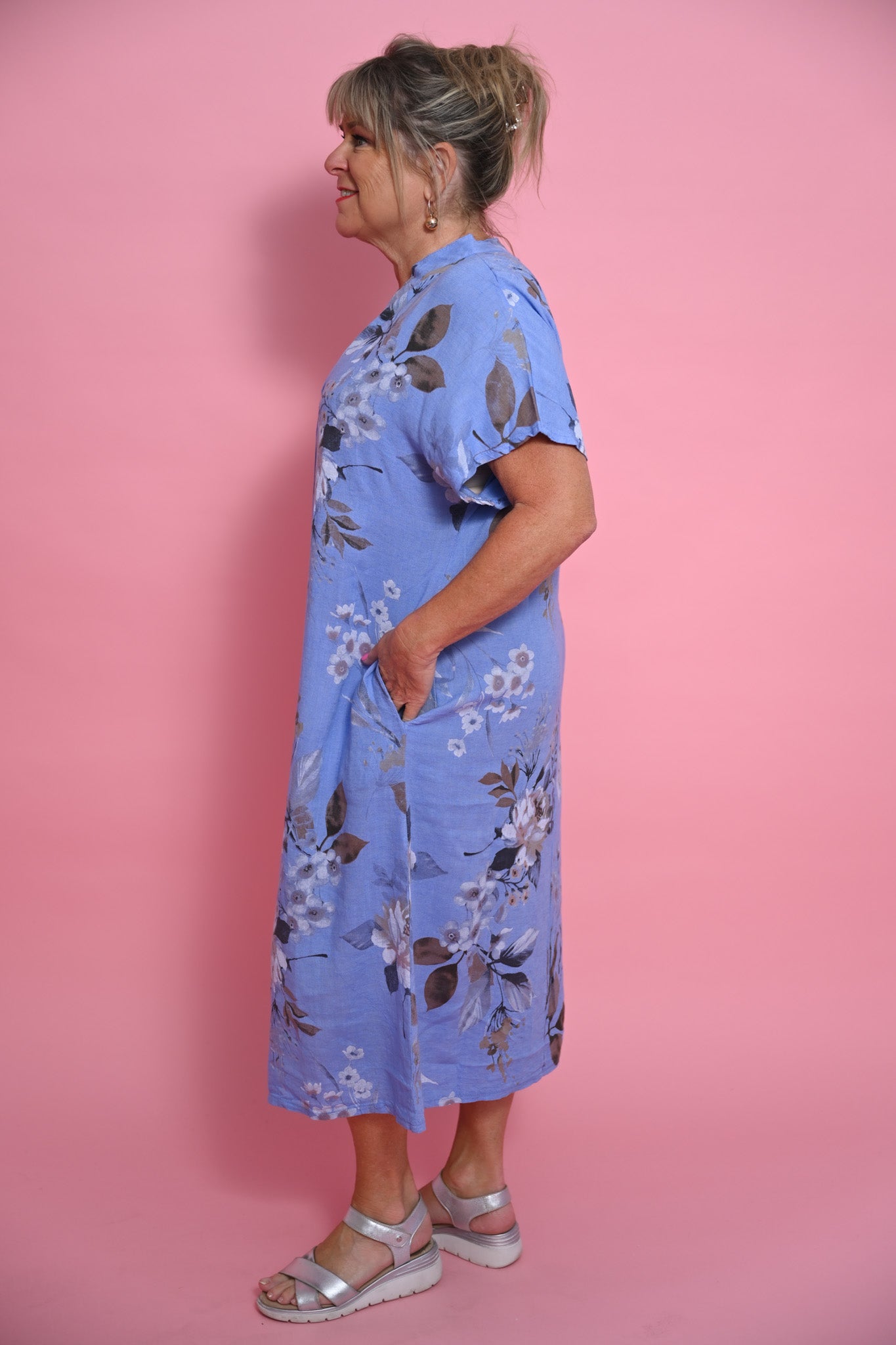 The flattering V-neckline and relaxed shift silhouette create a breezy, comfortable fit that moves with you, while short sleeves and practical side pockets add functionality to its effortless style.
