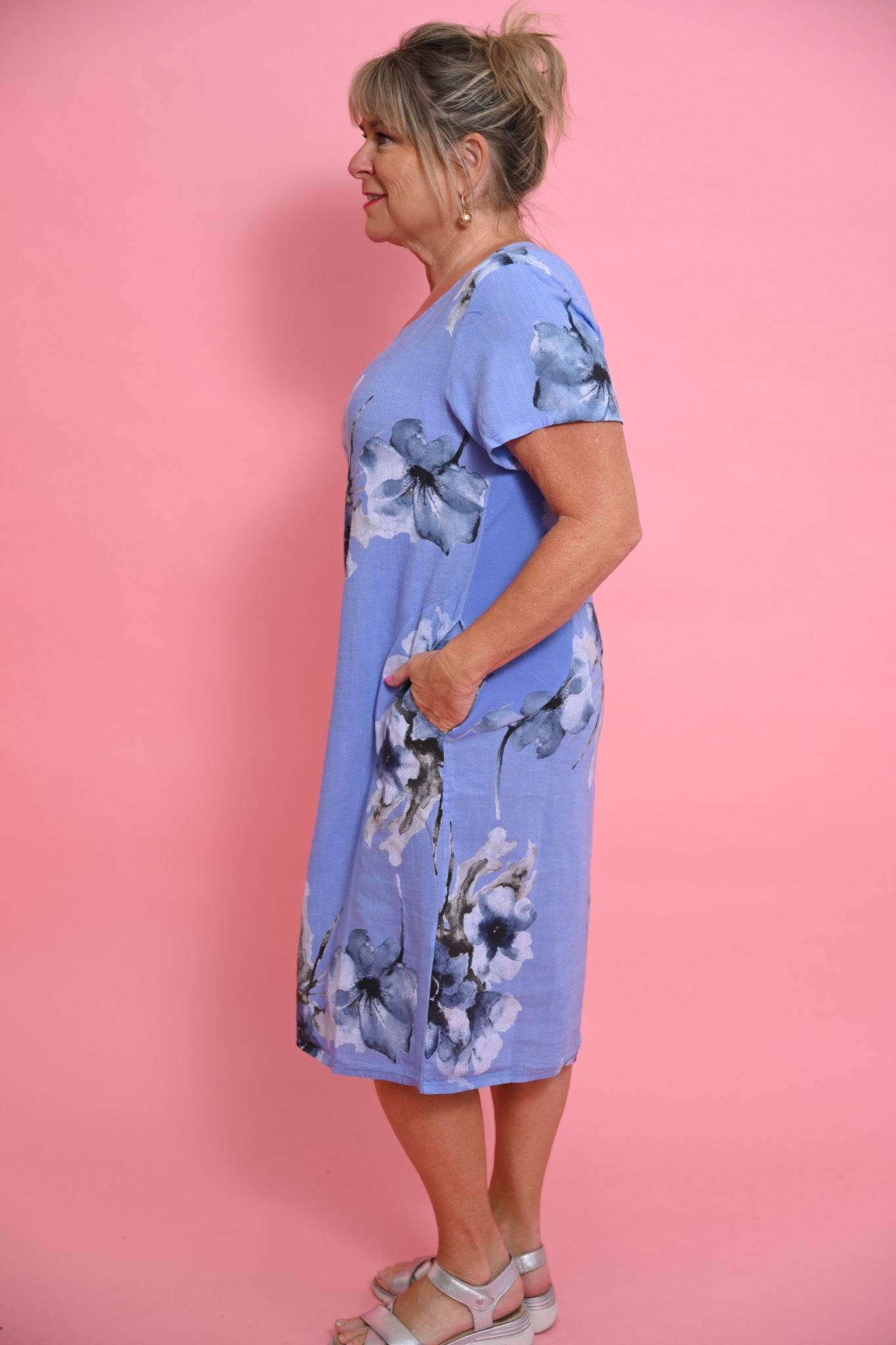 The Richmond Dress combines effortless elegance with everyday comfort. In a soft blue hue, it features a relaxed silhouette and a timeless round neckline for a flattering fit. Short sleeves add a touch of simplicity, making it easy to wear from day to night.