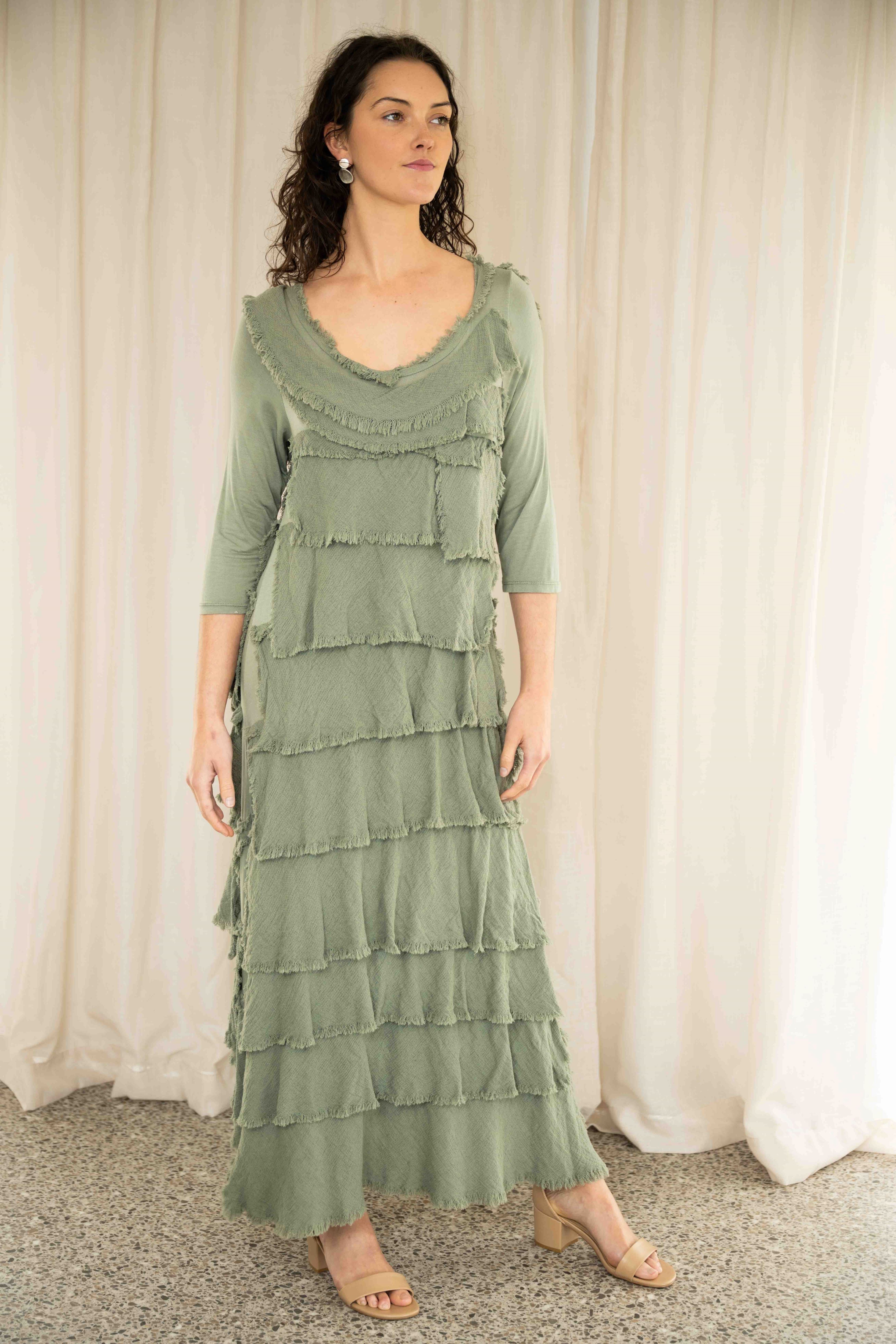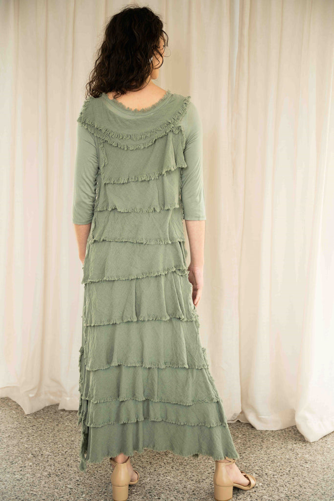 Linen and cotton ruffles are tiered across the front and back, adding movement and depth without overwhelming the shape. The side seams are left uninterrupted, creating a clean, streamlined profile that enhances the natural flow of the dress. The earthy khaki tone brings a grounded, utilitarian edge—easy to dress up or down, depending on your mood.