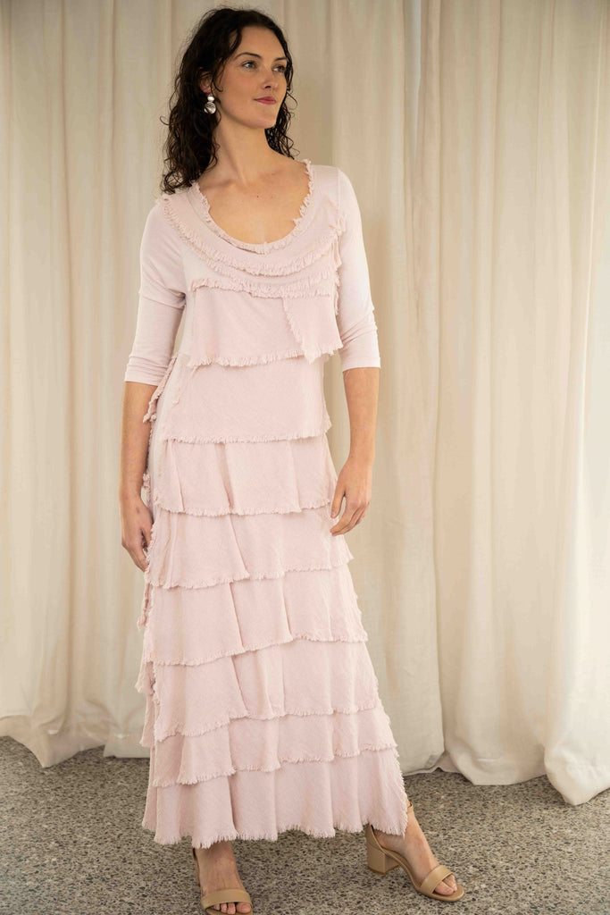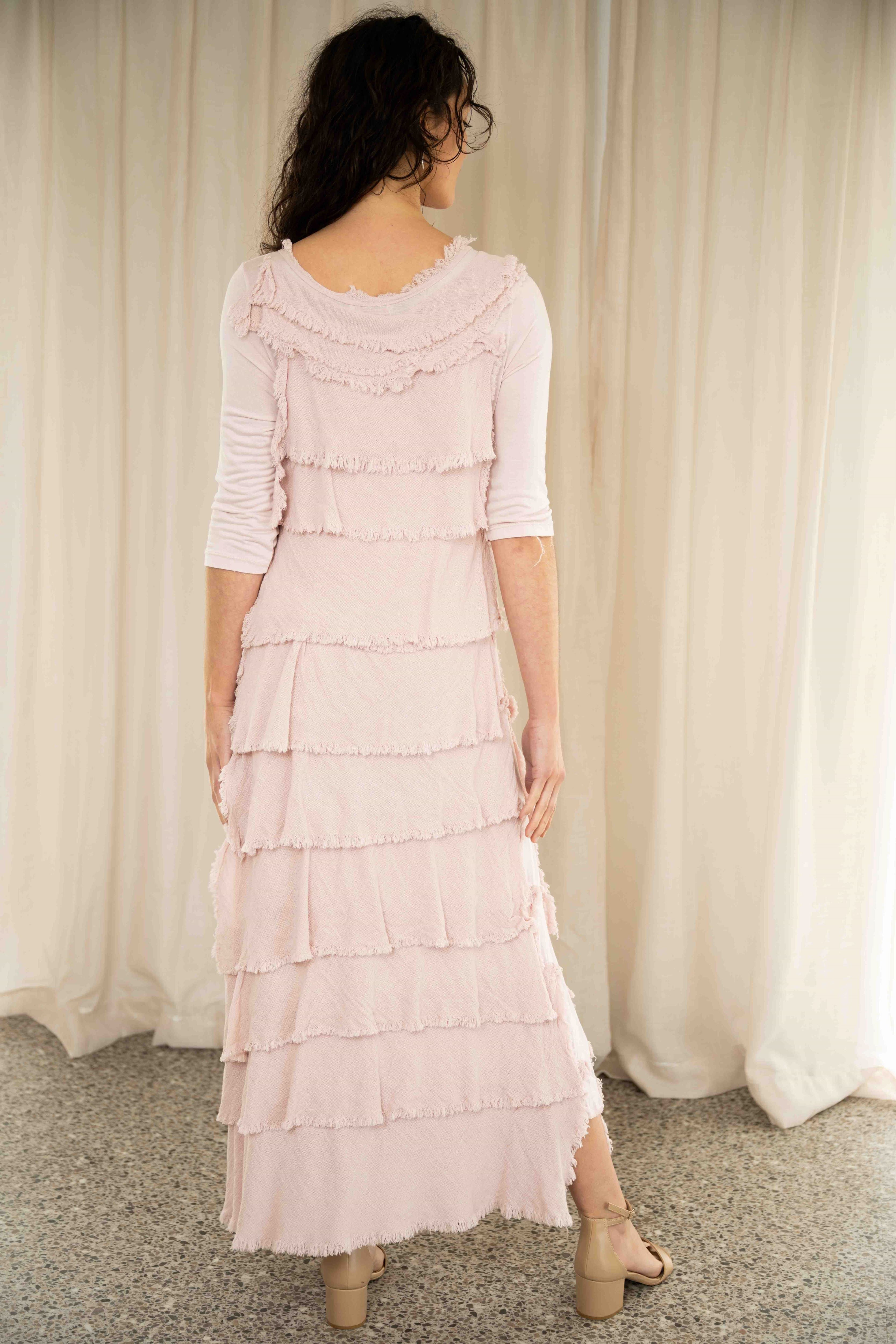 Tiered linen and cotton ruffles sweep across the front and back, creating light, flowing volume with every step. The side seams are left uninterrupted for a clean finish, letting the shape move naturally without bulk. In a soft pink hue, this dress brings a fresh, feminine energy—equally suited to laid-back days or something more dressed up.