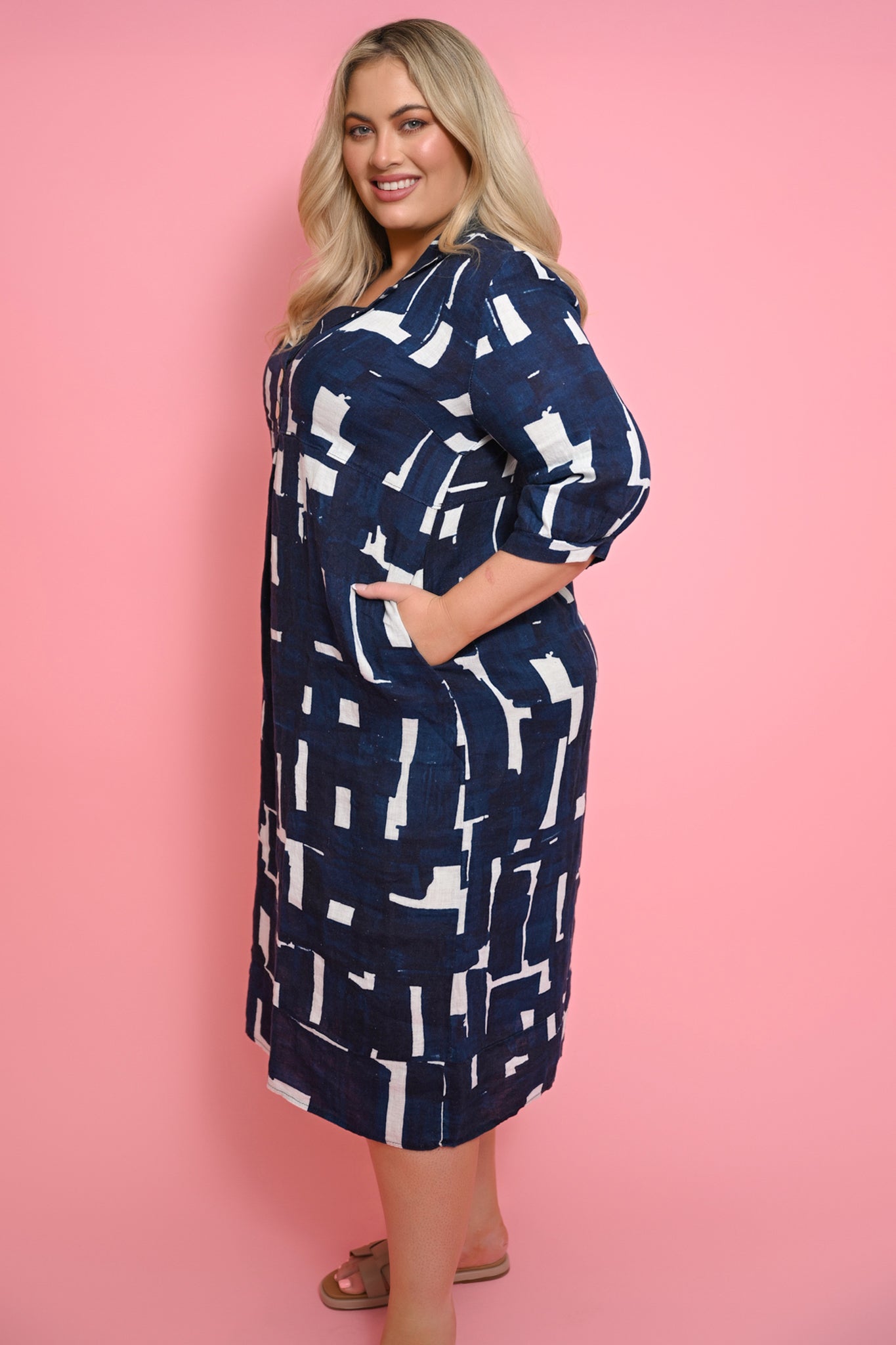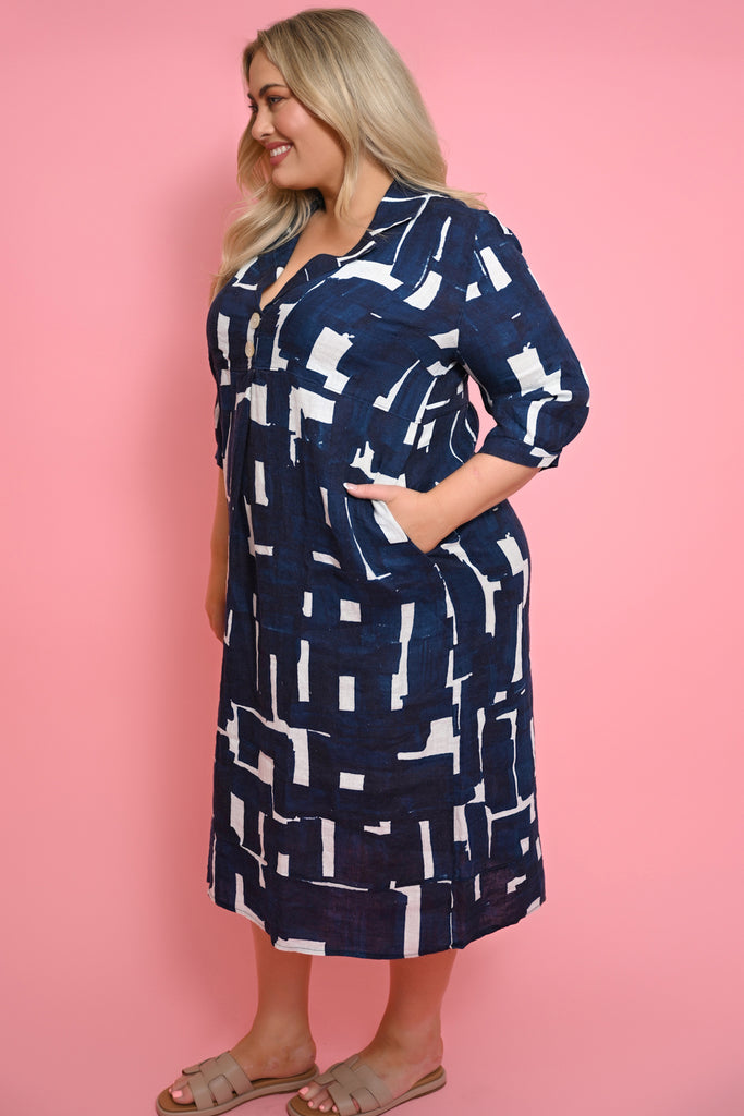 Falling to mid-calf with a wide hemline, the Saba Dress in navy is effortlessly versatile -polished enough for occasions, relaxed enough for everyday. Pair it with sandals, loafers, or a low heel for a look that feels timeless, considered, and quietly striking.
