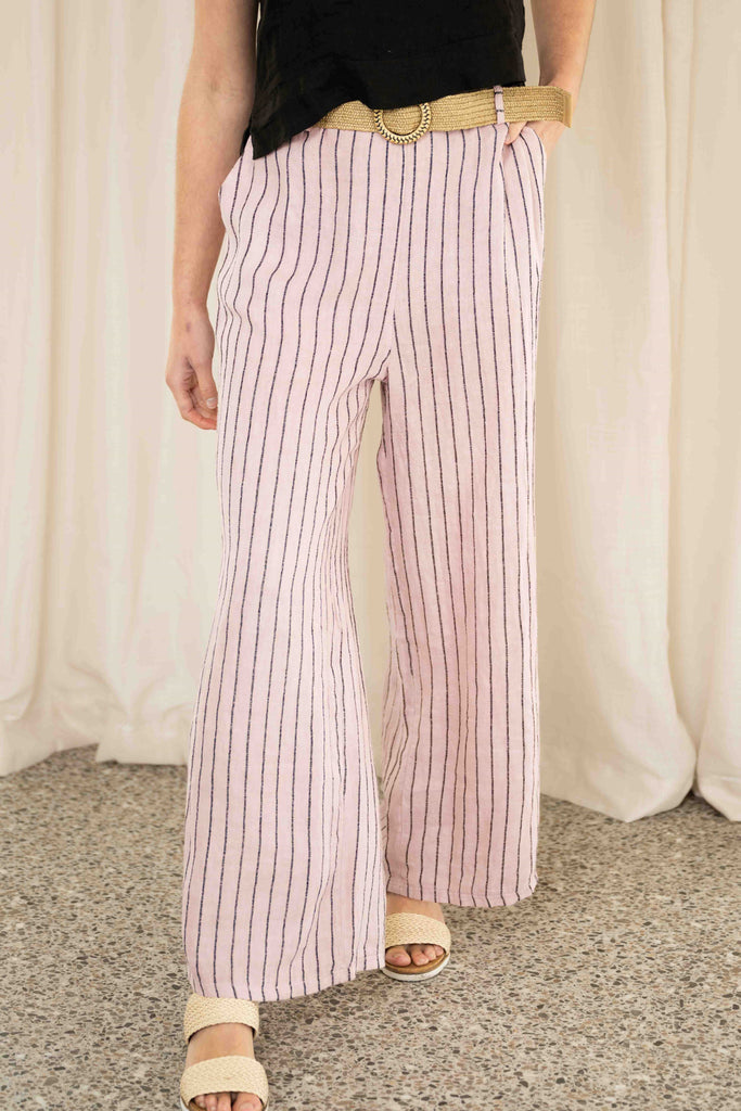 The Salvatore Pants in Pink offer a playful yet polished take on classic linen tailoring. Made from 100% Italian linen, these high-waisted pants feature a flattering paper-bag waist creating a ruffled waistline. Complete with a woven belt and shimmery buckle adding soft texture and structure. The blush-pink tone brings a touch of charm and warmth, perfect for sunny days and relaxed moments.