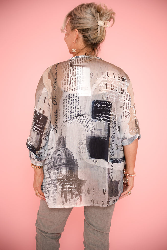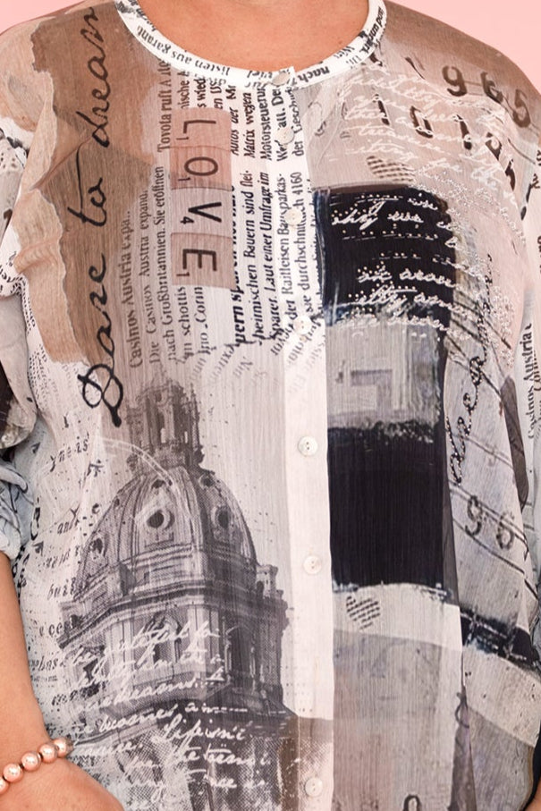 Inspired by the timeless beauty of Vatican architecture, the San Clemente top brings a sense of quiet sophistication to your wardrobe. This sheer, lightweight shirt features an artistic scatter of building illustrations and handwritten script, creating a look that's both cultured and contemporary. Designed with a round neckline and a collarless silhouette, it buttons down the front for classic appeal. The long sleeves can be rolled and secured to 3/4 length with a button-tab for added versatility. A black stretch cami is included for comfortable layering.