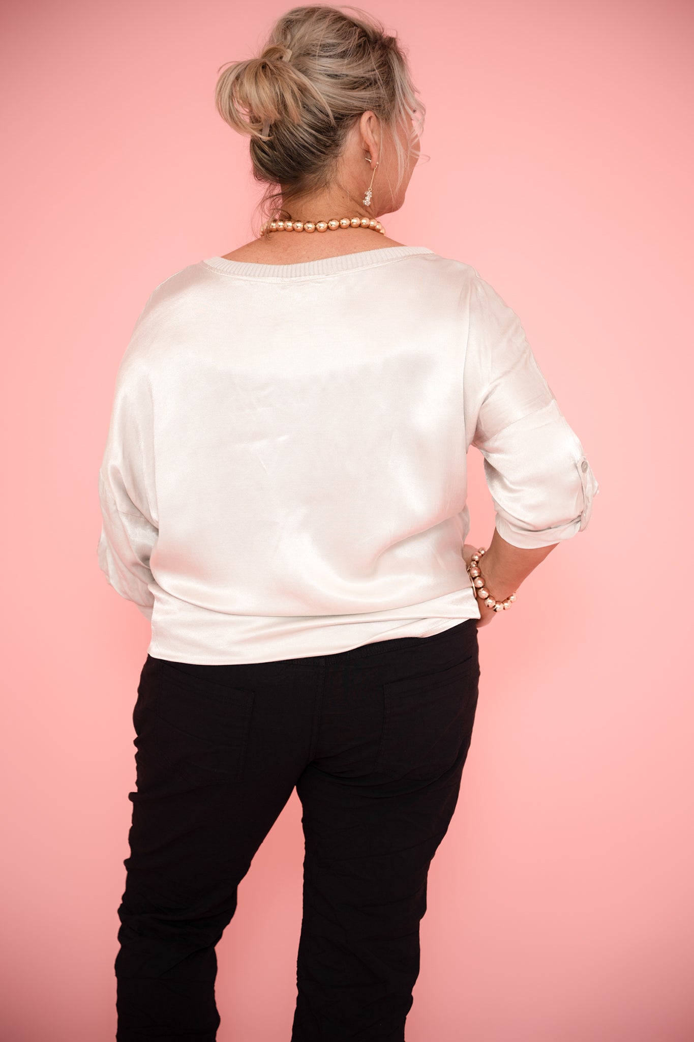 The Beige colour, and subtle satin sheen, creates a beautifully soft, feminine look that transitions easily from day to night. Styled with the coordinating Sass Satin Cargo Pants, this top makes for a coordinated, chic outfit, or wear it with denim for a more casual, laid-back vibe.