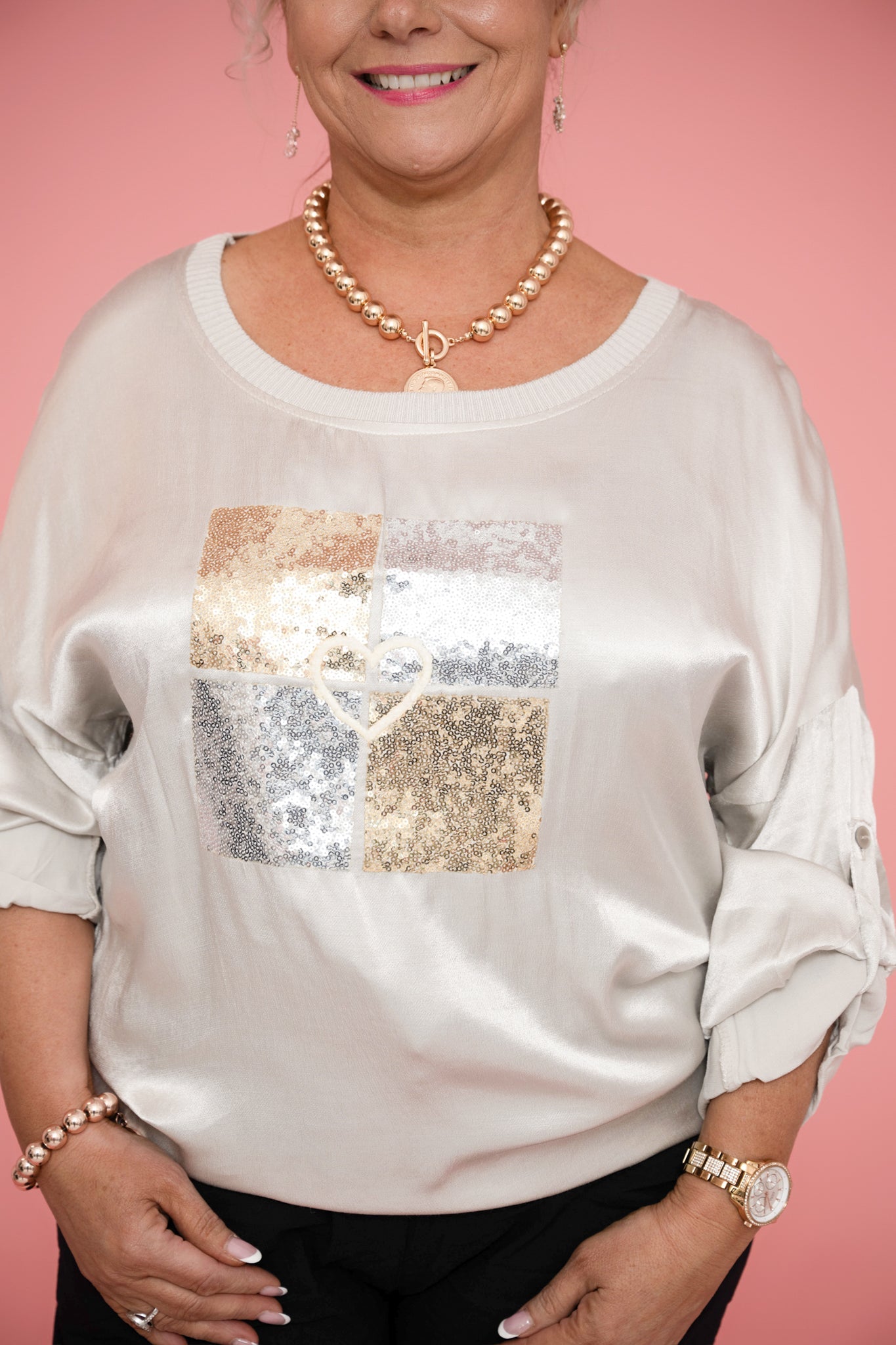 The Sass Satin Top in Beige is an effortlessly chic piece designed to elevate your wardrobe with minimal effort. The loose fit offers ultimate comfort, while the sequin embellishment on the bust adds a touch of shimmer and luxury.