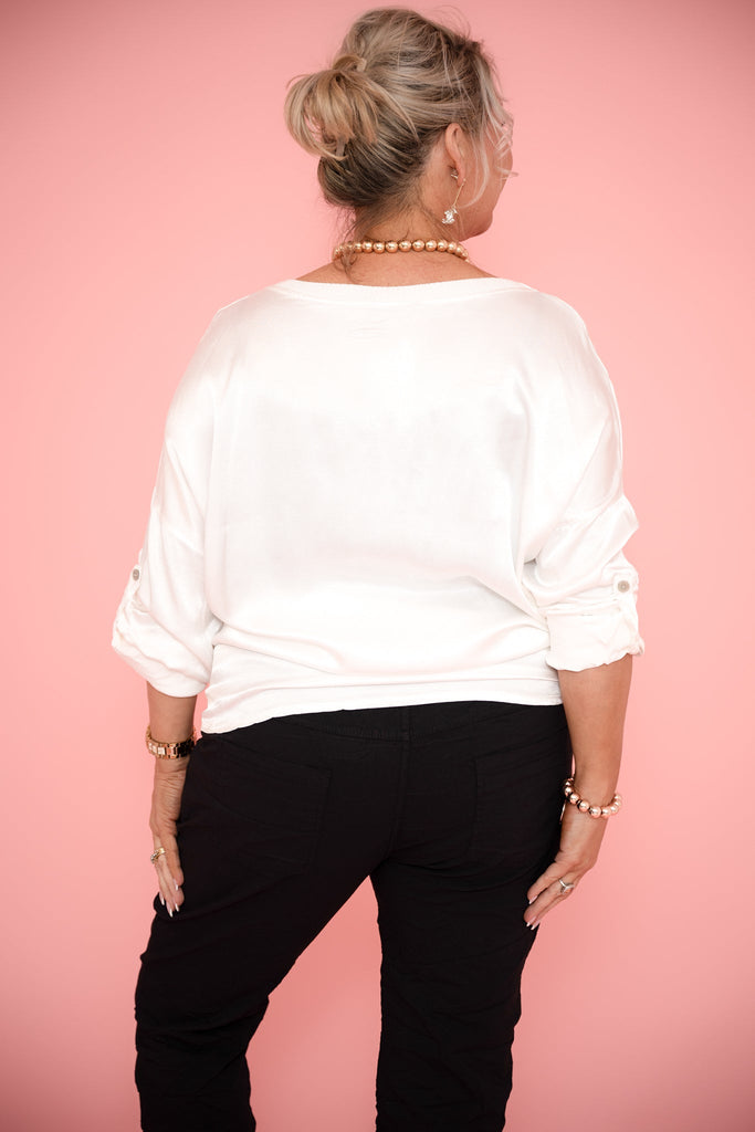 The Sass Satin Top in White is an effortlessly chic piece designed to elevate your wardrobe with minimal effort. The loose fit offers ultimate comfort, while the sequin embellishment on the bust adds a touch of shimmer and luxury.