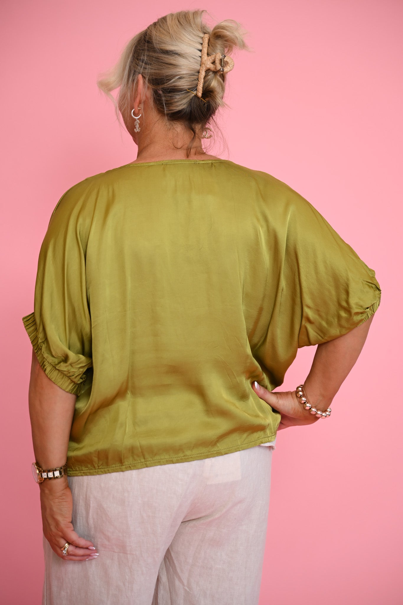 The SoHo Park Top in Khaki is where effortless elegance meets everyday versatility. Crafted from a soft satin-finish viscose, it drapes beautifully over the body, offering both comfort and sophistication. The flattering V-neckline and relaxed silhouette create an effortlessly chic look, while the short sleeves with elasticated cuffs add a subtle touch of structure.