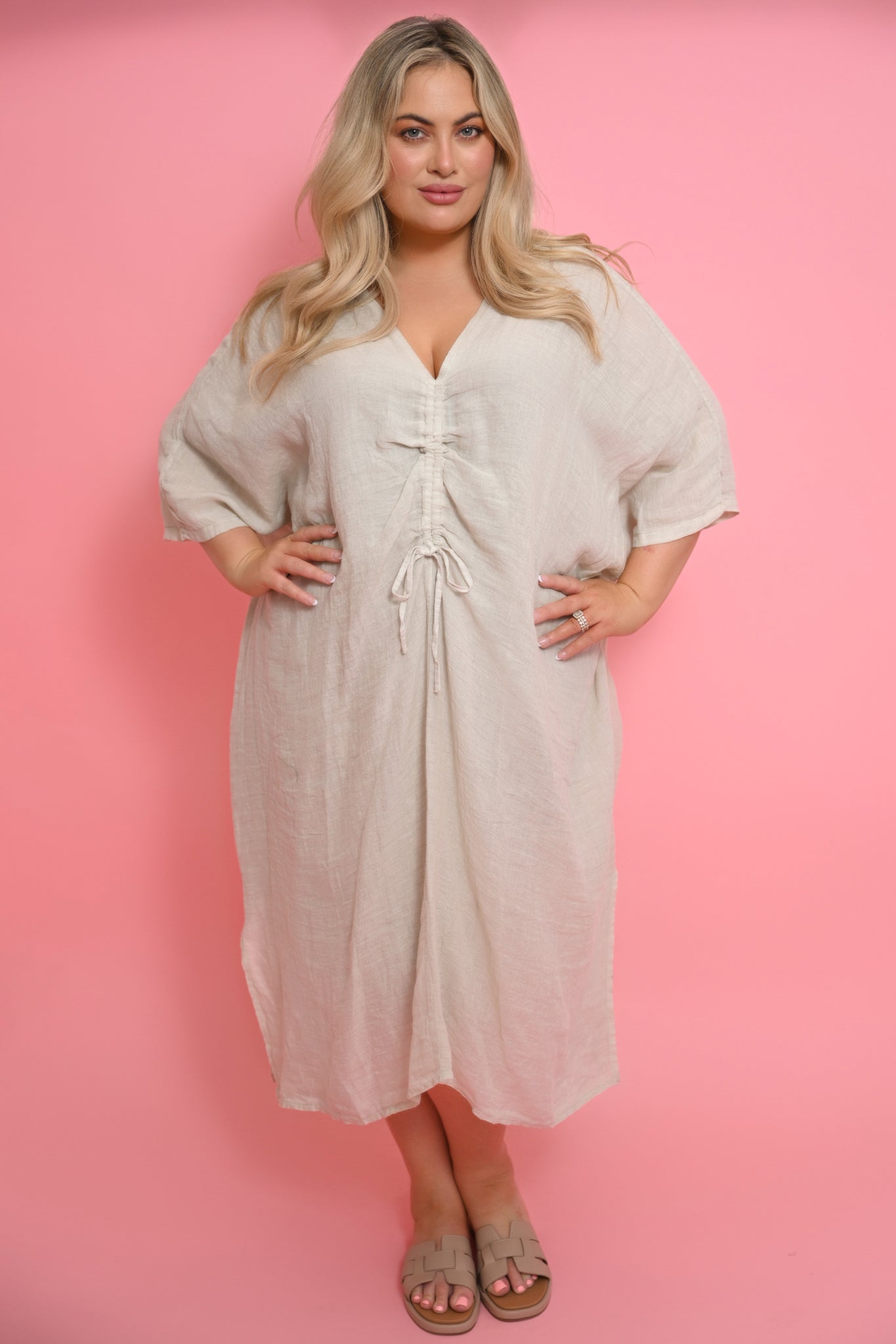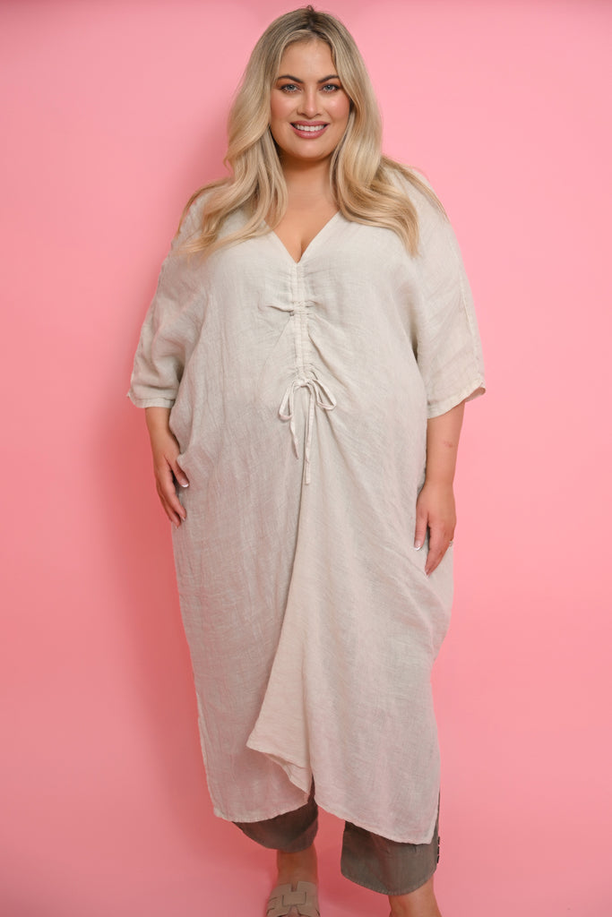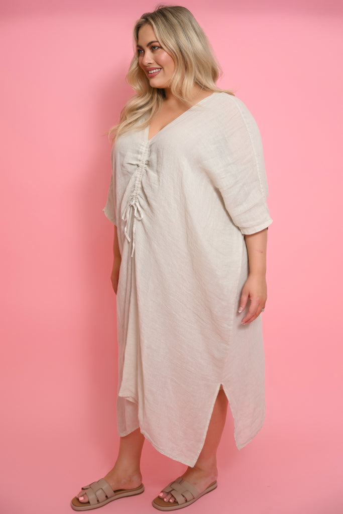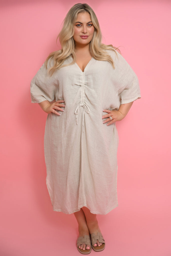 The She Dress in beige is a quiet ode to effortless sophistication. Made from 100% breathable linen, this ankle-length piece drapes gently in an oversized silhouette, offering all-day comfort with a refined edge.