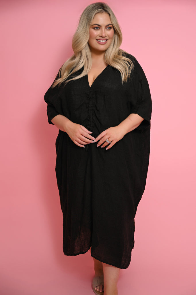 The She Dress in black is understated, timeless, and endlessly versatile. Cut from 100% linen, its ankle-length, oversized silhouette flows with ease, offering both comfort and quiet sophistication.