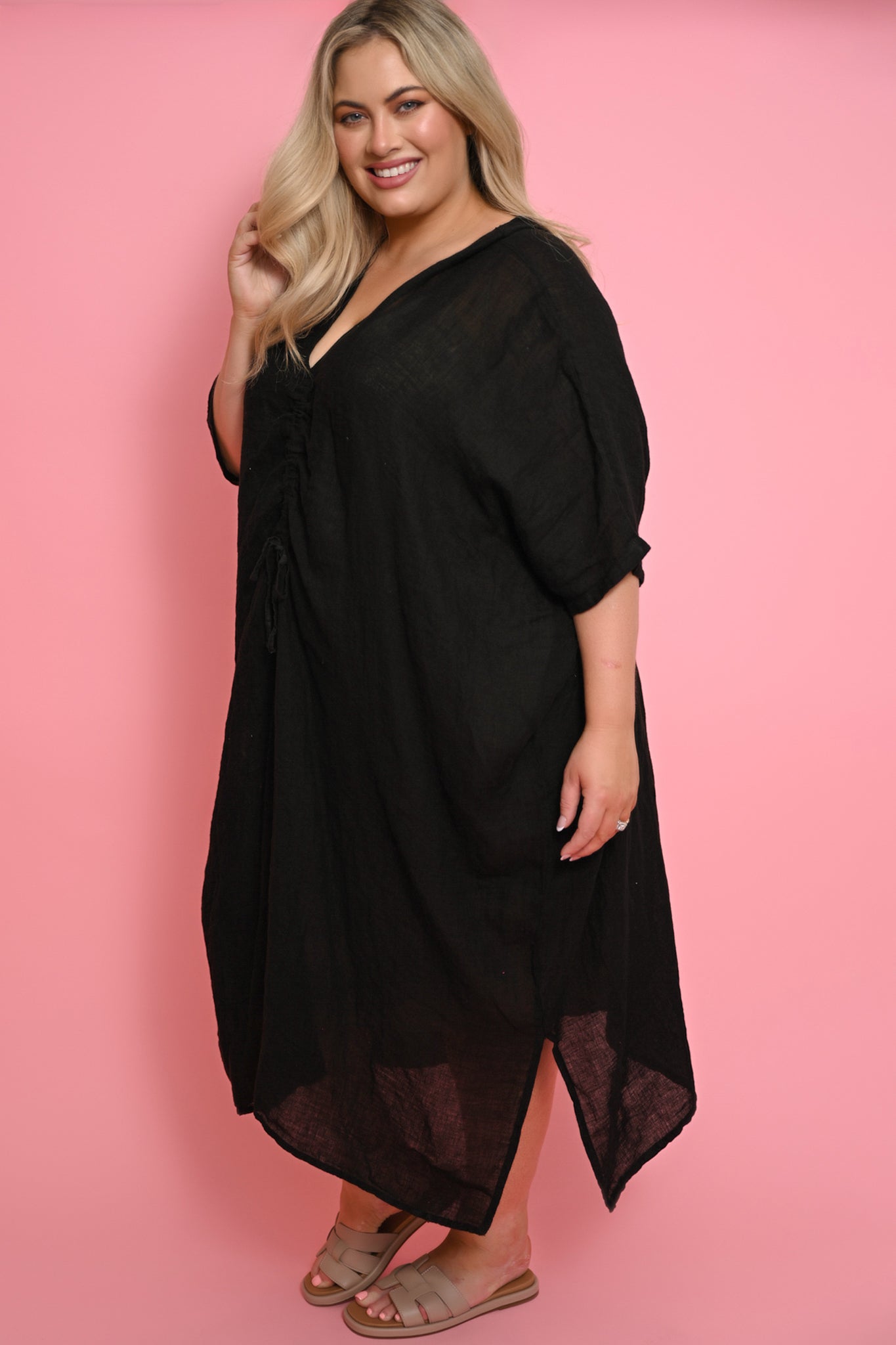 With deep V-necklines at the front and back, batwing sleeves, and a gently ruched drawstring that gathers just below the bust, it’s a piece that flatters without trying too hard. Side splits add movement and a subtle hint of drama.