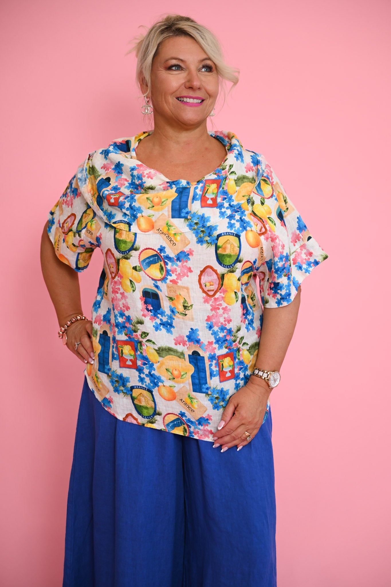 The sleeves are finished with a wide hem, adding structure and sophistication. Adorned with the lively Sicily print—fresh florals and citrus motifs in bright yellows, blues, and pinks—this top brings a joyful, Mediterranean-inspired touch to any look.