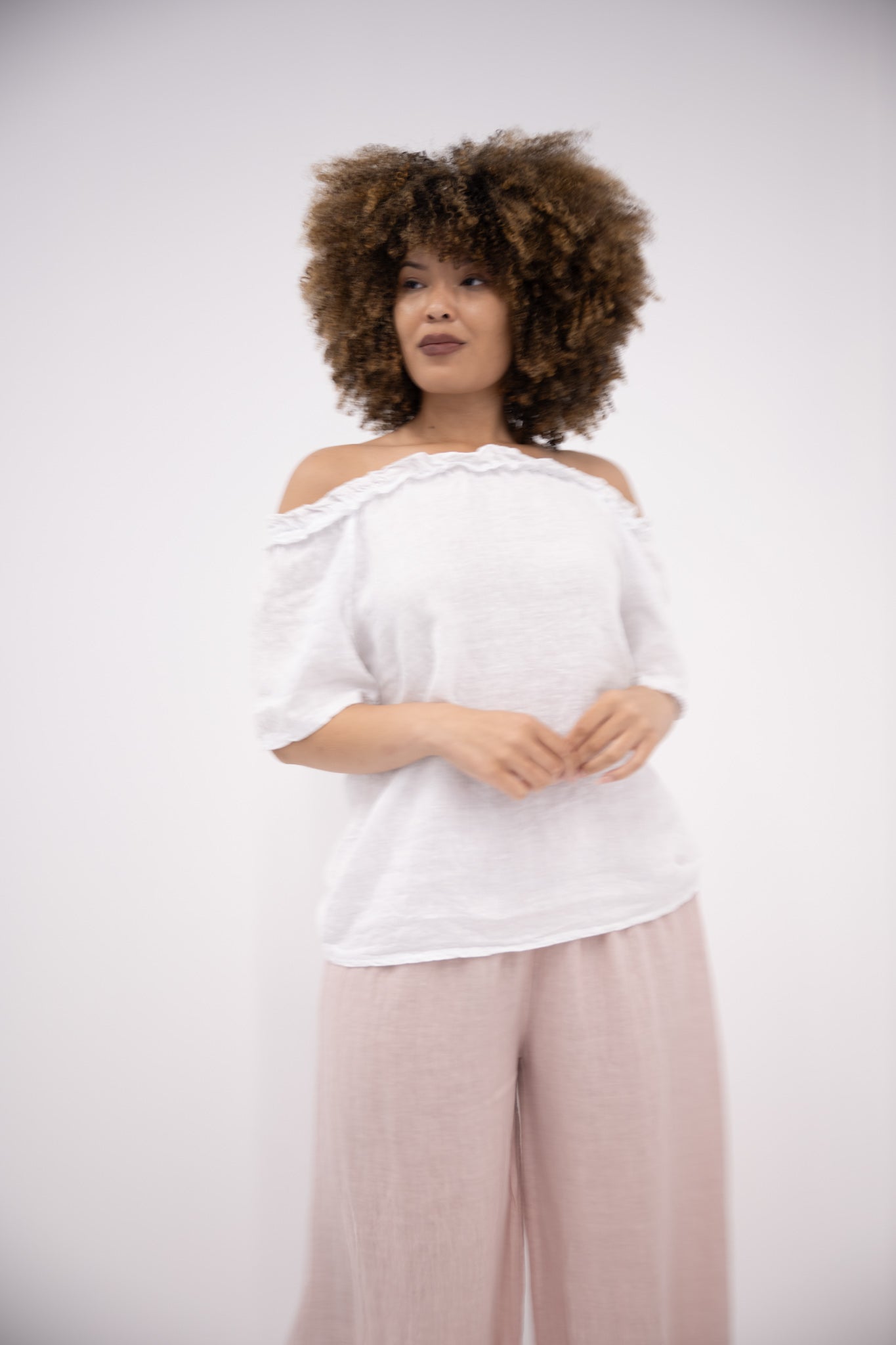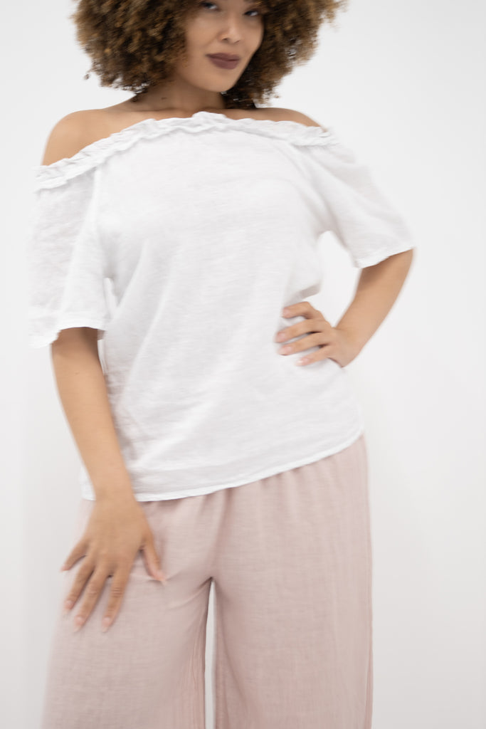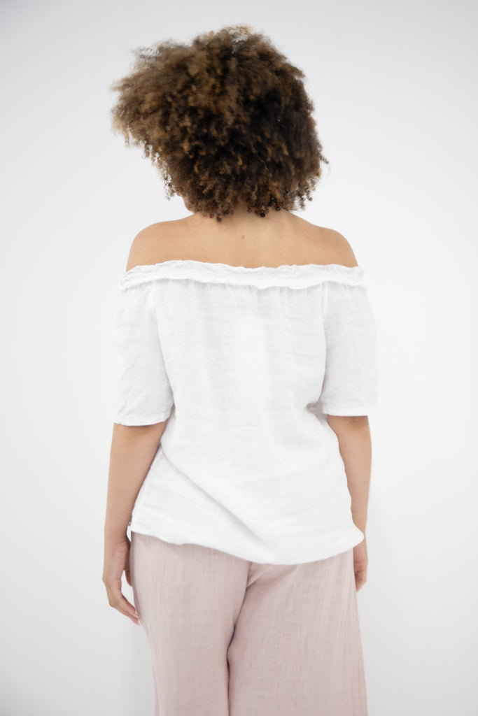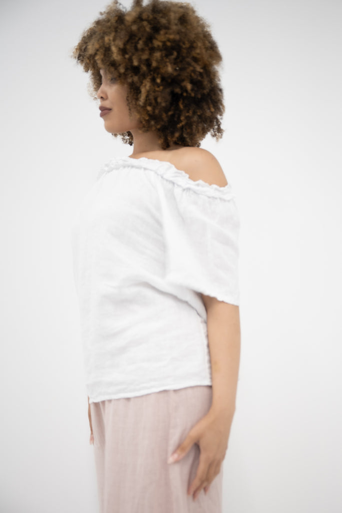 In fresh white, this top brings a clean, timeless feel to any outfit—perfect for pairing with linen pants, denim, or skirts. Whether worn loose or tucked in, the Sierra Top is a simple yet elegant staple made to suit any occasion with relaxed confidence.