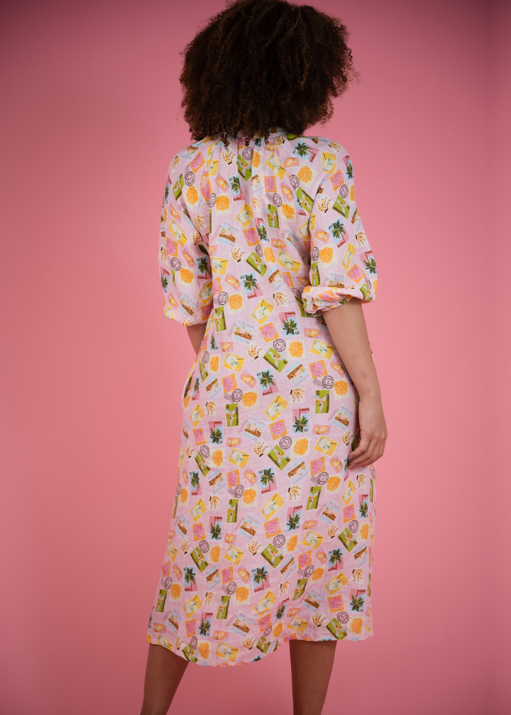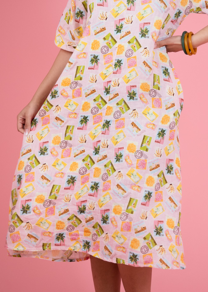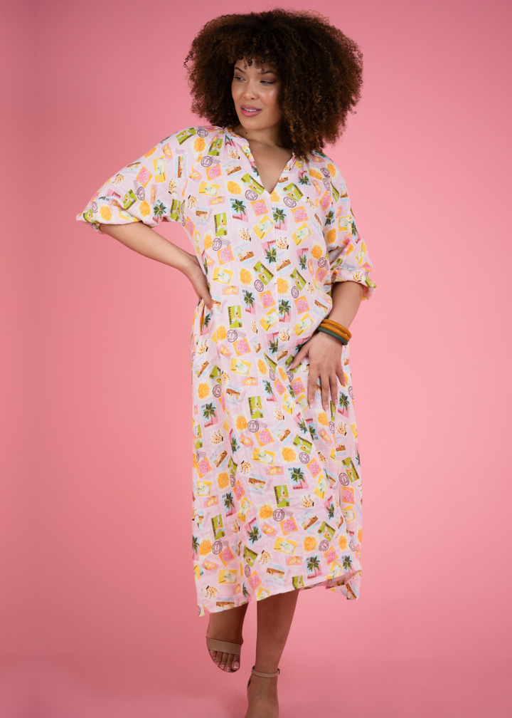 Transport yourself to far-off lands with the Postcards From Paradise Dress, a boho-inspired piece that captures the essence of wanderlust. Adorned with an all-over stamp print, this dress is your perfect companion for any exotic adventure on the horizon.