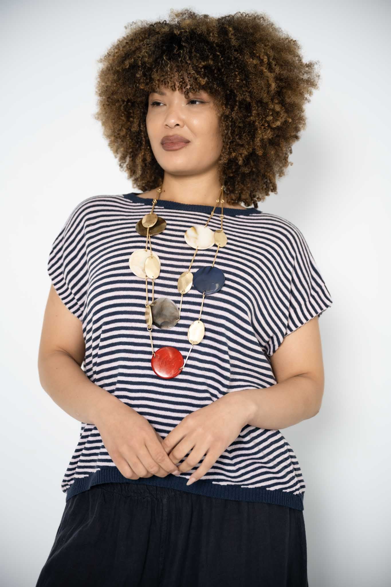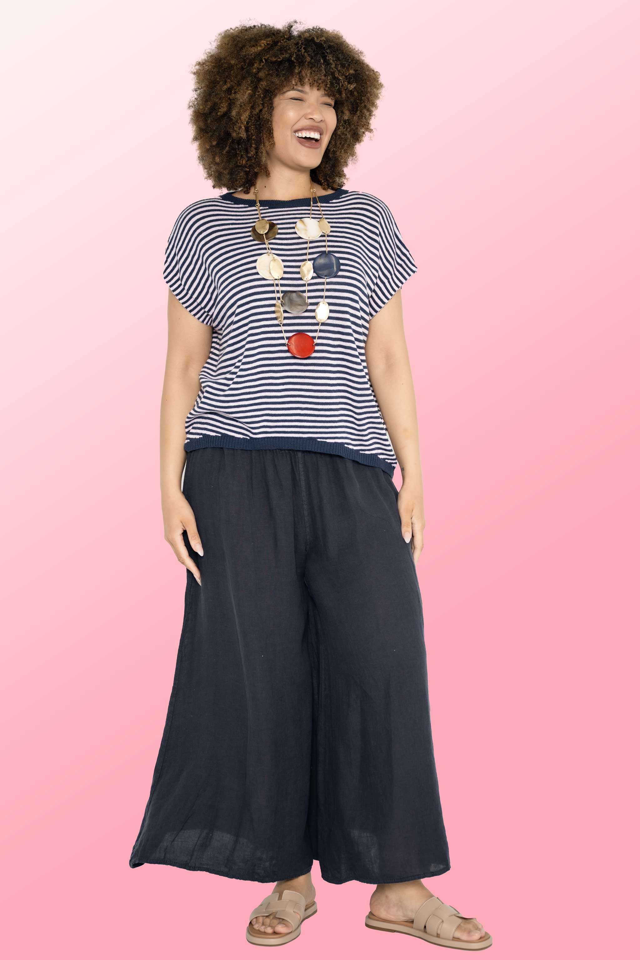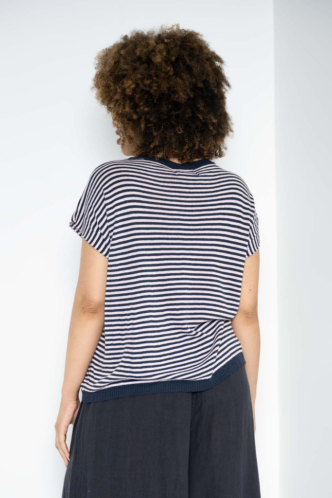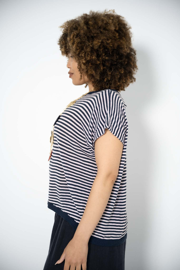 The Stripe Knit is a playful blend of structure and softness, designed to add a pop of colour and comfort to your everyday wardrobe. Featuring bold vertical stripes in pink and navy, this light knit is as eye-catching as it is easy to wear.