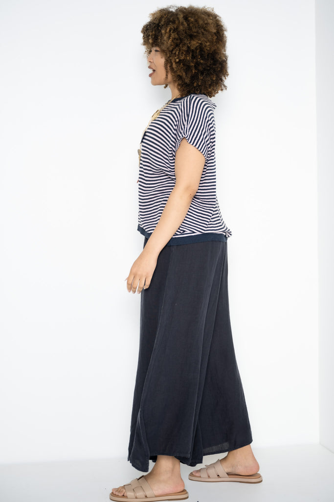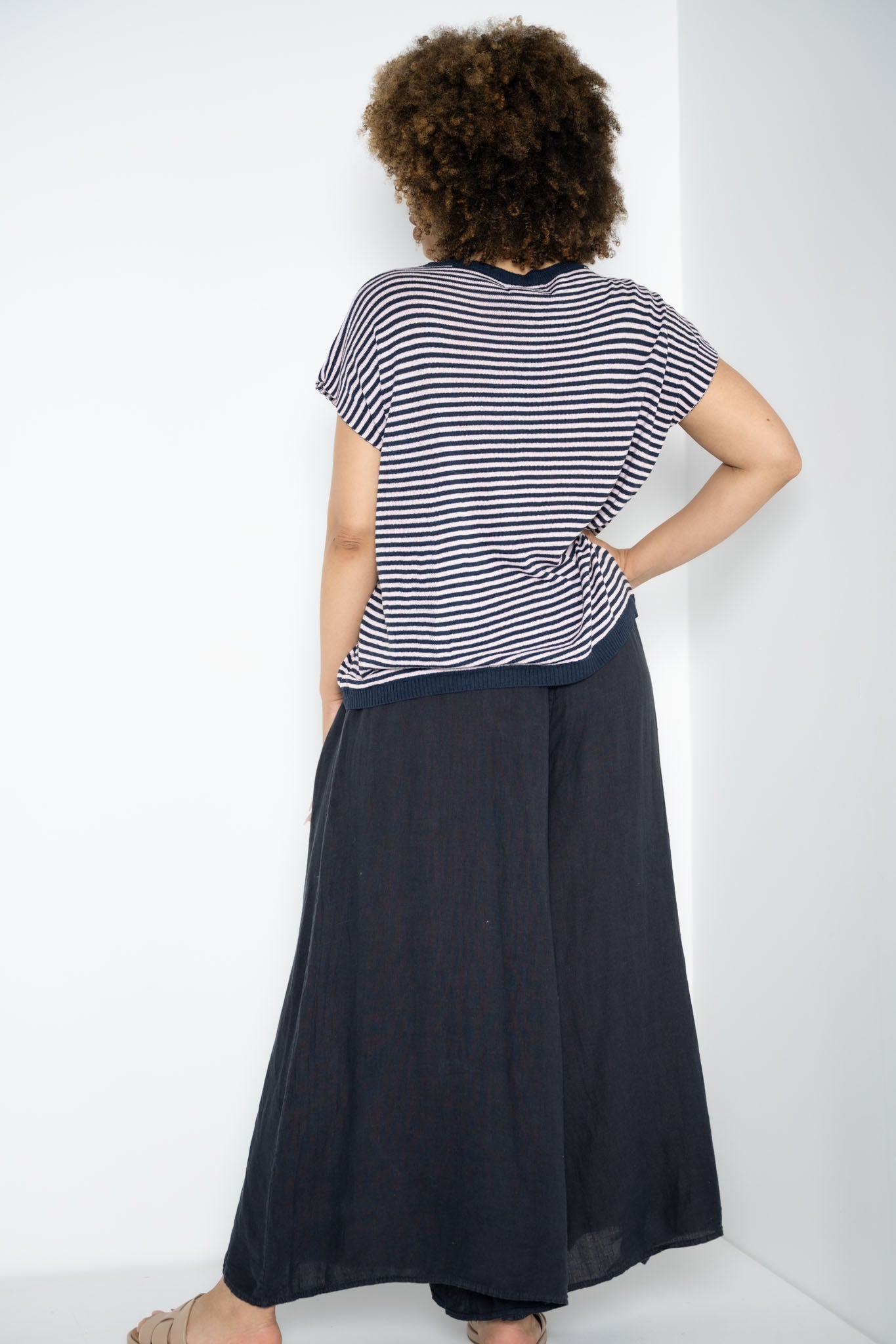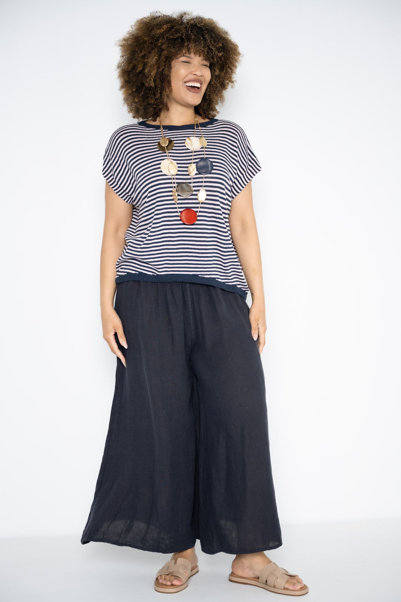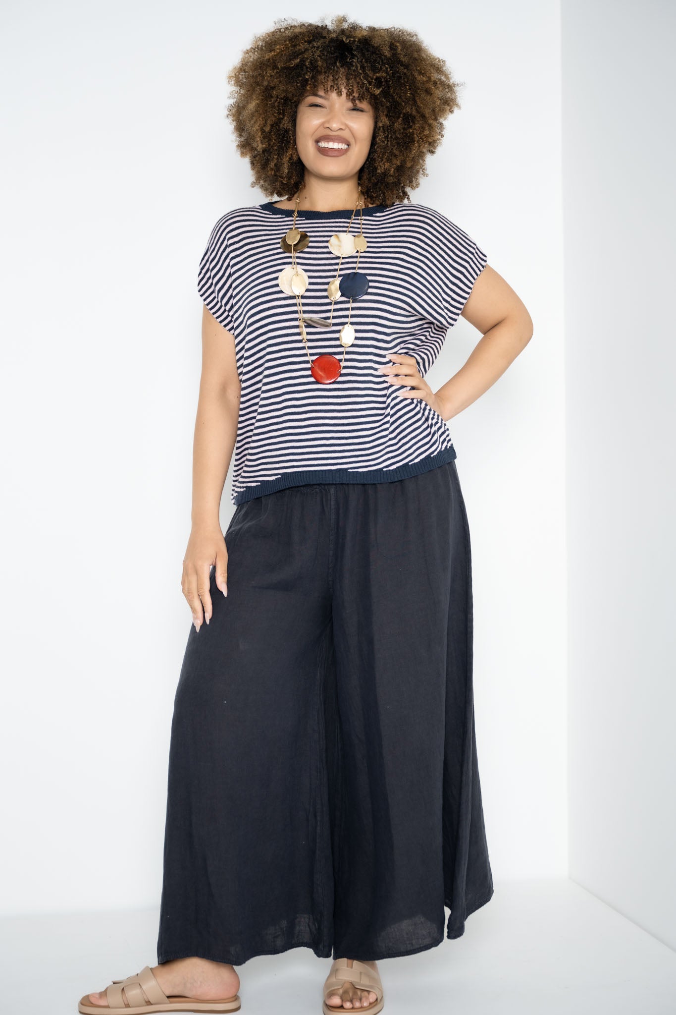 The Stripe Knit is a playful blend of structure and softness, designed to add a pop of colour and comfort to your everyday wardrobe. Featuring bold vertical stripes in pink and navy, this light knit is as eye-catching as it is easy to wear.