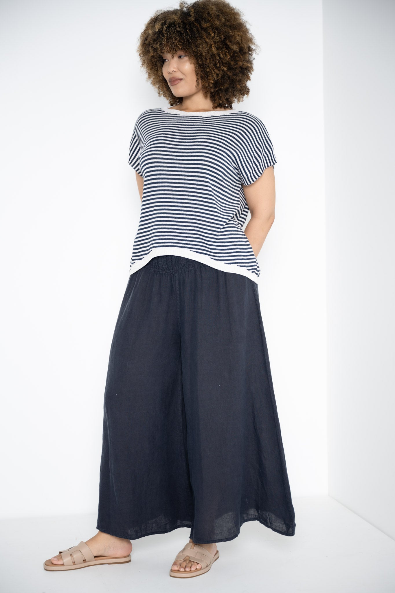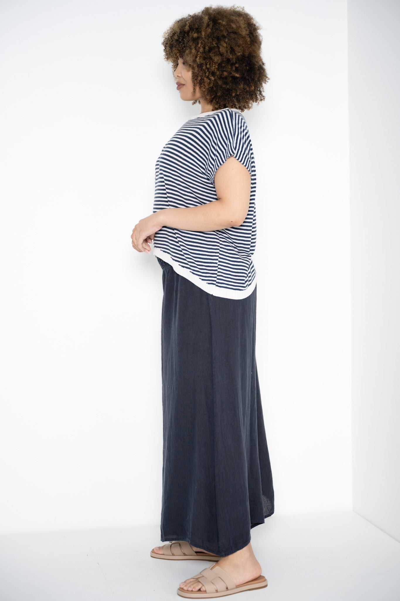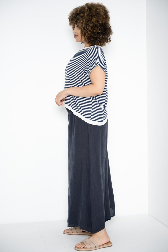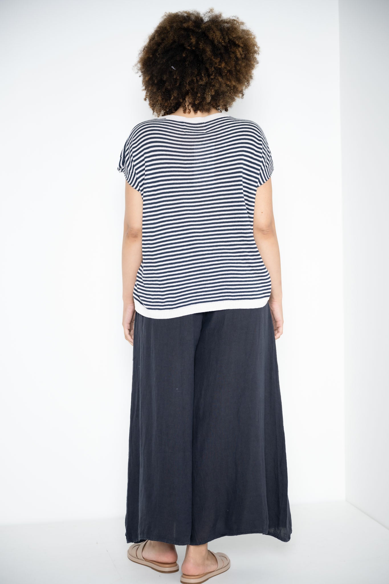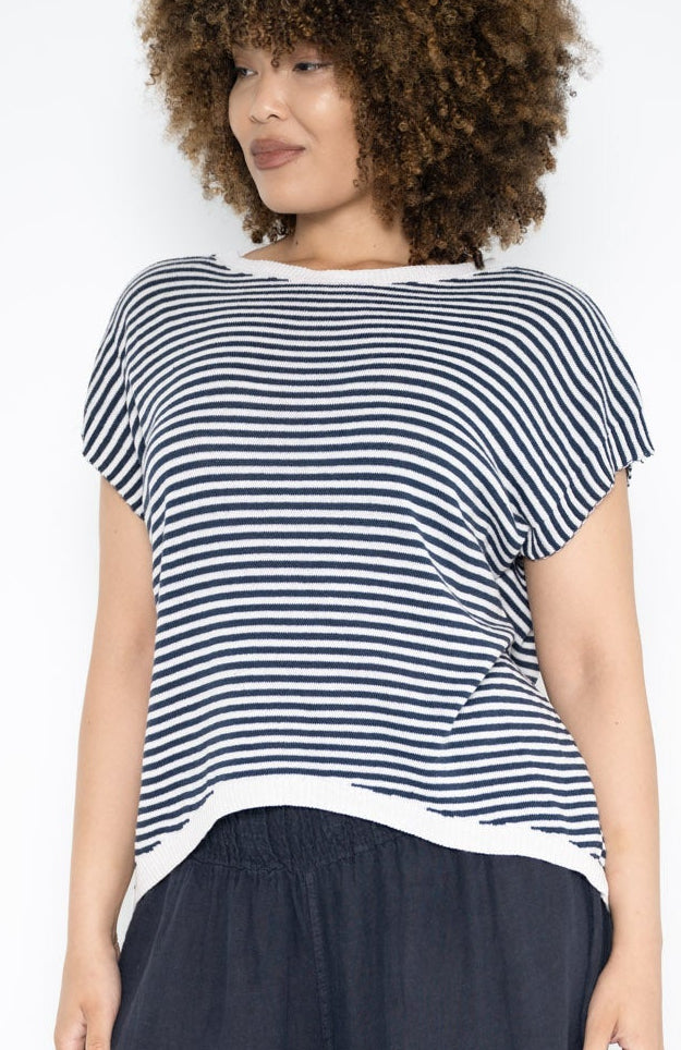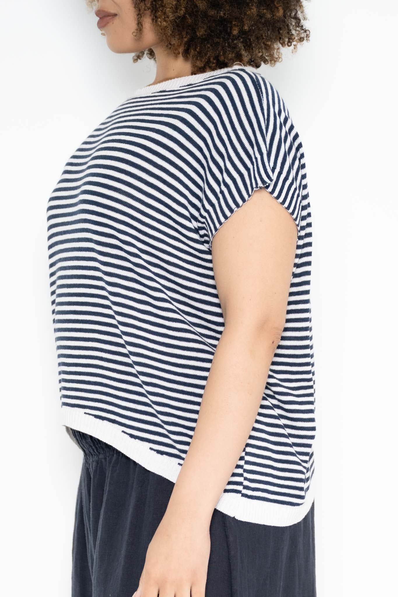 The Stripe Knit in white and navy brings a fresh, nautical-inspired twist to a modern silhouette. With clean vertical stripes and a relaxed, boxy fit, it’s a light, breathable piece made for easy styling and everyday comfort.