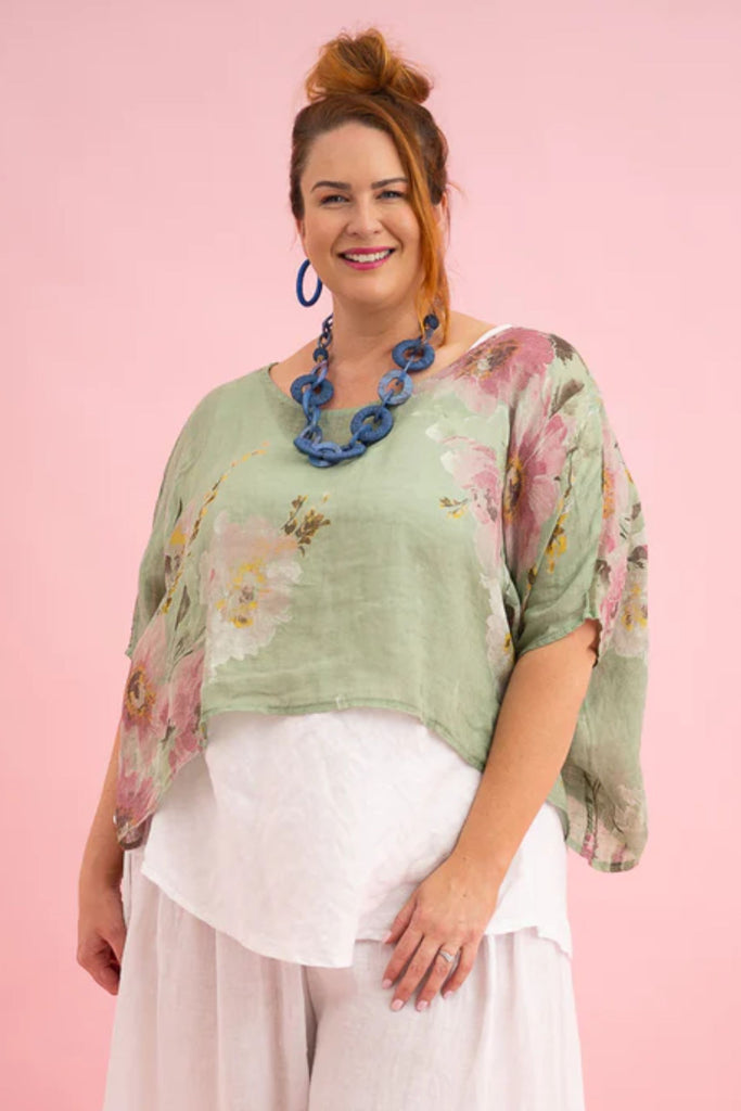 Whether worn with linen culottes or styled casually with denim, the Tia Top in Greenbay offers an effortless sense of style—elevated by its soft colour, airy shape, and delicate floral details that quietly catch the eye.
