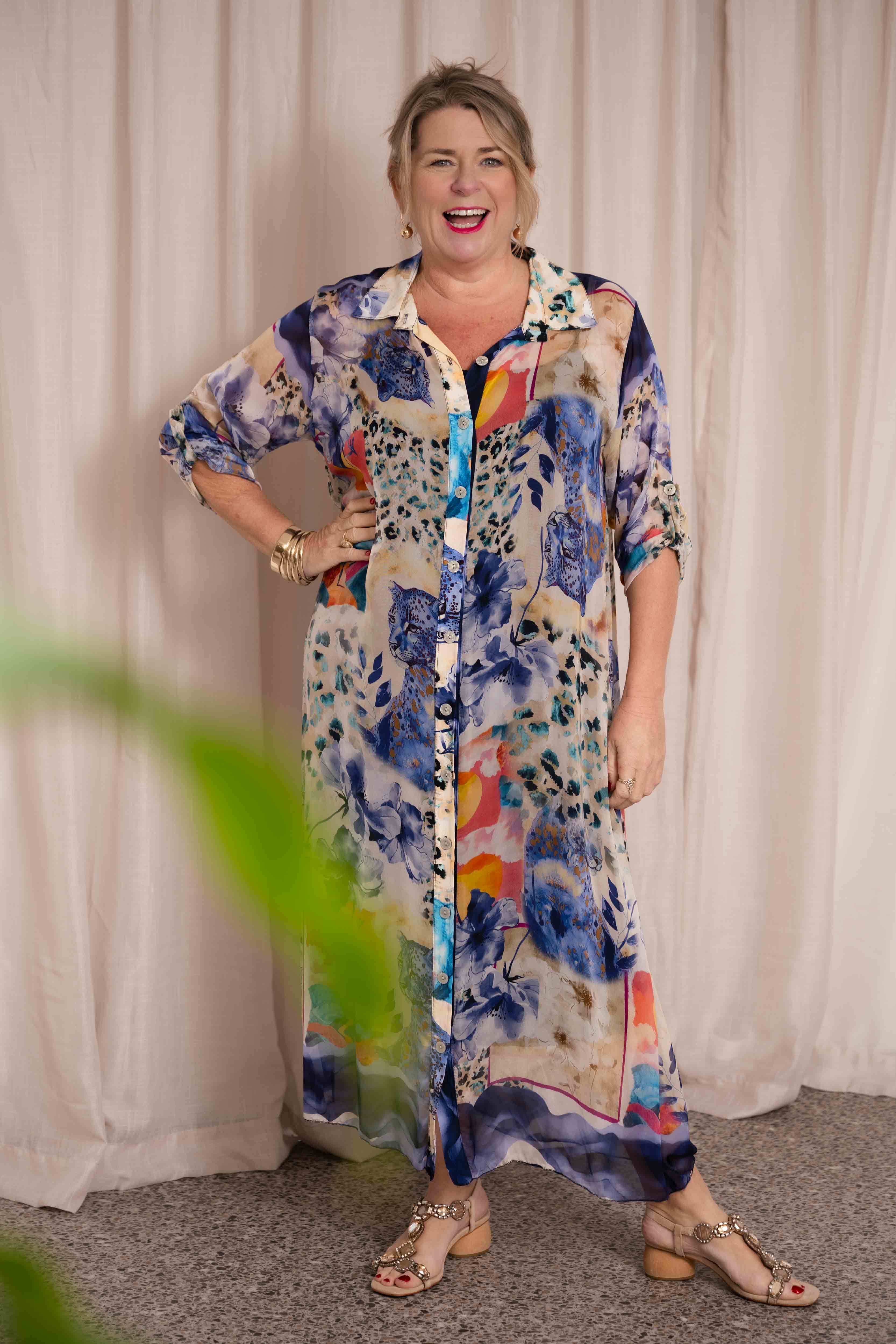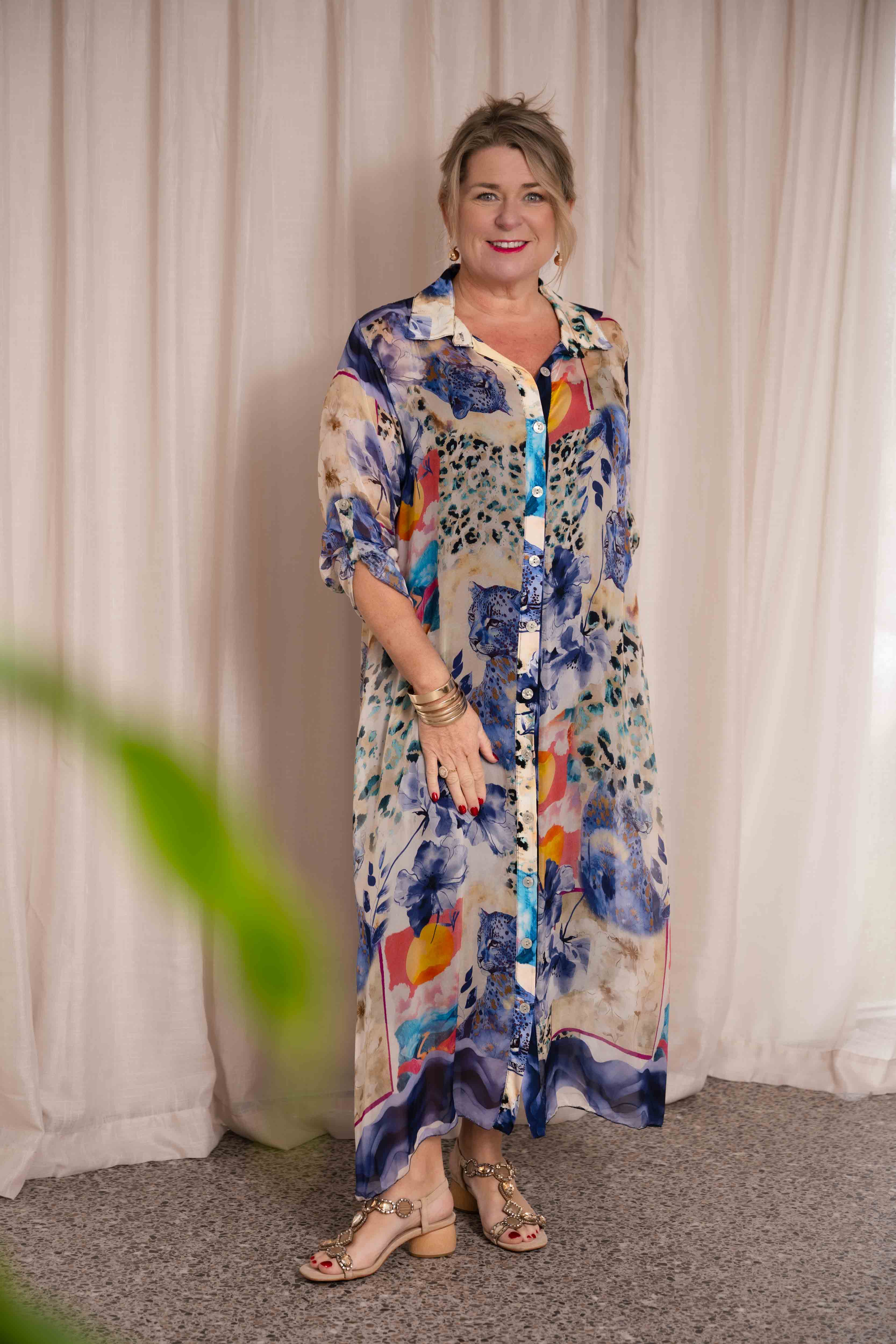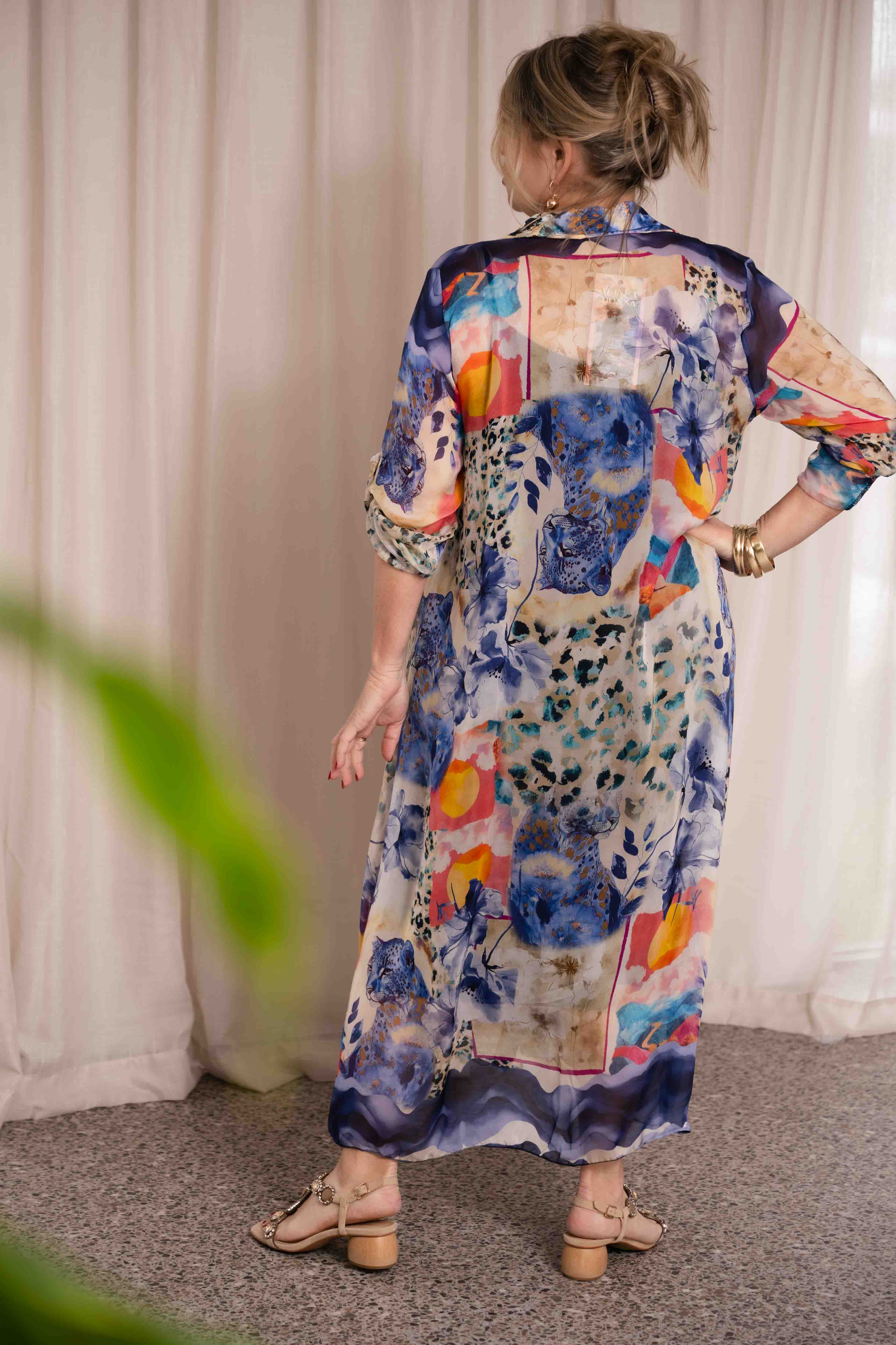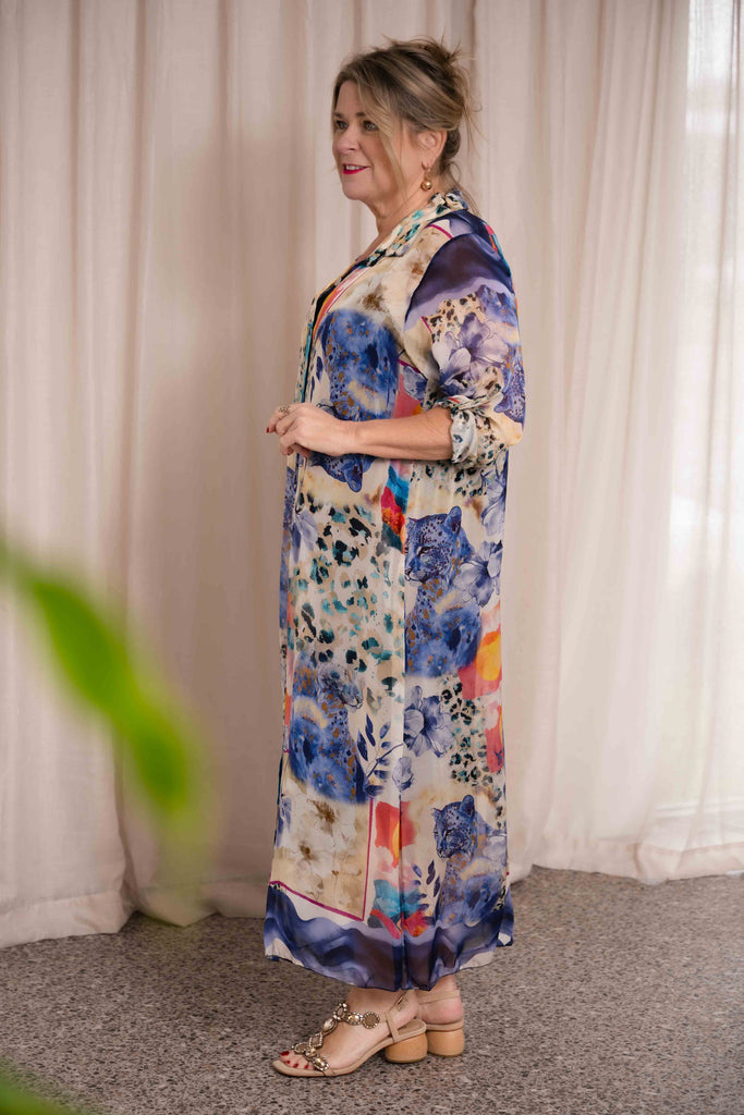The Tigress Dress in Navy is a study in quiet boldness. With a deep, moody base and a layered mix of subtle patterns, it weaves together soft florals and faint hints of tiger print in warm tones of yellow, burnt orange, and red. The result is a print that feels both grounded and untamed — striking without ever being loud.
