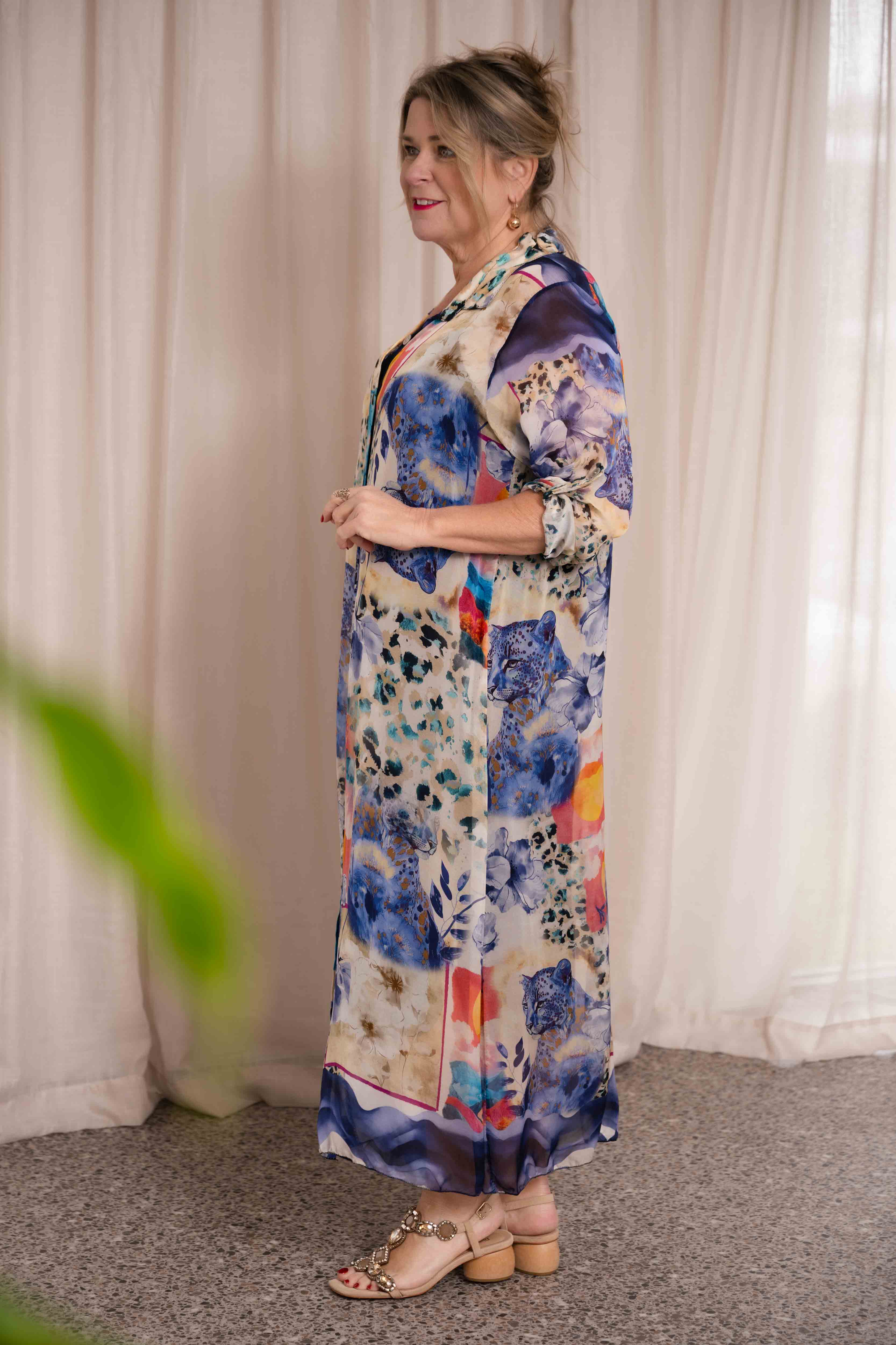 Designed with a full button-down front from the V-neck collar to the hem, this ankle-length silhouette is effortlessly elegant. The silk outer drapes fluidly over a soft stretch lining, offering comfort and ease without sacrificing shape. Three-quarter sleeves are finished with a buttoned tab for versatile styling.
