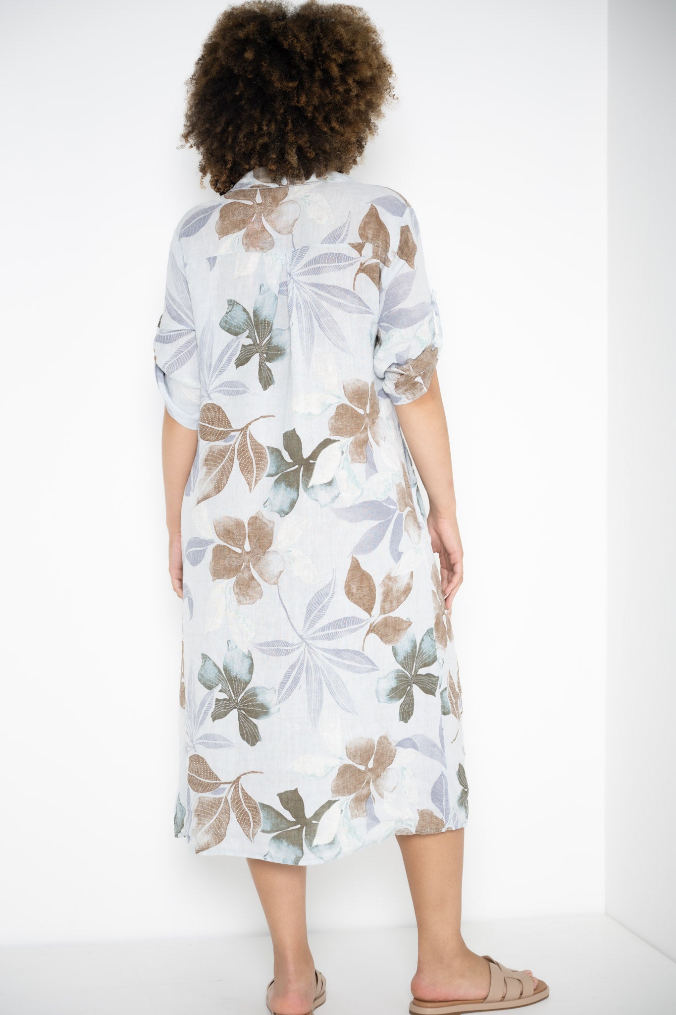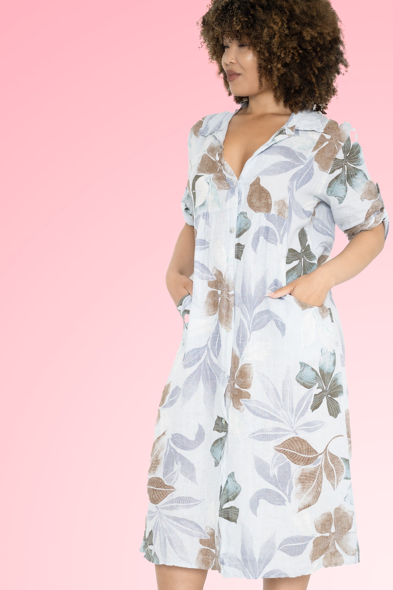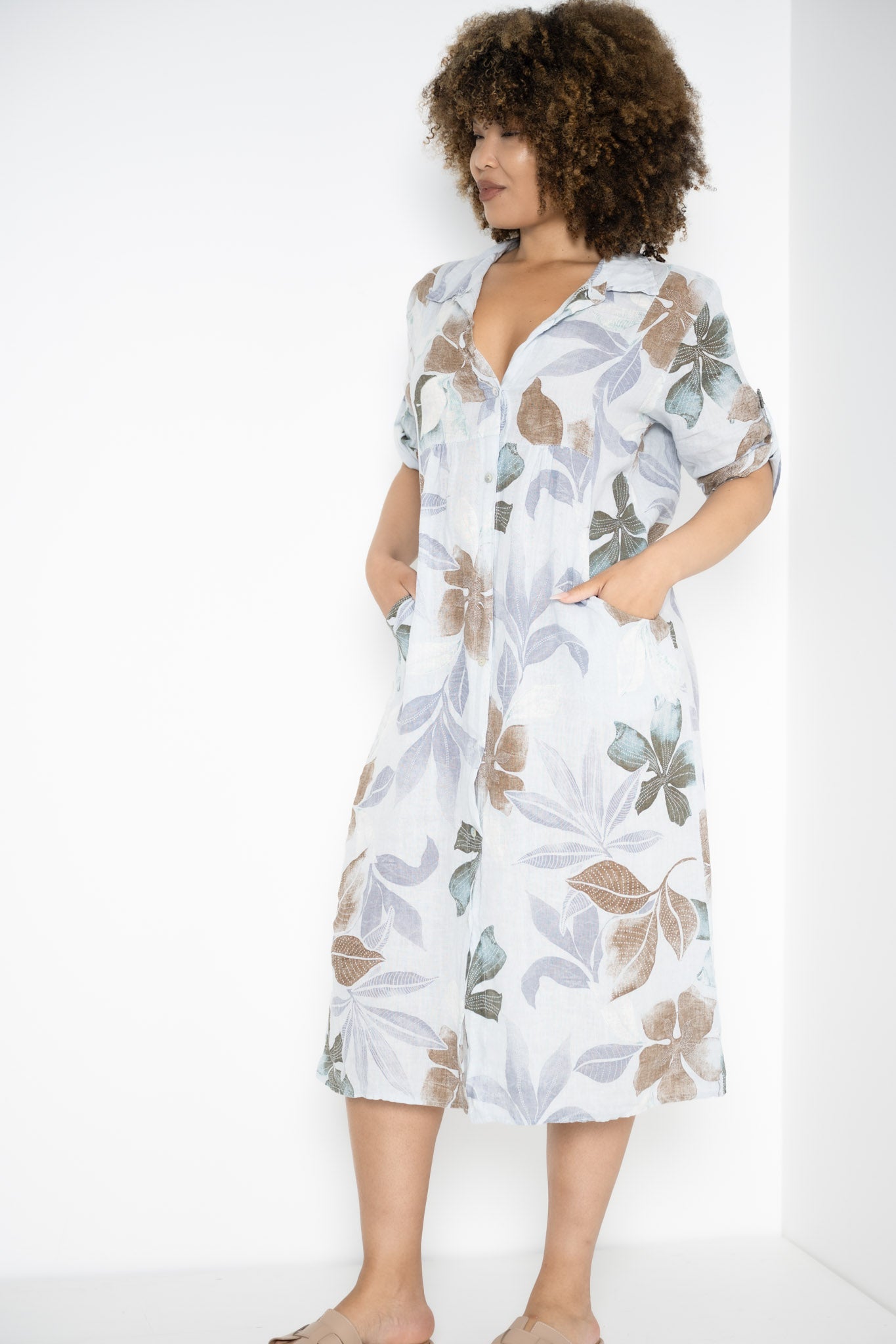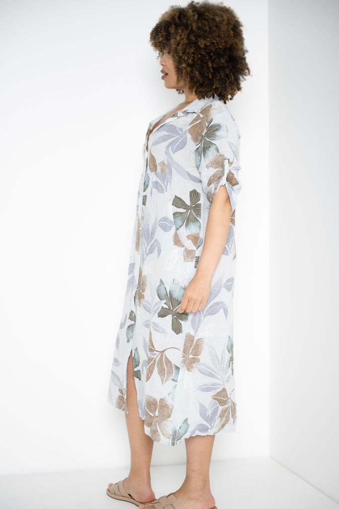 Designed for both ease and elegance, the 3/4 sleeves can be rolled up or buttoned down, while discreet hip pockets keep essentials close at hand. Made from premium Italian linen, this knee-length dress breathes beautifully, moving with you from leisurely brunches to casual market strolls, blending refined charm with relaxed sophistication.
