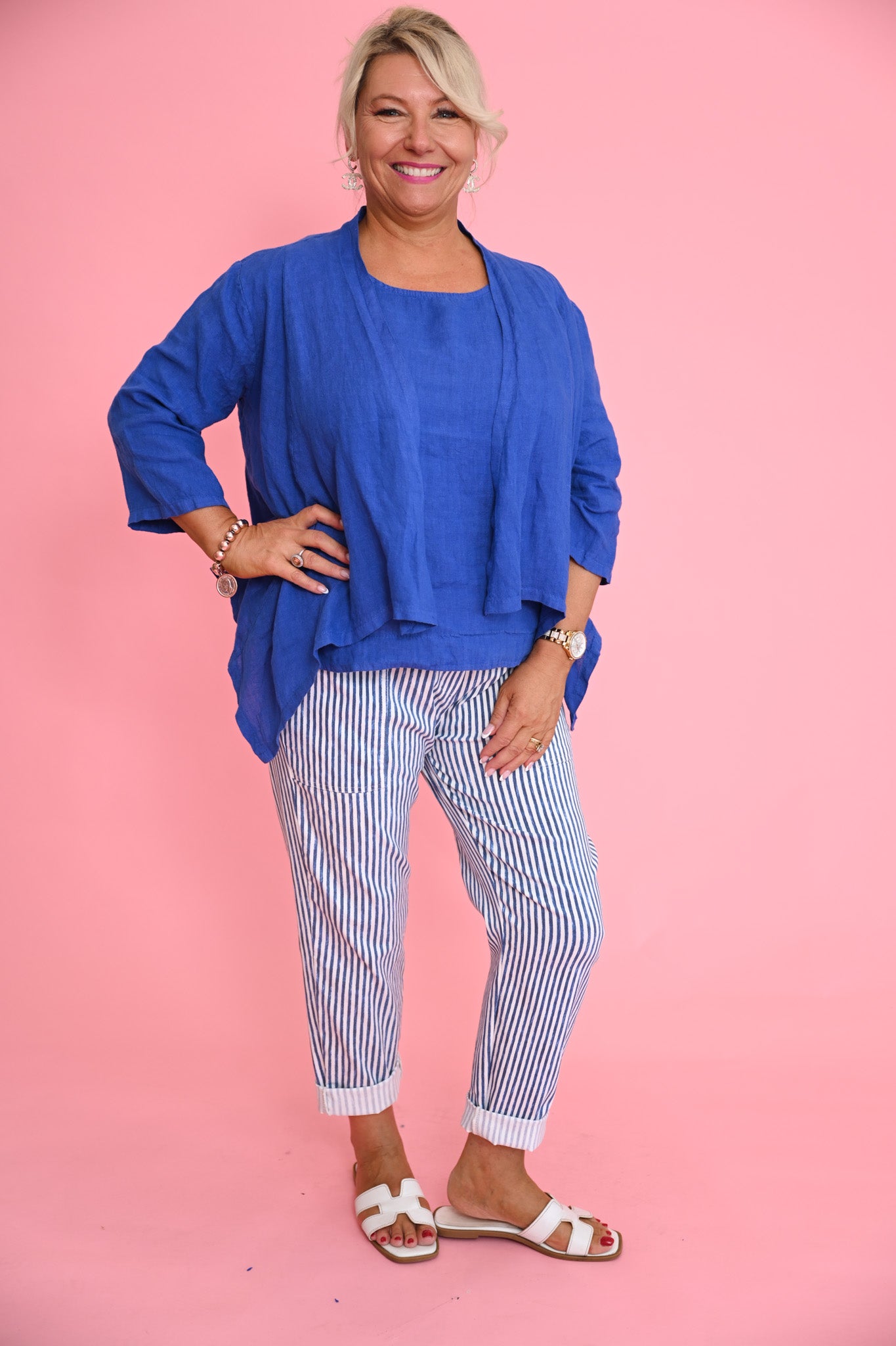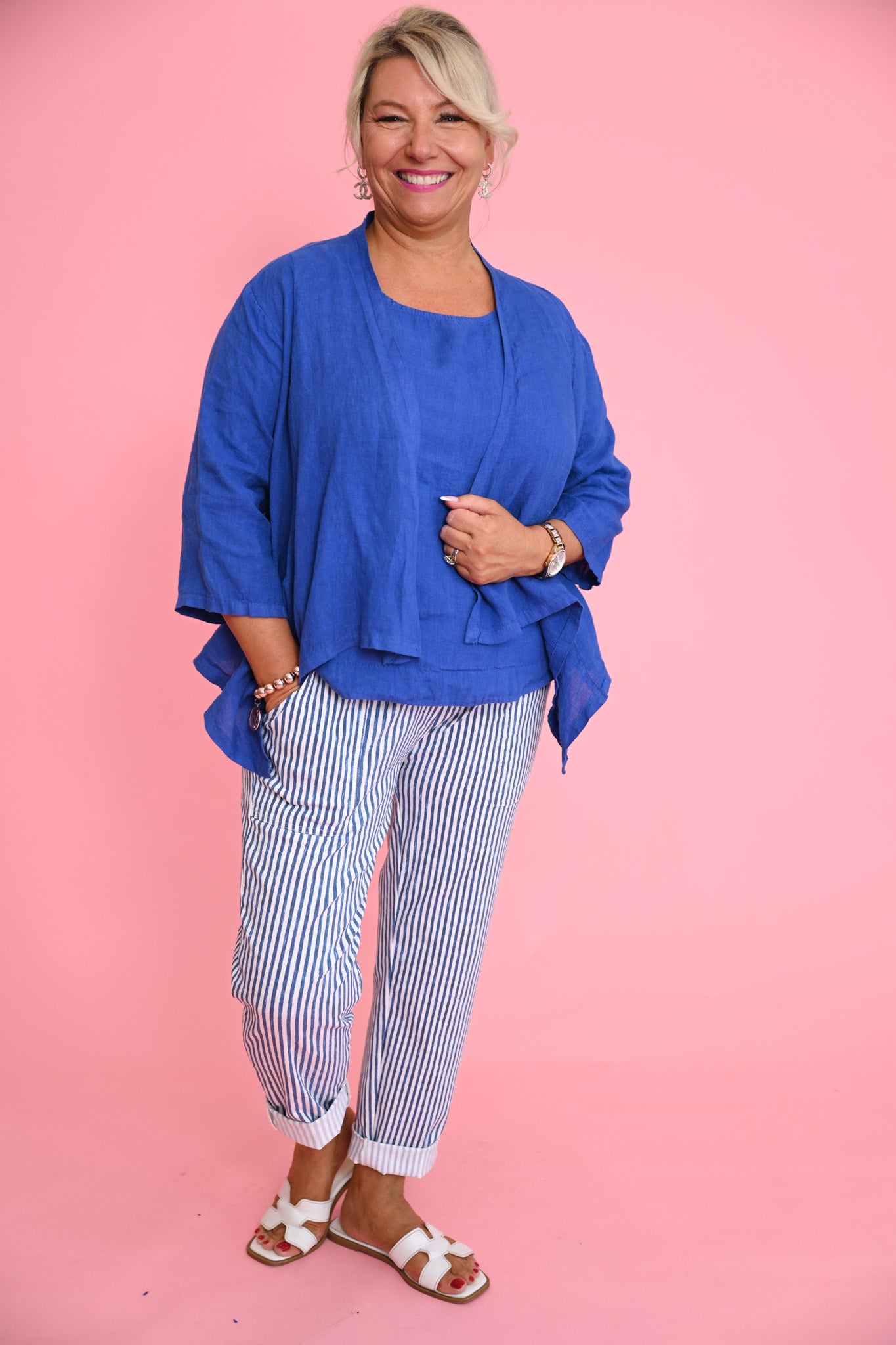 Designed in a slim, flattering cut, the jacket features 3/4 sleeves and a cascading waterfall front that creates graceful movement and a fluid, modern line. Crafted from lightweight linen, it drapes beautifully and pairs seamlessly with both relaxed and more elevated pieces.