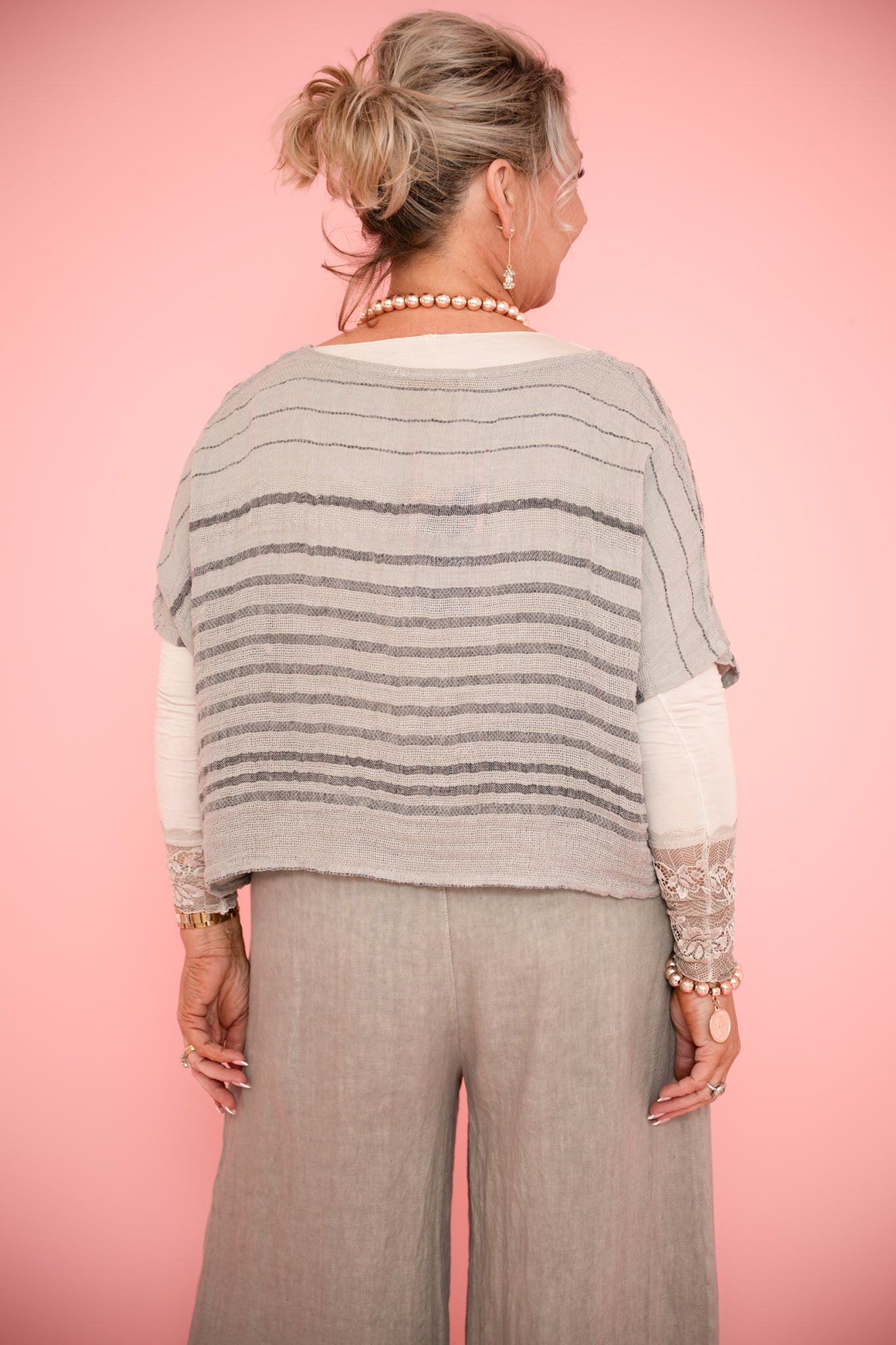 Add a touch of laid-back sophistication to your wardrobe with the Tuscan Grey Stripe Top in Fango. Made from premium Italian linen, this easy-going piece features a warm brown base accented by soft grey horizontal stripes, offering a subtle contrast that feels both modern and timeless.