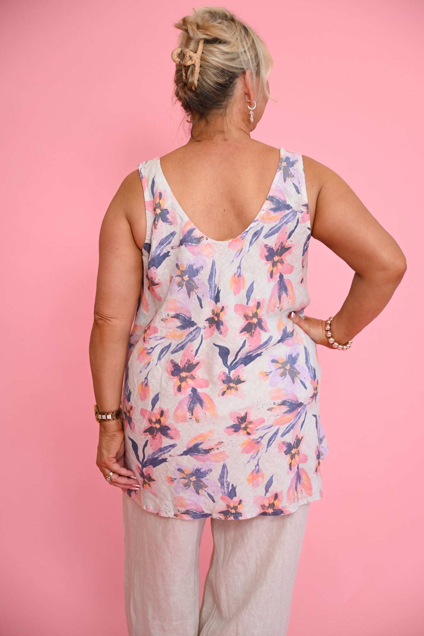 The relaxed silhouette features a flattering round neckline and a sleeveless cut that offers freedom of movement, while the extended length provides comfortable coverage whether worn alone or beneath shorter tops. The beige base is adorned with delicate pink, purple and orange florals, adding gentle colour and a charming, garden-inspired feel.