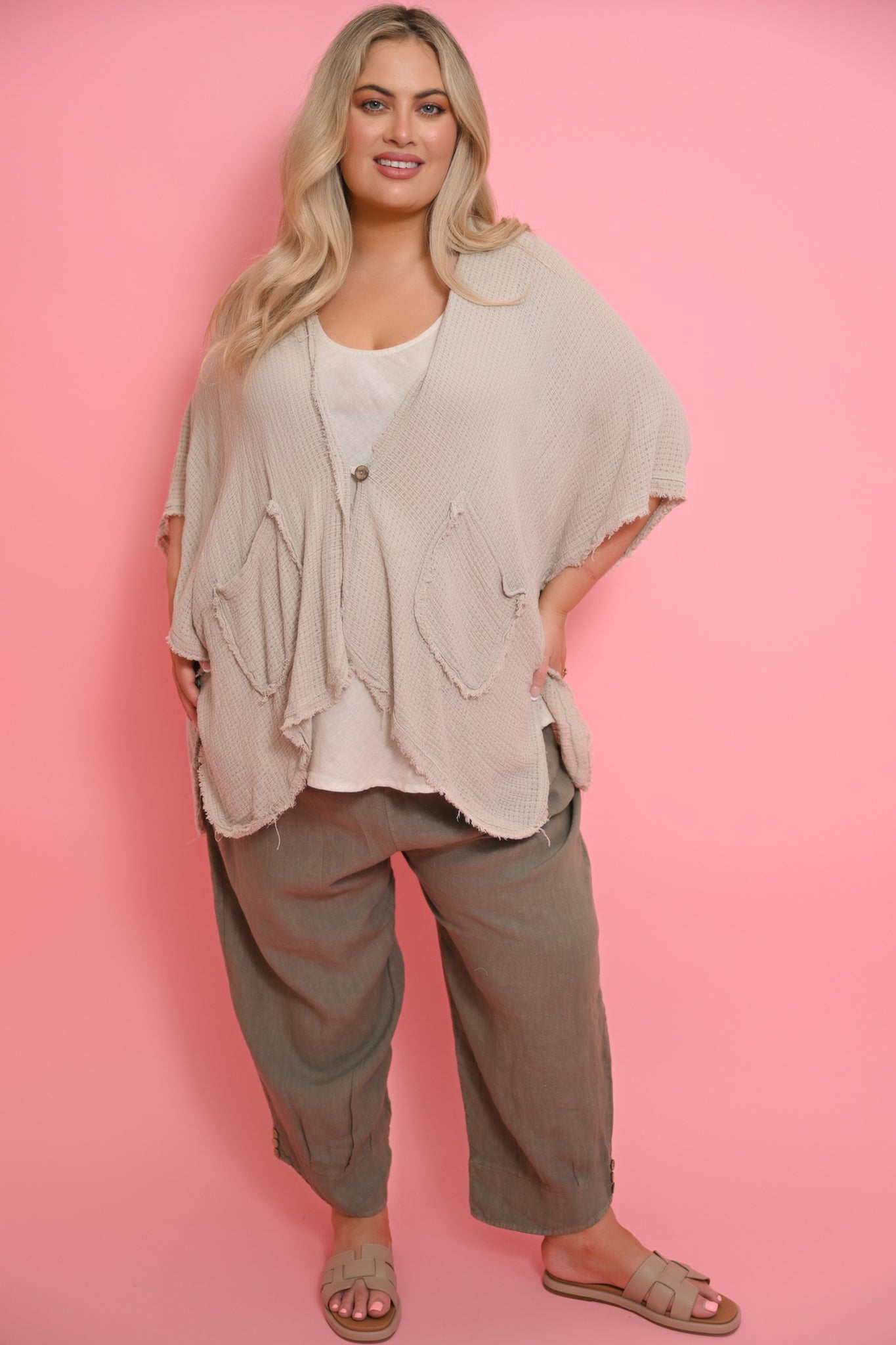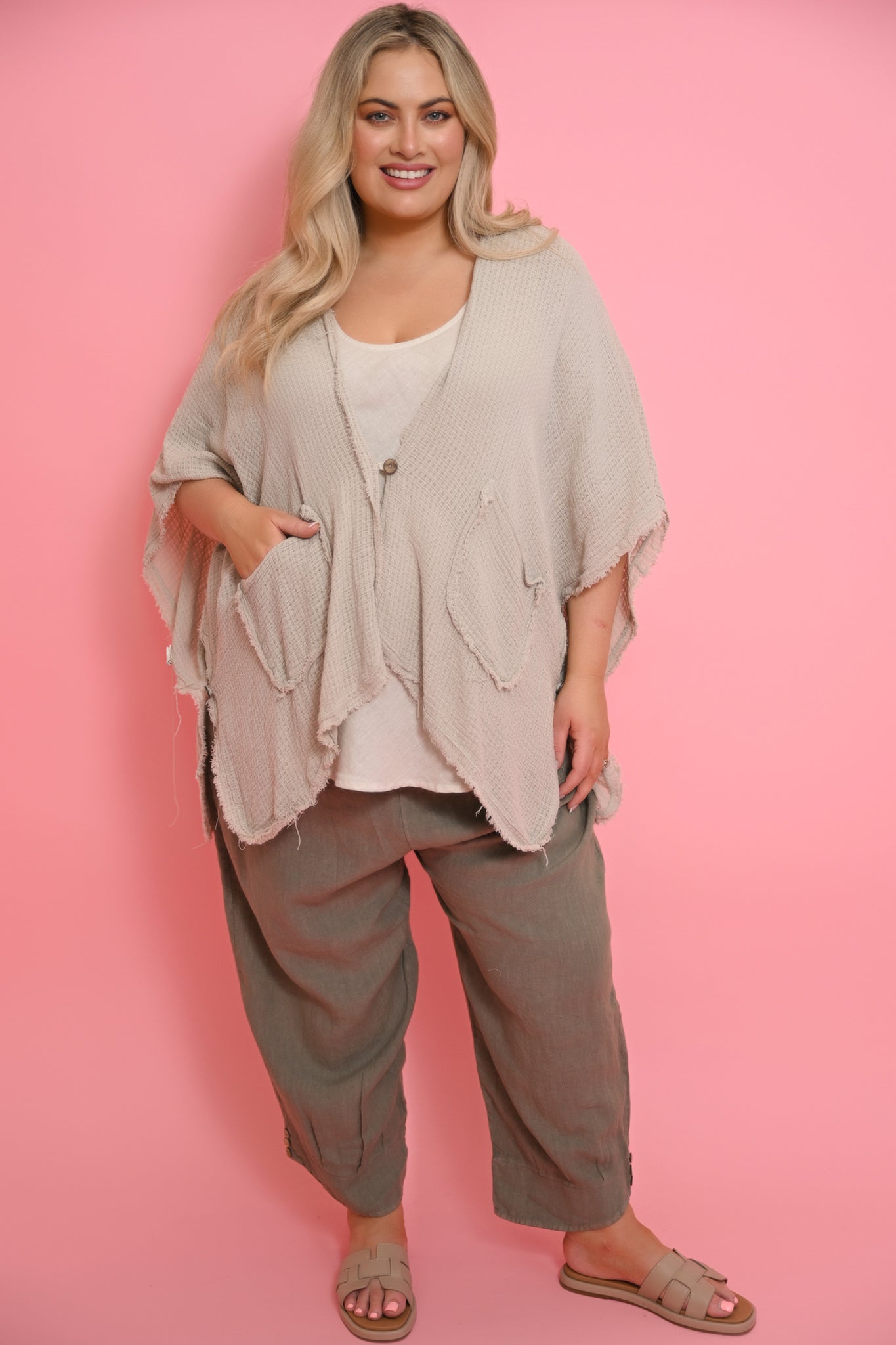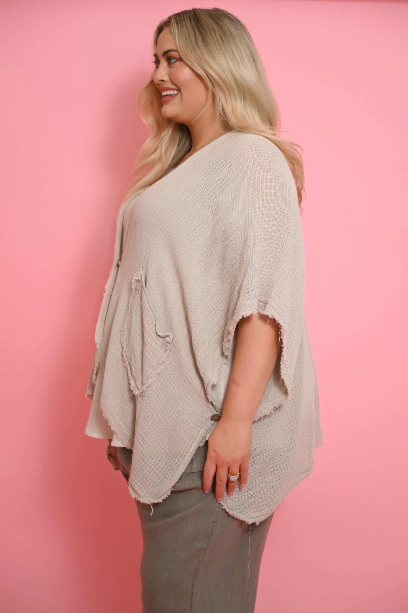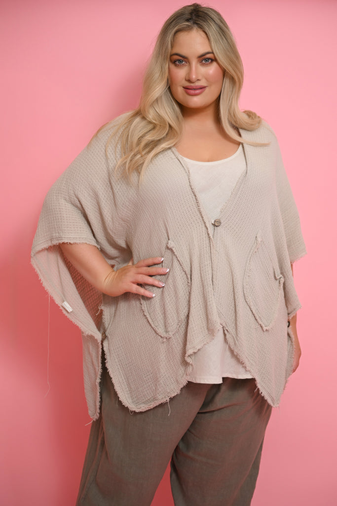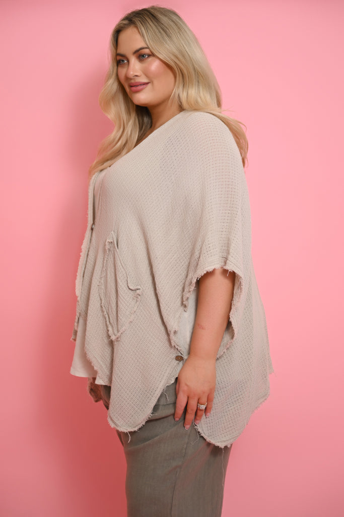 The Vento Cape in beige is a modern, statement outer layer designed for effortless style and relaxed comfort. Crafted from a lightweight cotton and linen blend, its loose weave fabric offers breathability and a soft, natural drape.