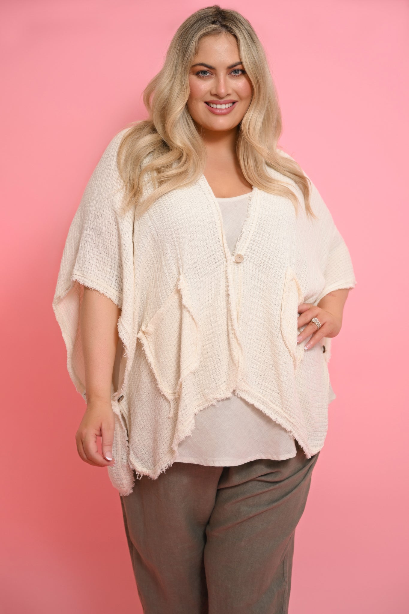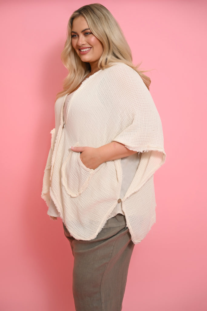 The Vento Cape in cream is an effortlessly chic, oversized jacket designed for relaxed layering. Crafted from a breathable cotton and linen blend, its loosely woven fabric drapes softly, giving the piece a natural, airy feel.