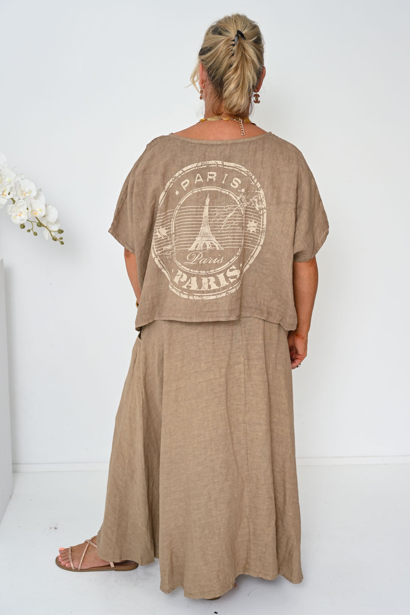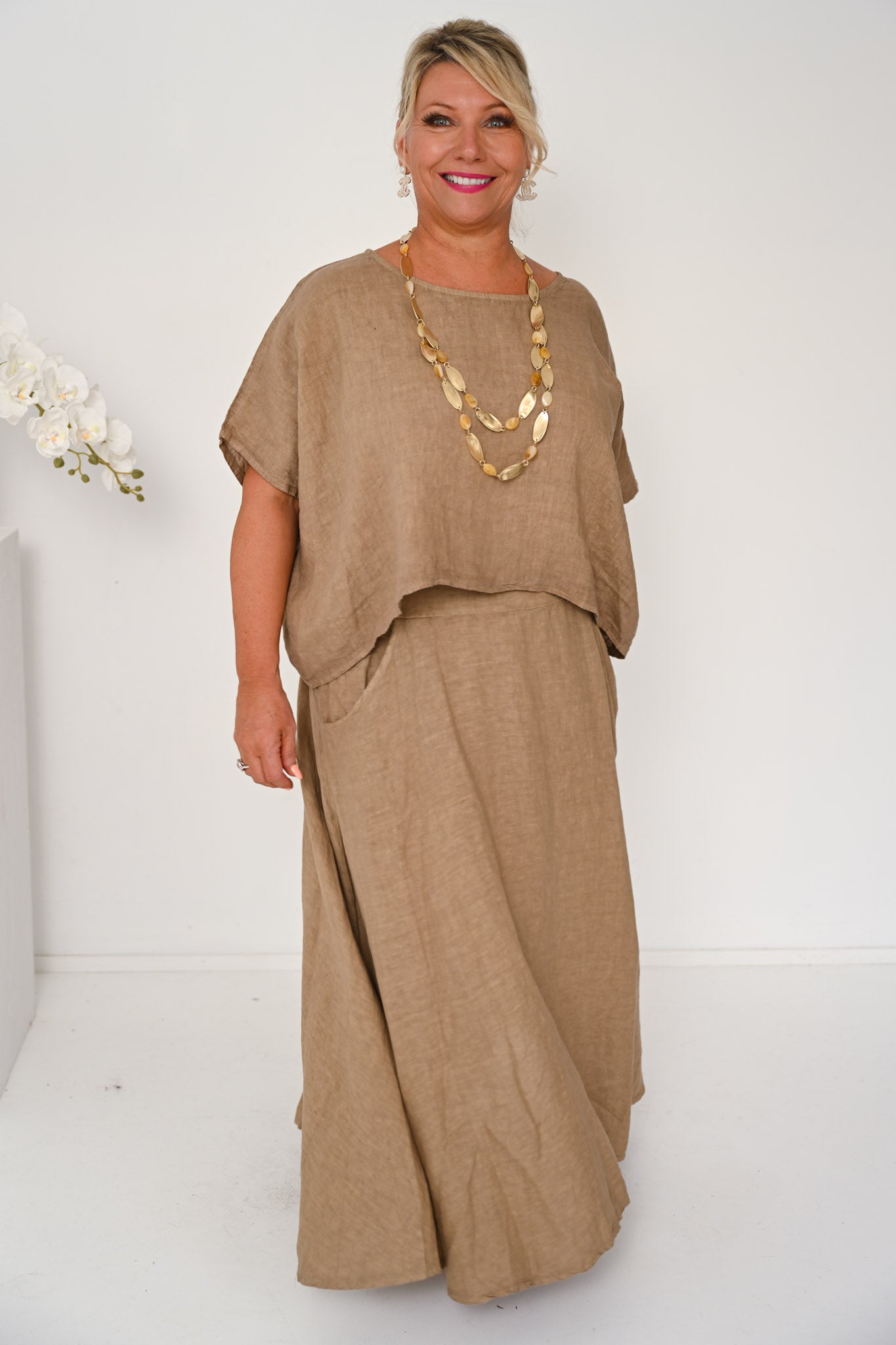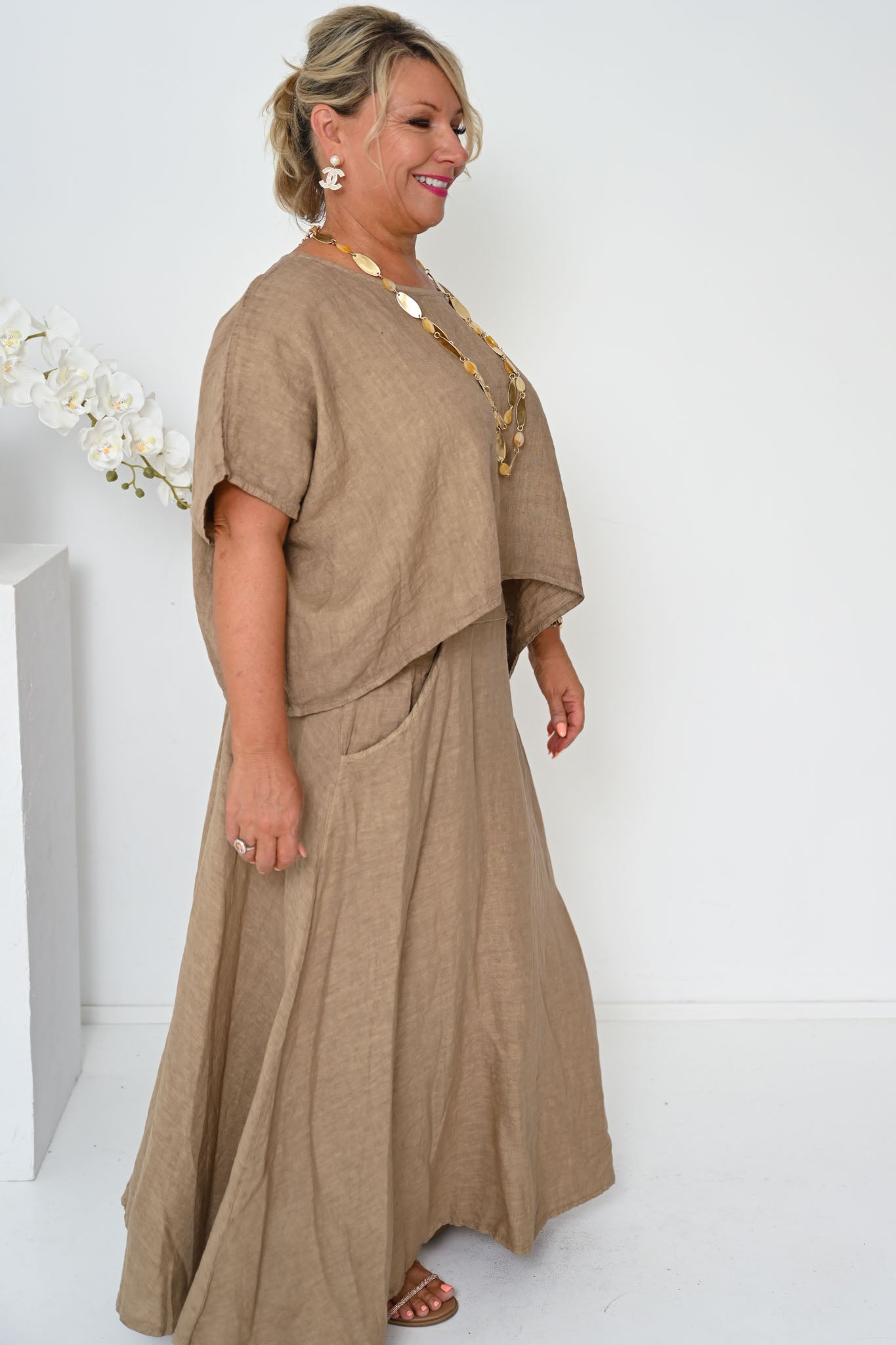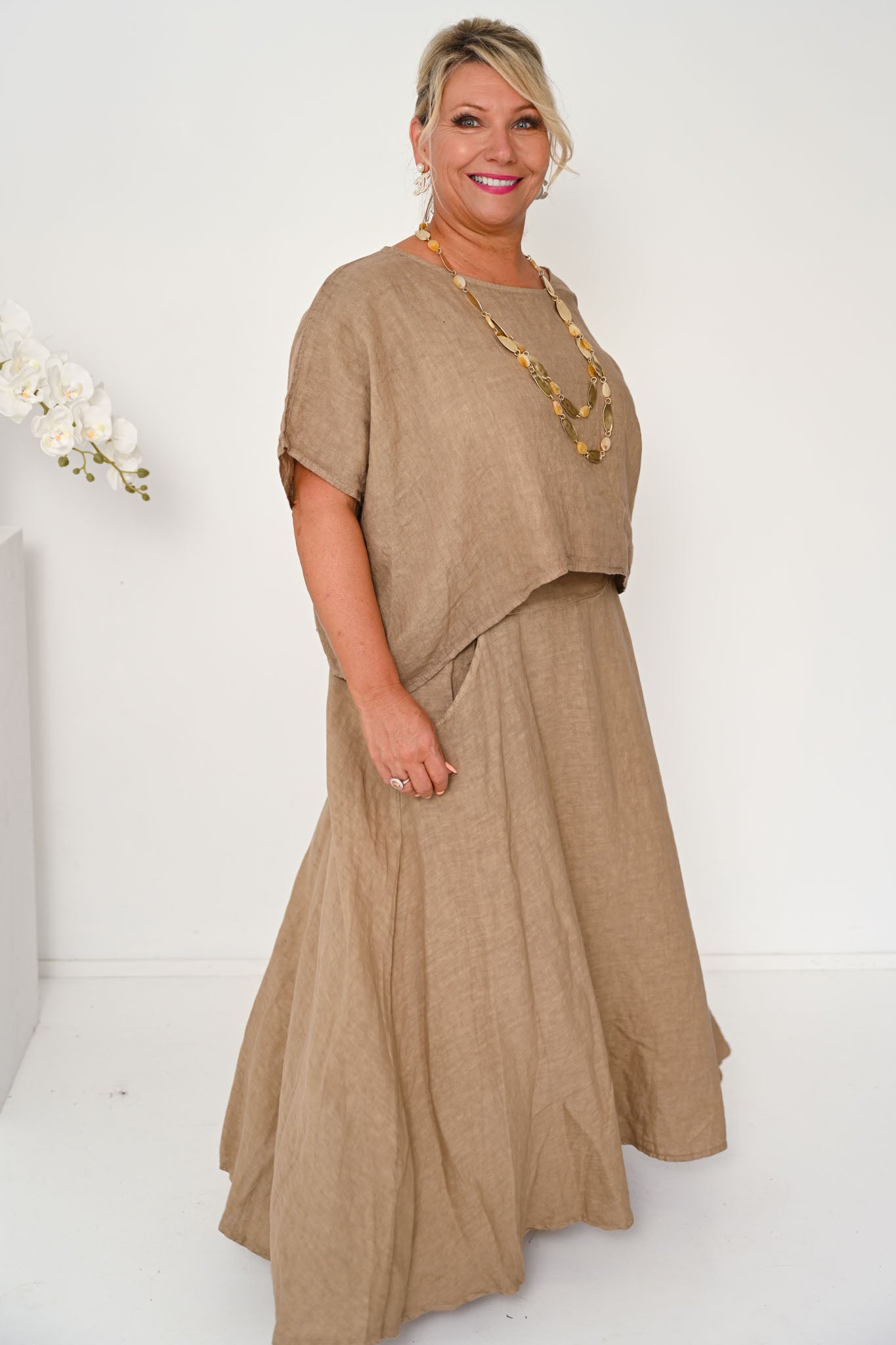 The Verde Skirt is a refined wardrobe staple, crafted from 100% linen and made in Italy for effortless wear and lasting quality. Rendered in a warm camel tone, this ankle-length skirt offers a timeless A-line shape with a gently flared hem that flows naturally with movement.