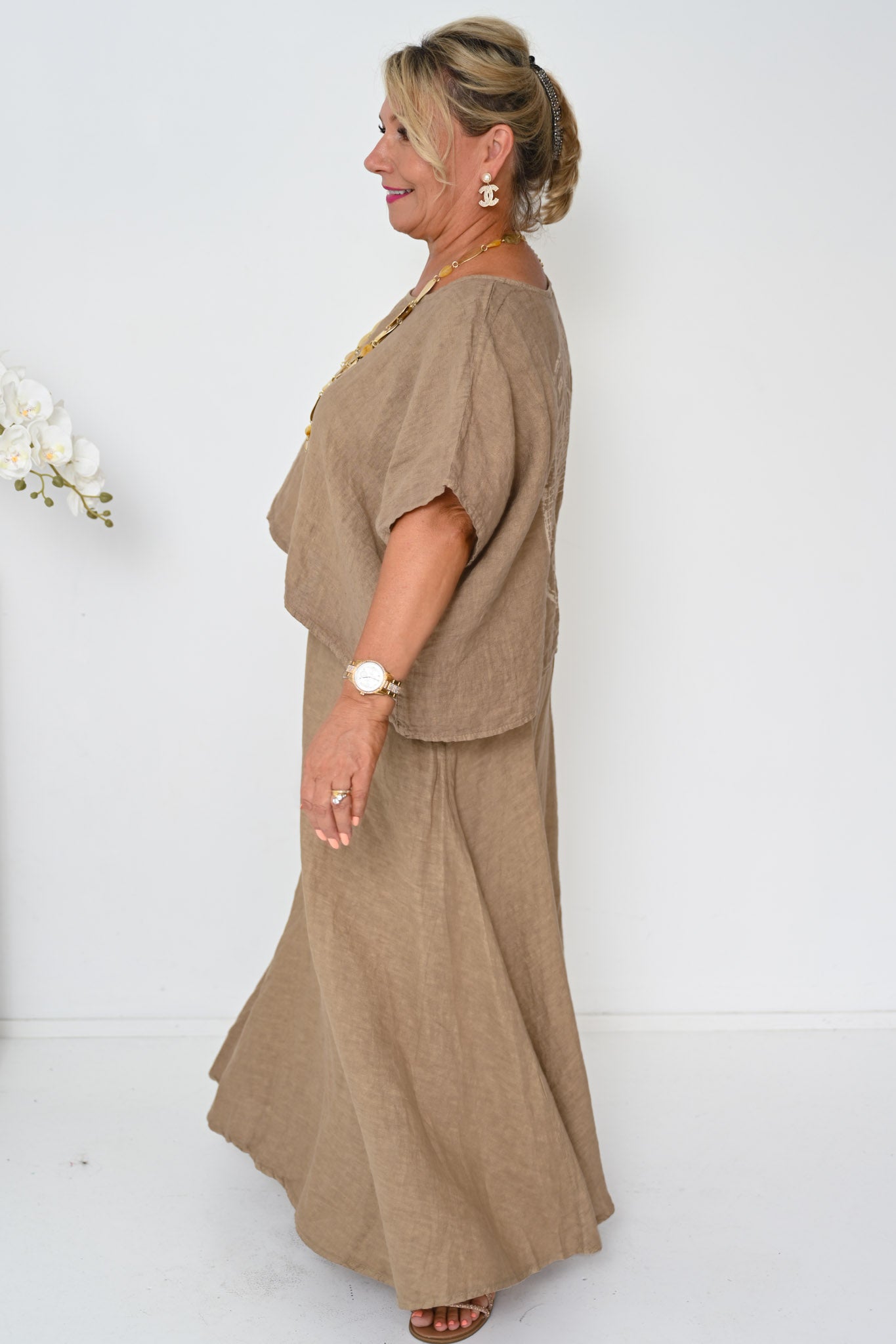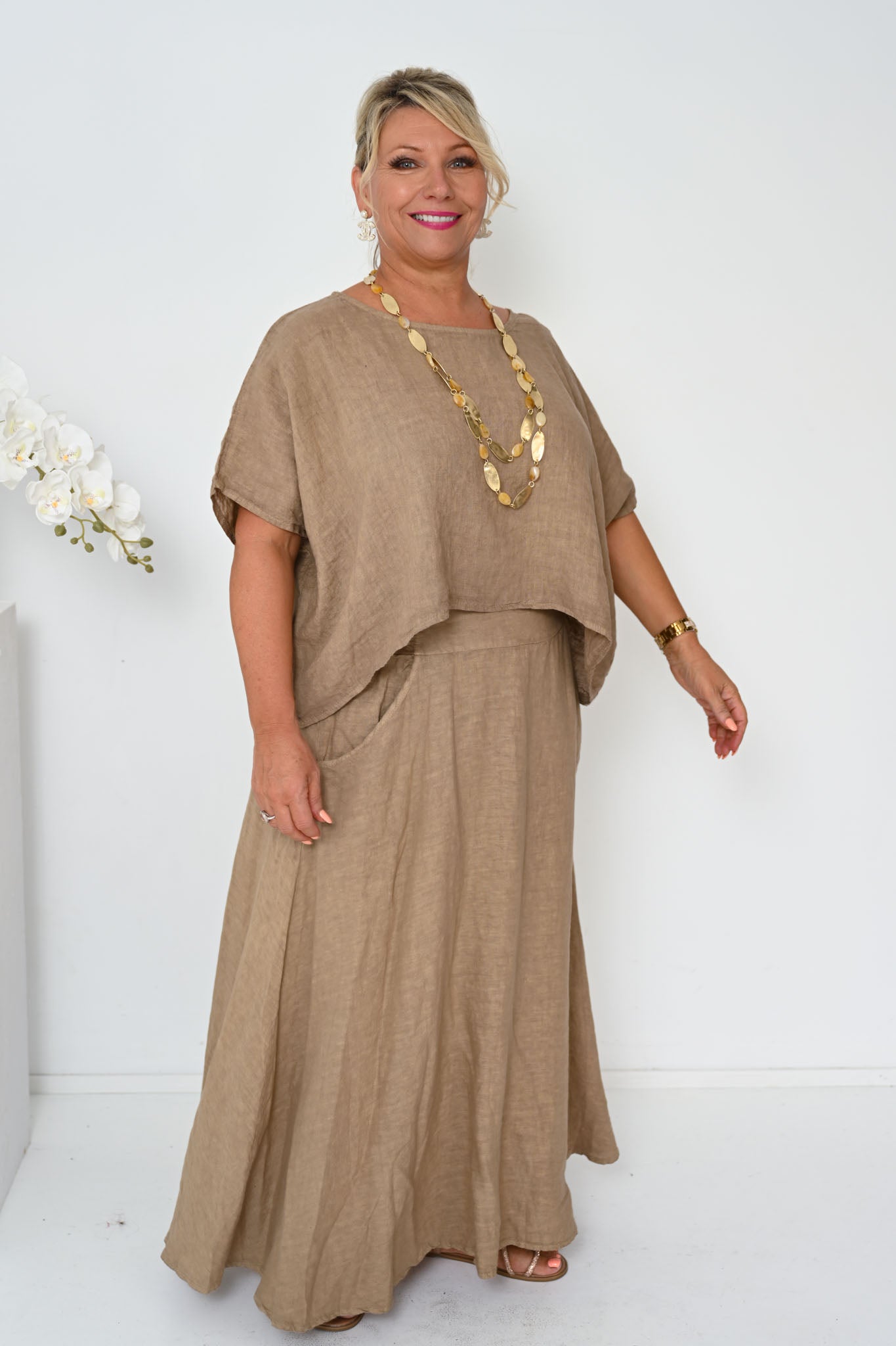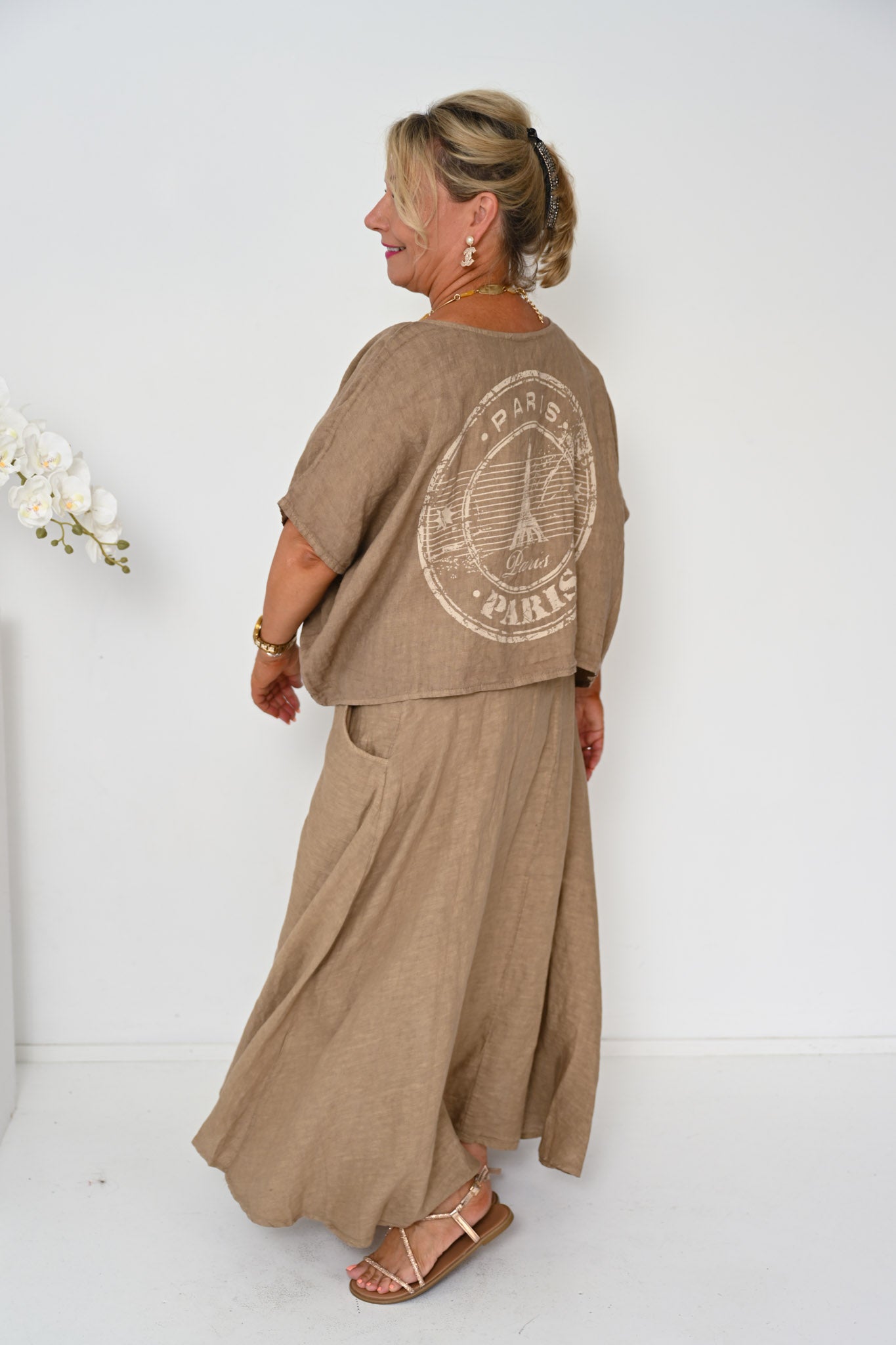 The Verde Skirt is a refined wardrobe staple, crafted from 100% linen and made in Italy for effortless wear and lasting quality. Rendered in a warm camel tone, this ankle-length skirt offers a timeless A-line shape with a gently flared hem that flows naturally with movement.