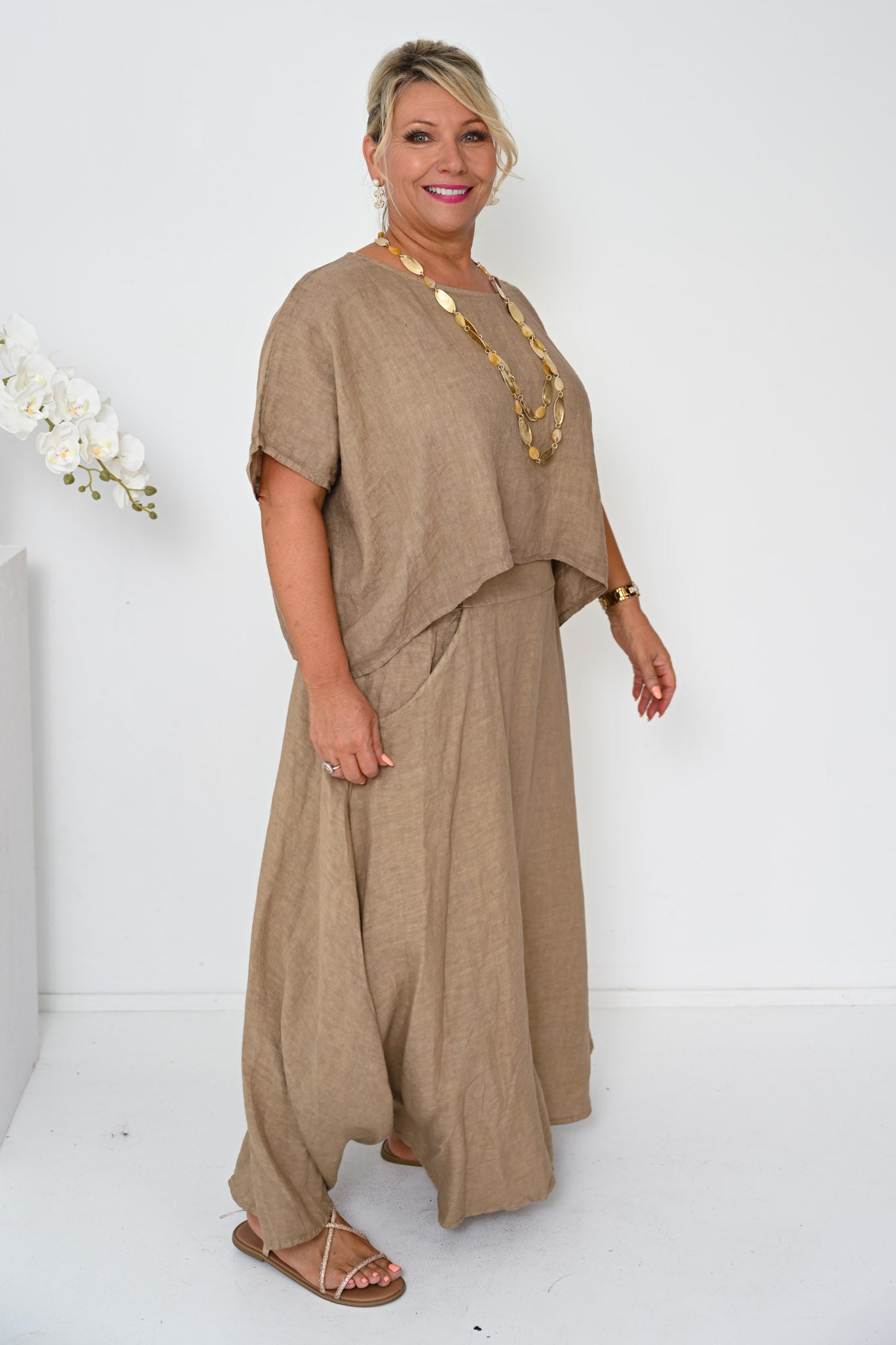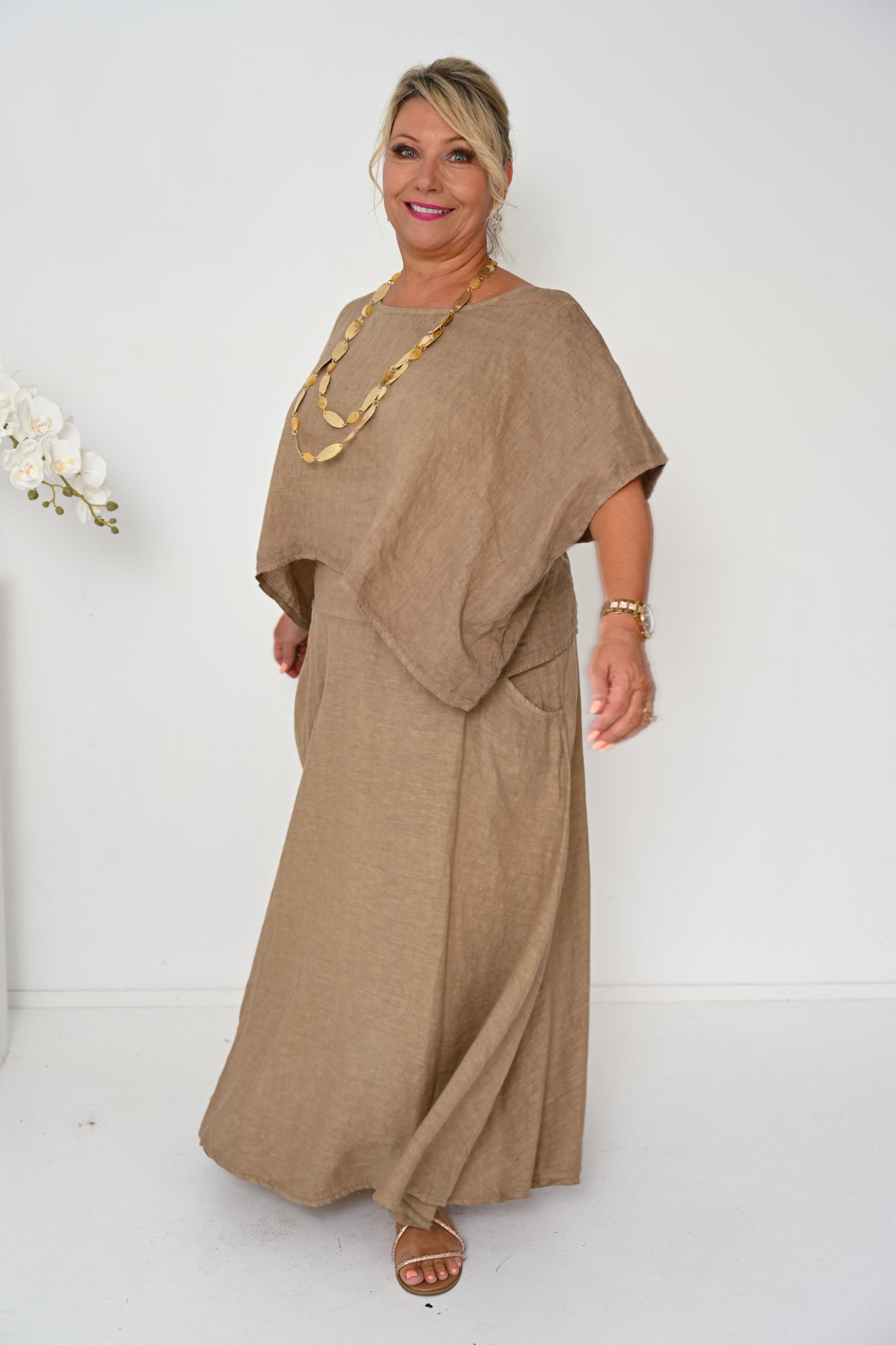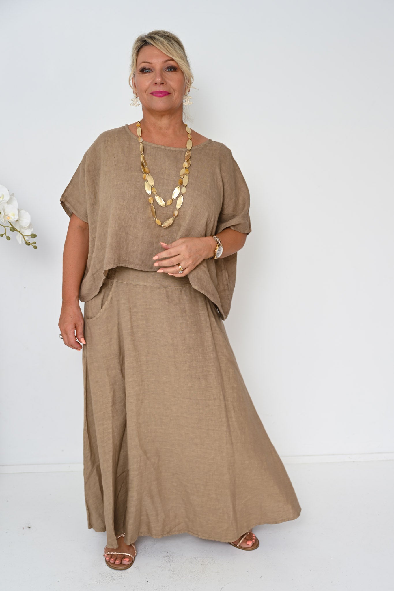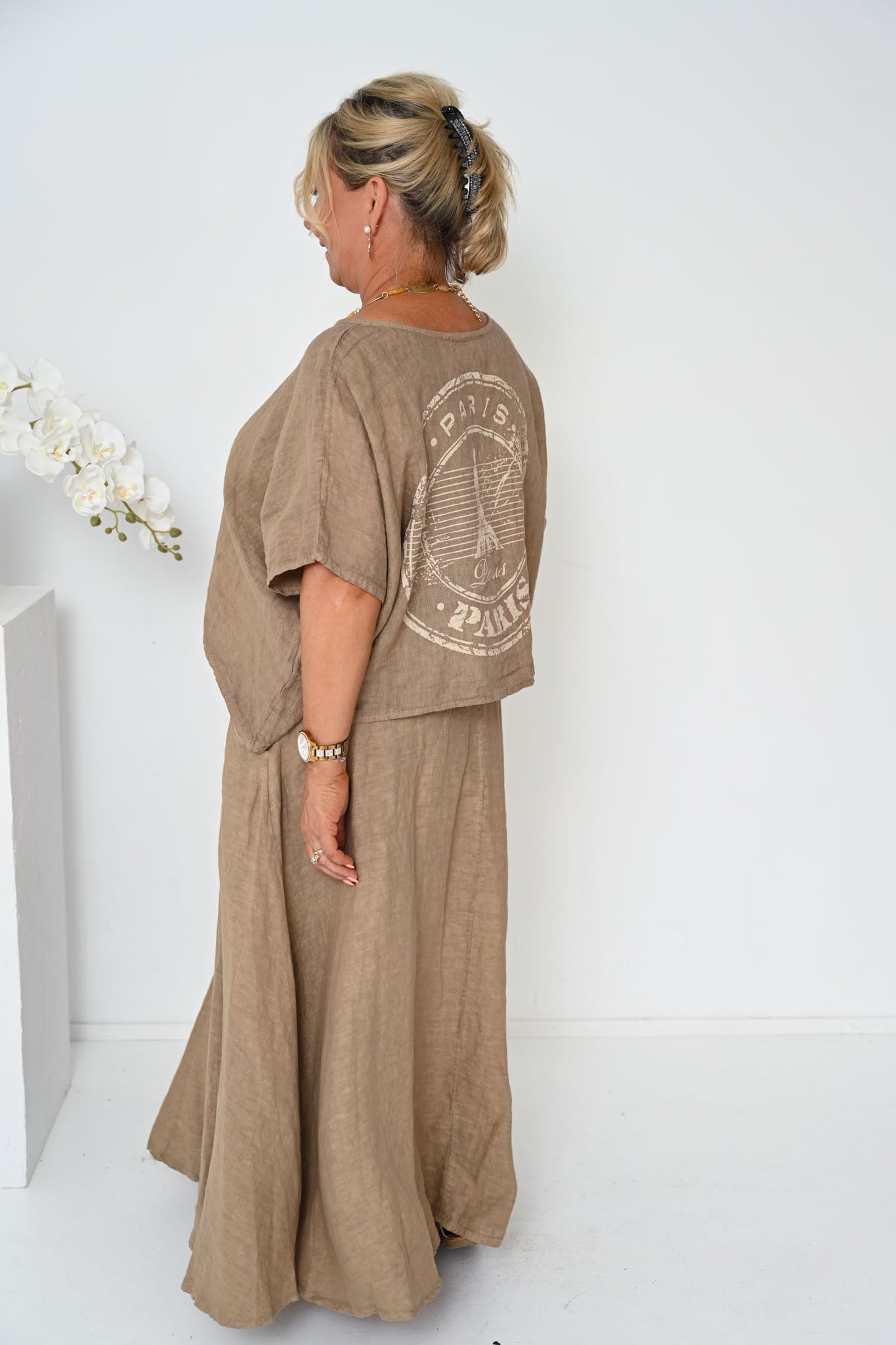 The Verde Skirt is a refined wardrobe staple, crafted from 100% linen and made in Italy for effortless wear and lasting quality. Rendered in a warm camel tone, this ankle-length skirt offers a timeless A-line shape with a gently flared hem that flows naturally with movement.