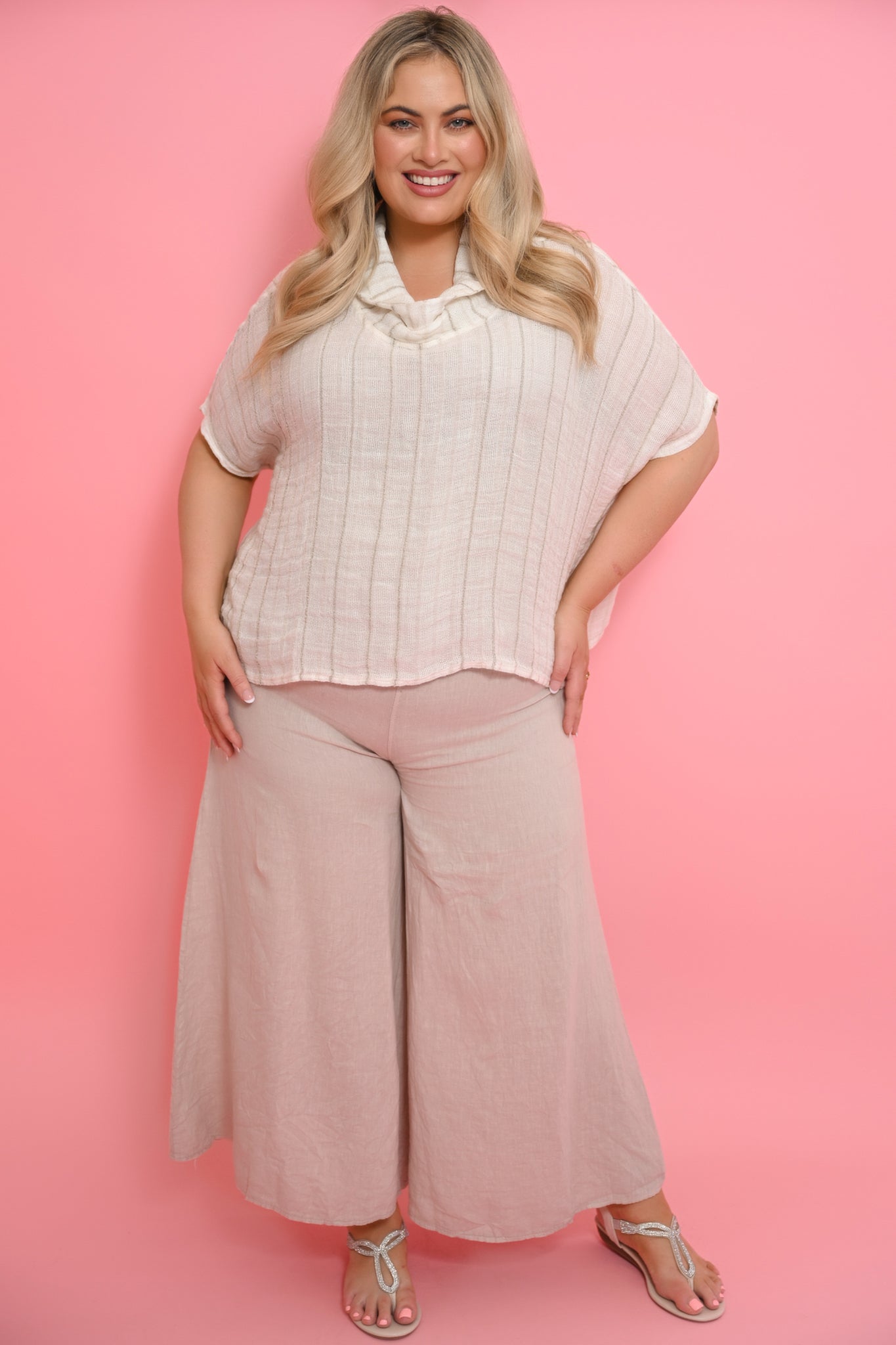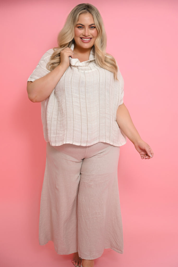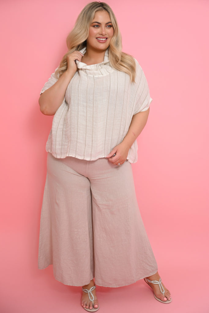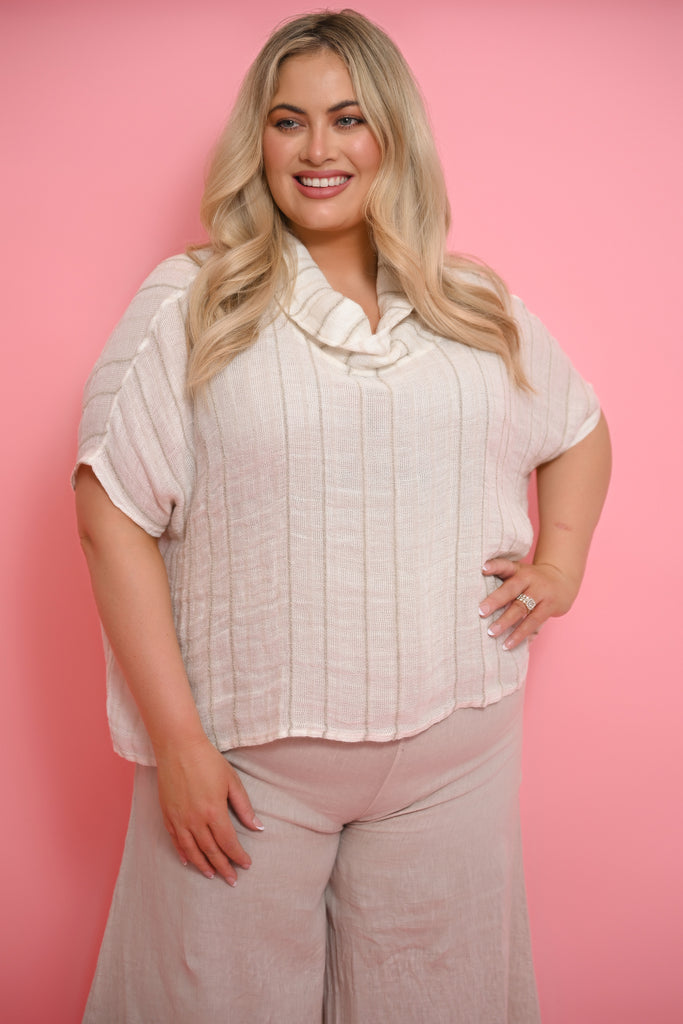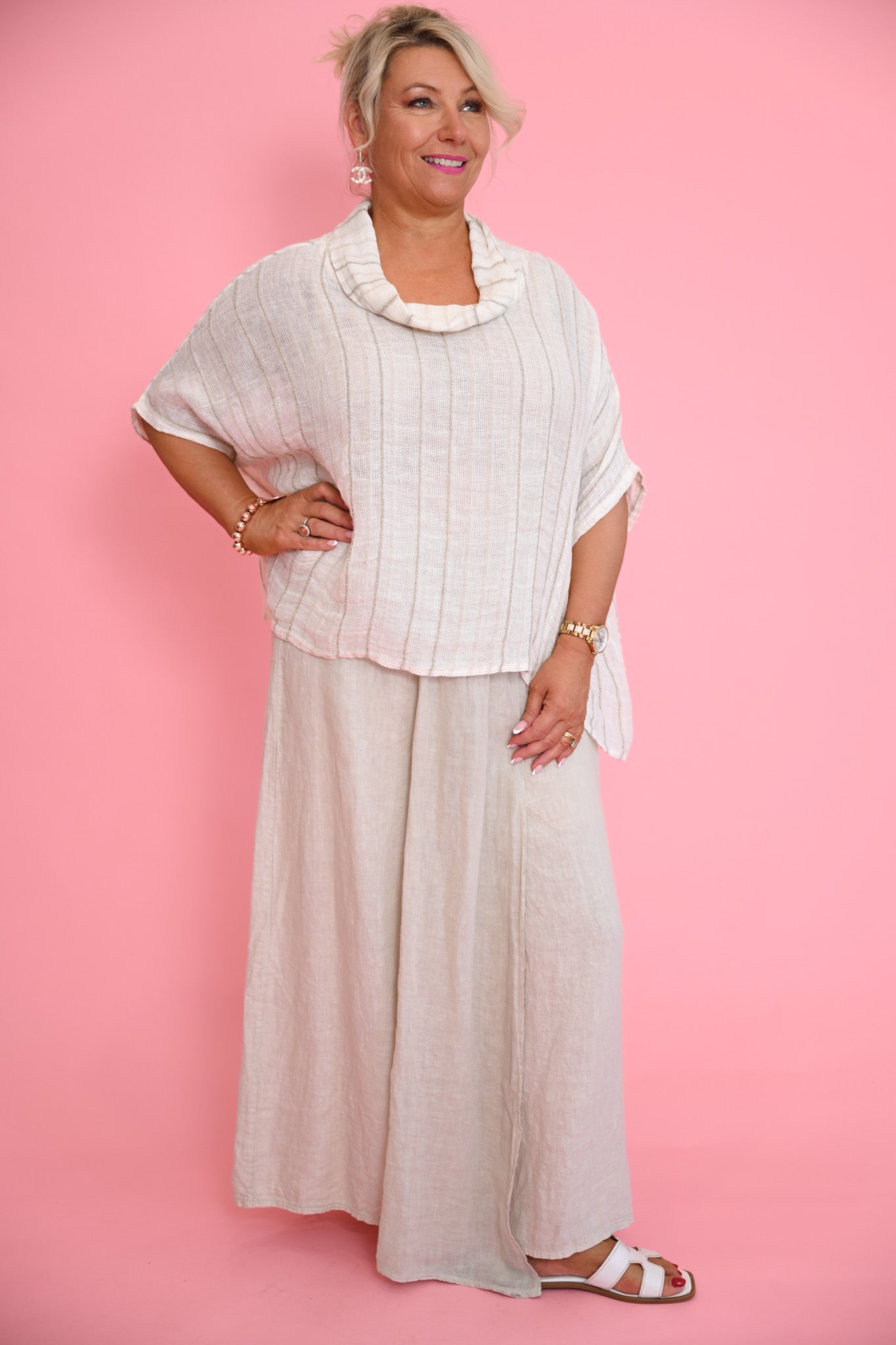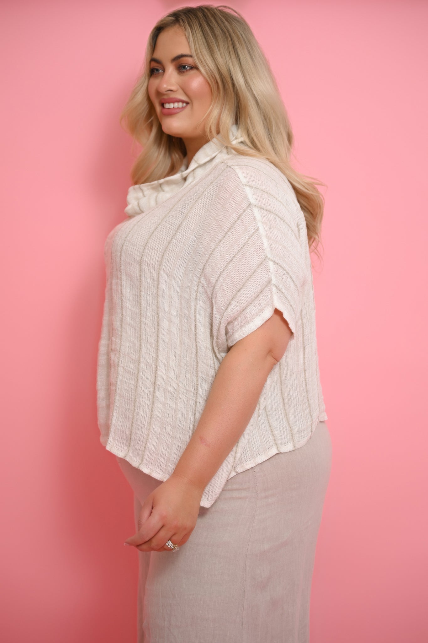 The Viante Top is crafted from lightweight linen with soft vertical beige stripes, giving it a fresh, textured look. Its high cowl neckline drapes elegantly, adding a touch of sophistication while keeping the design relaxed. The cropped silhouette sits neatly at the waist, creating a modern shape that pairs beautifully with high-waisted skirts or trousers.