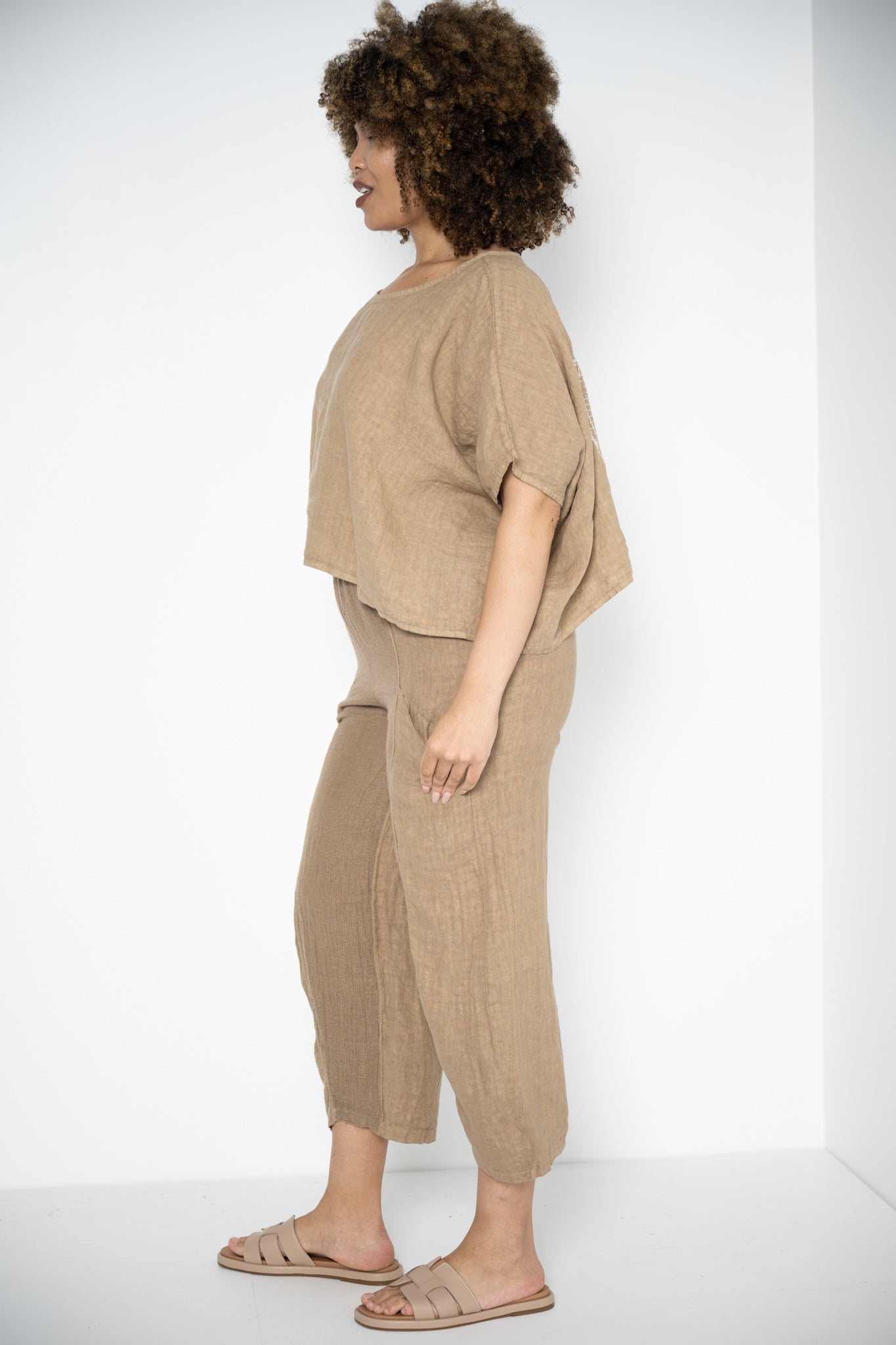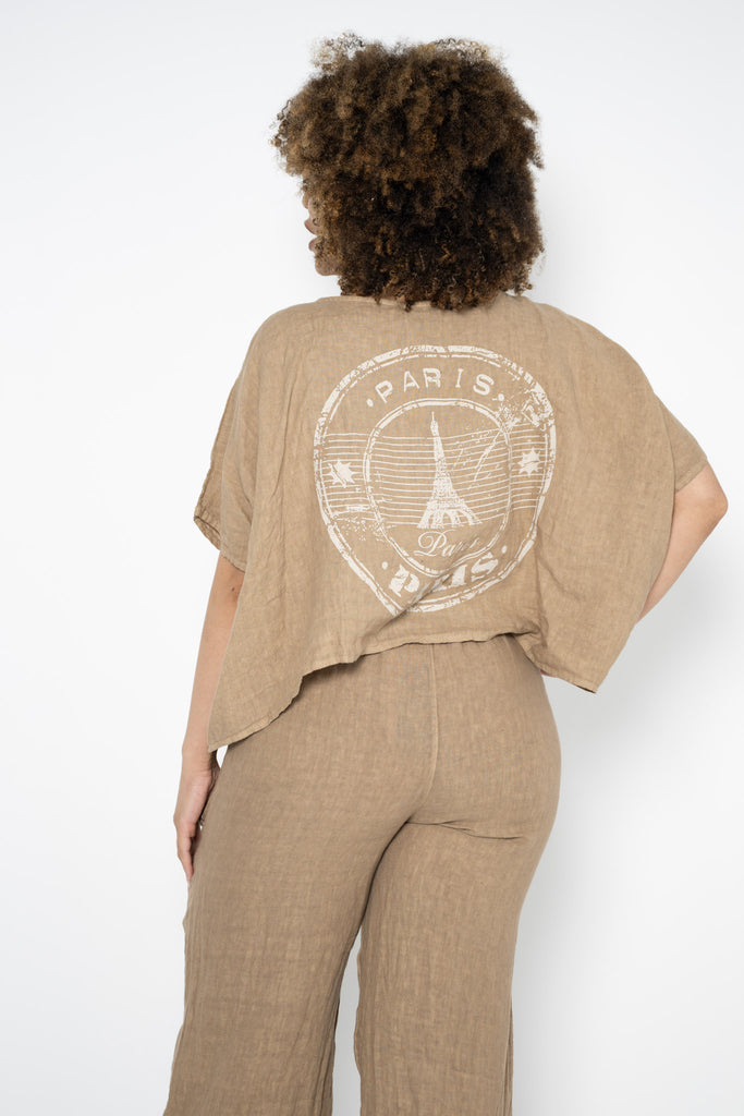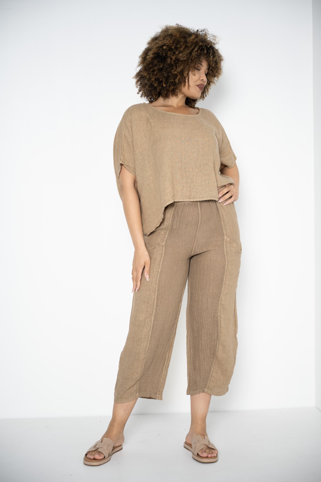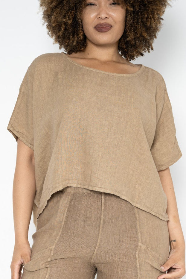 The rich caramel shade evokes sunbaked earth and golden light, offering a grounded, versatile base that pairs beautifully with soft neutrals, deep tones, or bold accents. Made from breathable linen, it’s a seasonless staple—cool enough for summer, perfect for layering in cooler weather.