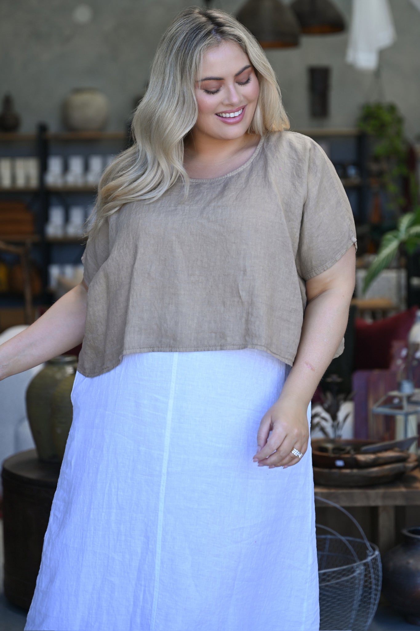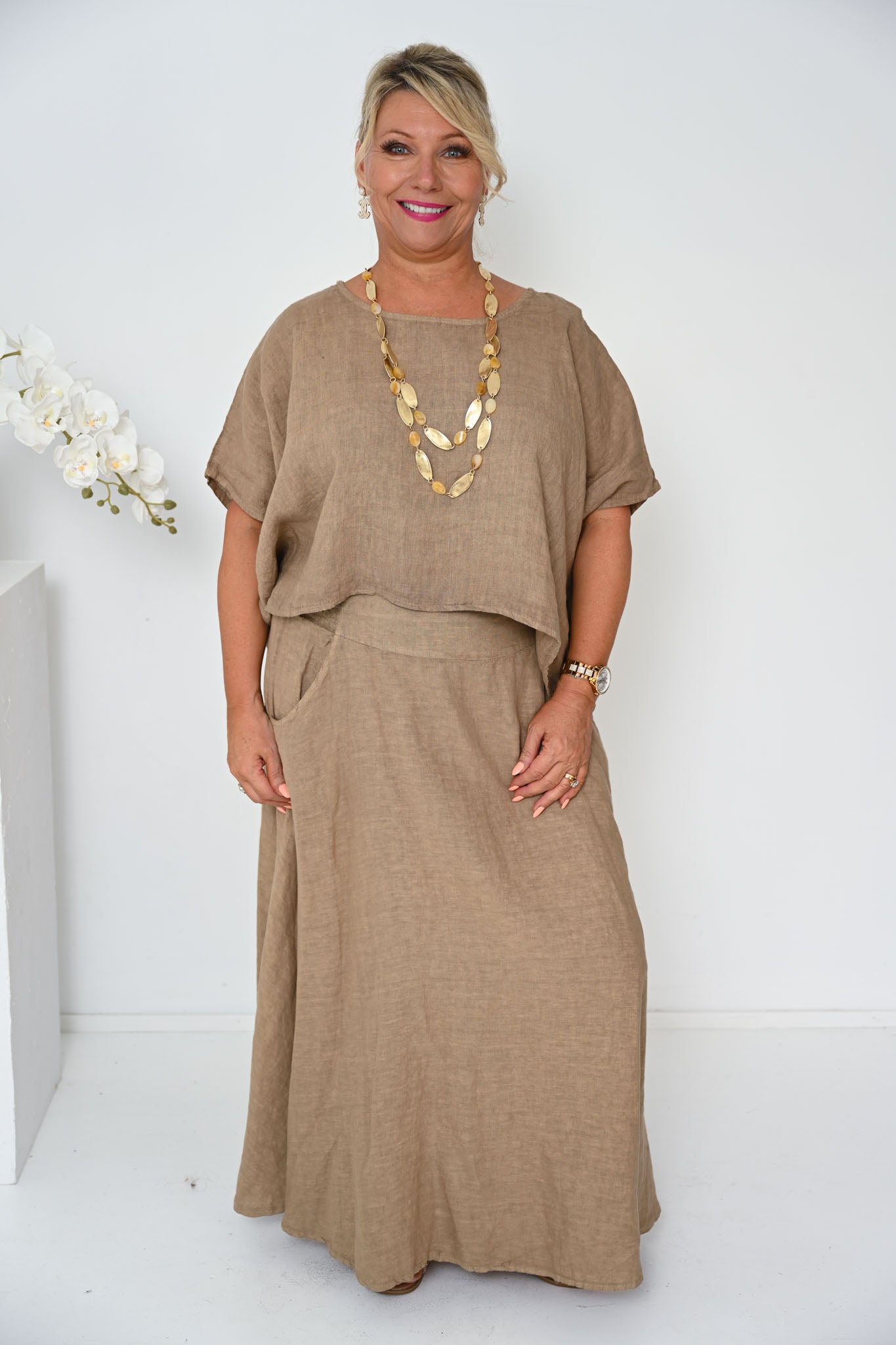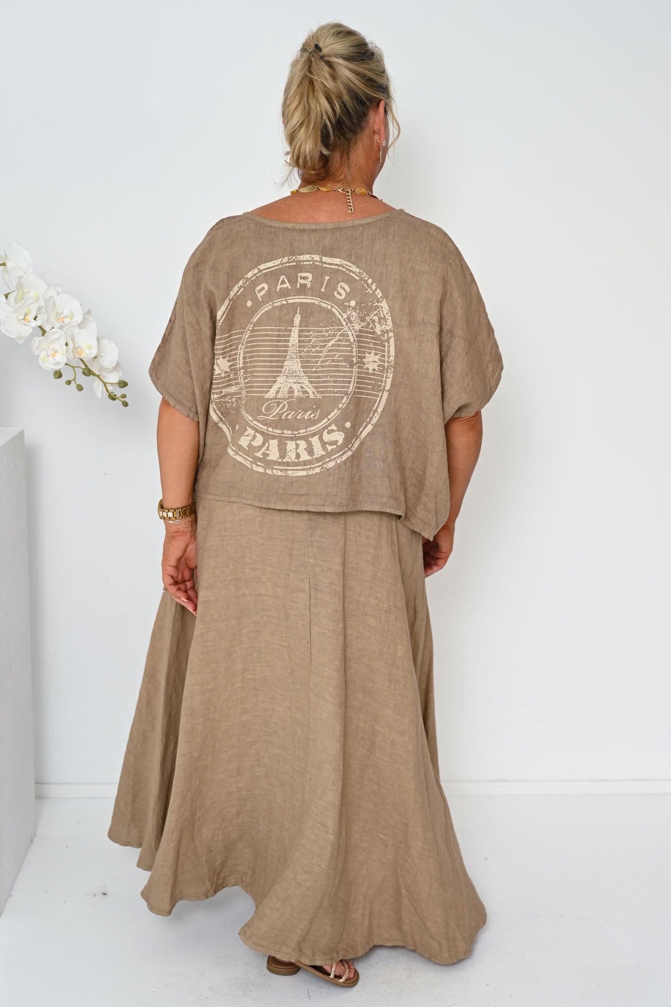 The rich caramel shade evokes sunbaked earth and golden light, offering a grounded, versatile base that pairs beautifully with soft neutrals, deep tones, or bold accents. Made from breathable linen, it’s a seasonless staple—cool enough for summer, perfect for layering in cooler weather.