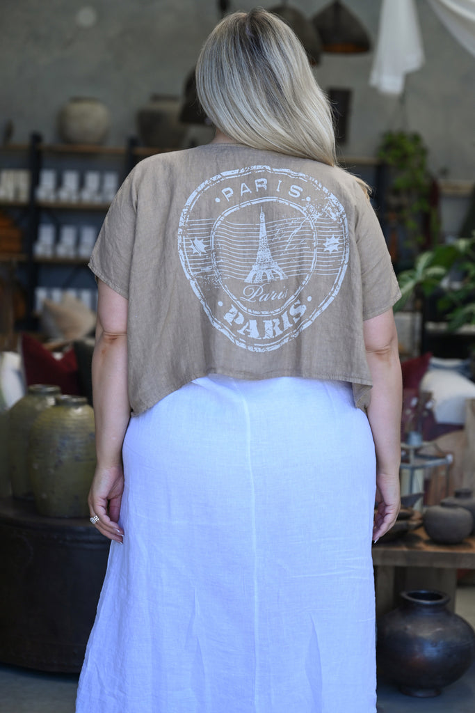 On the back, a striking emblem featuring Paris and the Eiffel Tower is printed in a round, branded design, adding an unexpected twist to the top’s pared-back elegance.