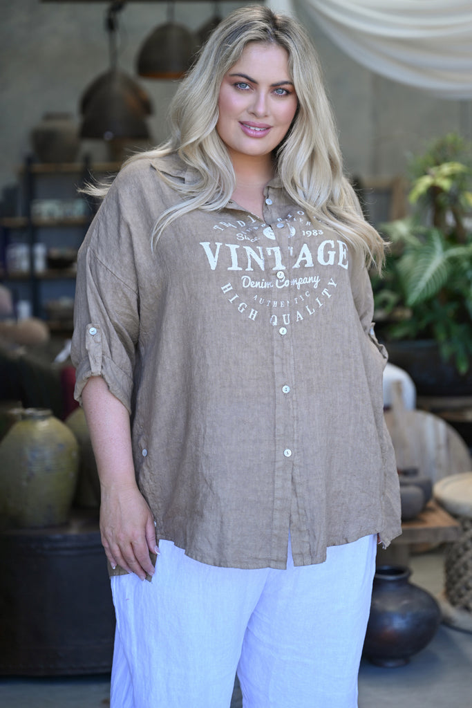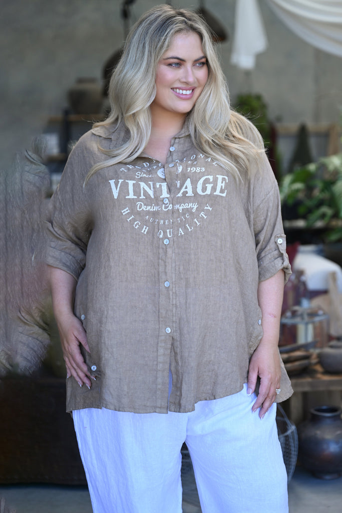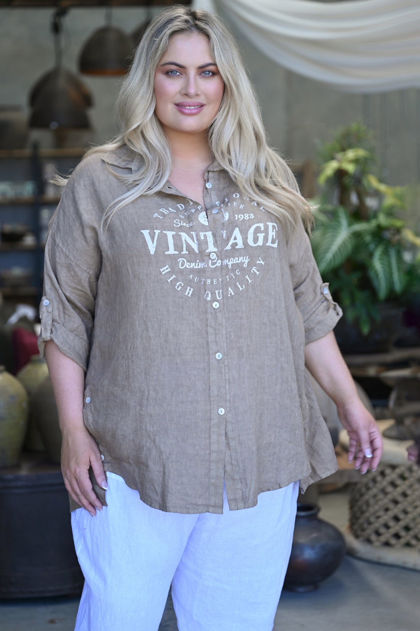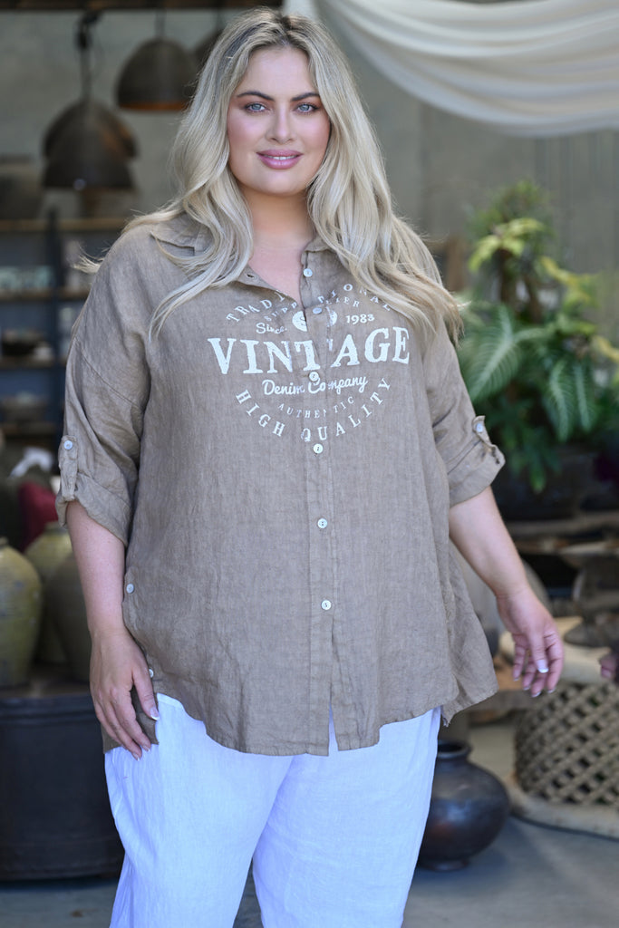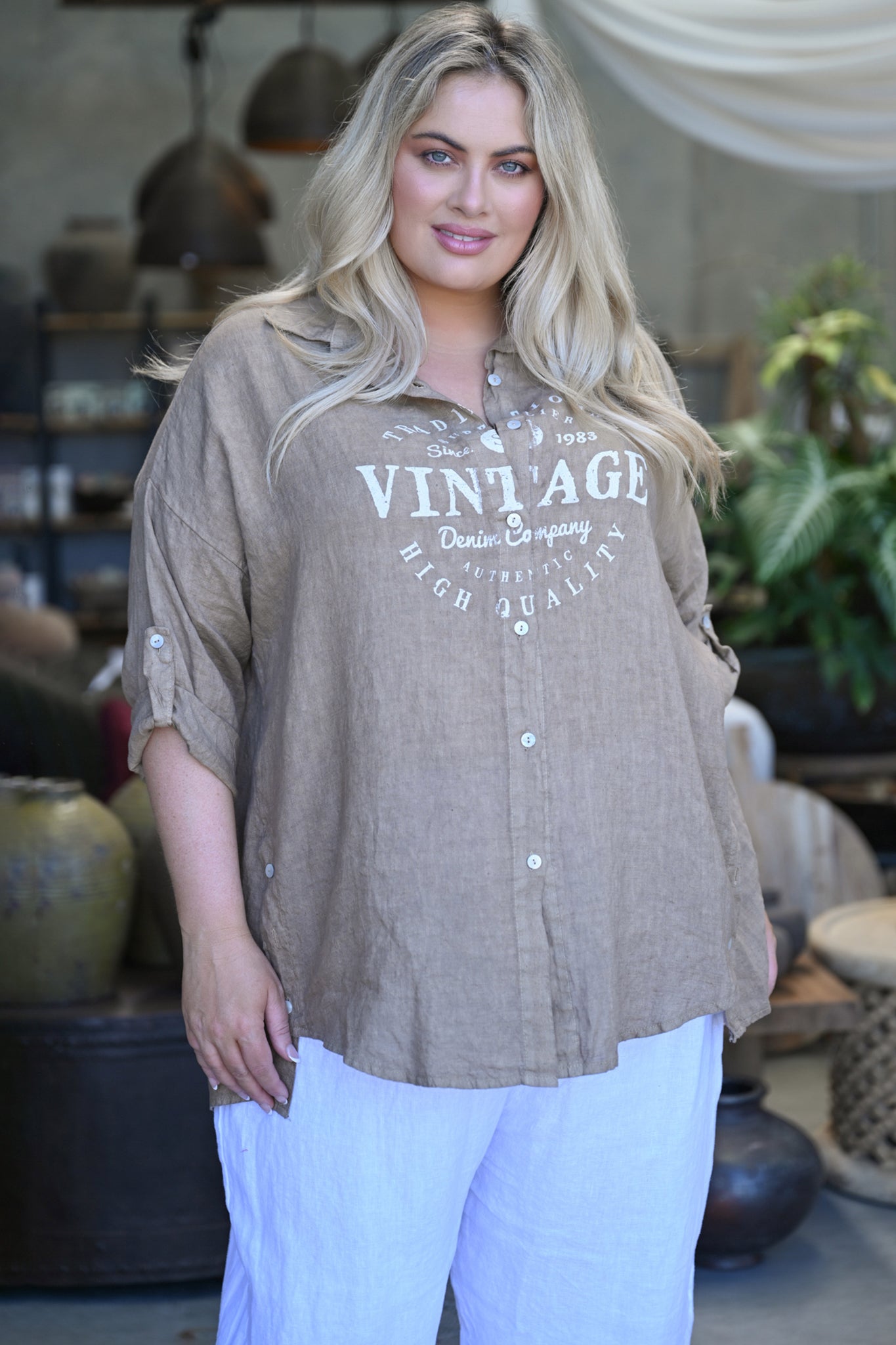 What sets this piece apart are its vintage-inspired emblems—a subtle stamped logo on the front and a bold, oversized graphic across the back—bringing character and a sense of well-worn charm. Whether worn open over layers, buttoned as a statement shirt, or styled as a lightweight dress, the Vintage Shirt is an effortlessly cool addition to any wardrobe.