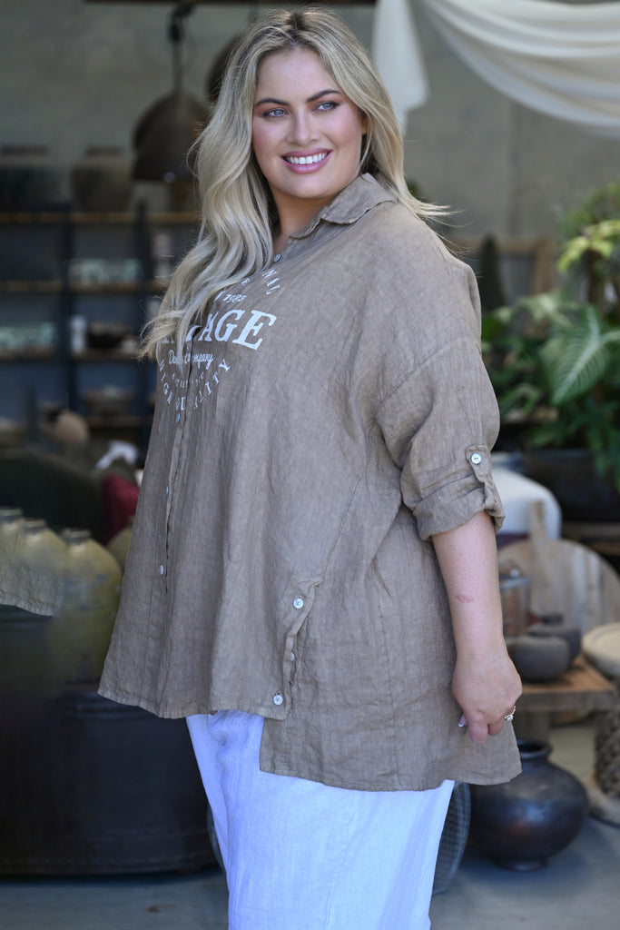 The collared neckline and button-down front offer classic structure, while ¾ sleeves fold up with a buttoned tab for a casual, lived-in feel. Side splits, detailed with feature buttons, add movement and a subtle point of difference. The back hem drops lower for a flattering, effortless drape that works beautifully over pants, shorts, or worn solo.