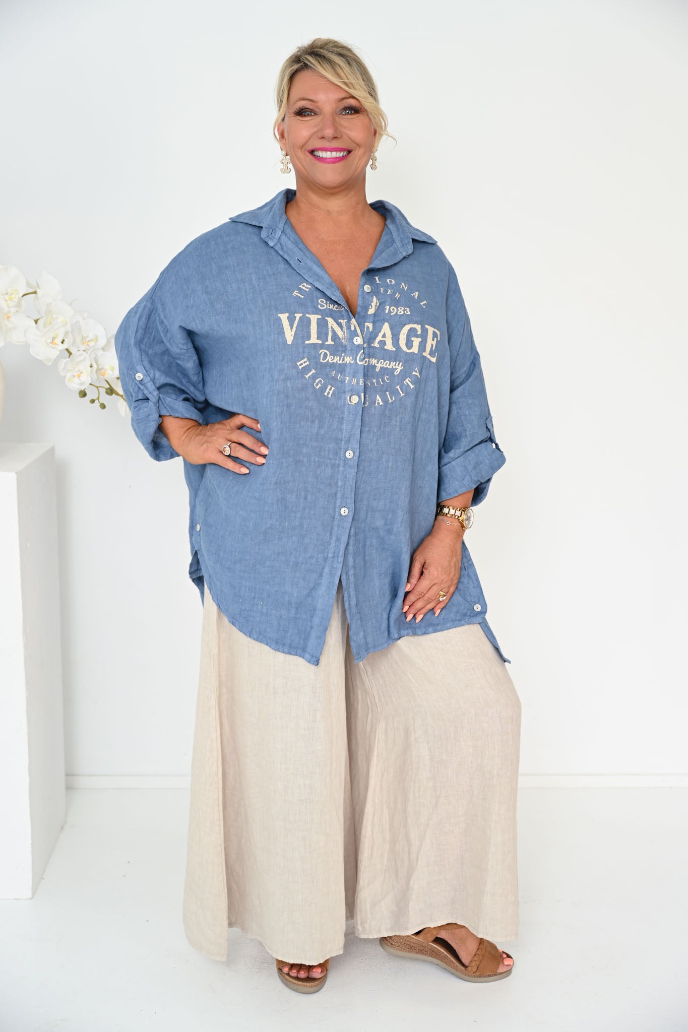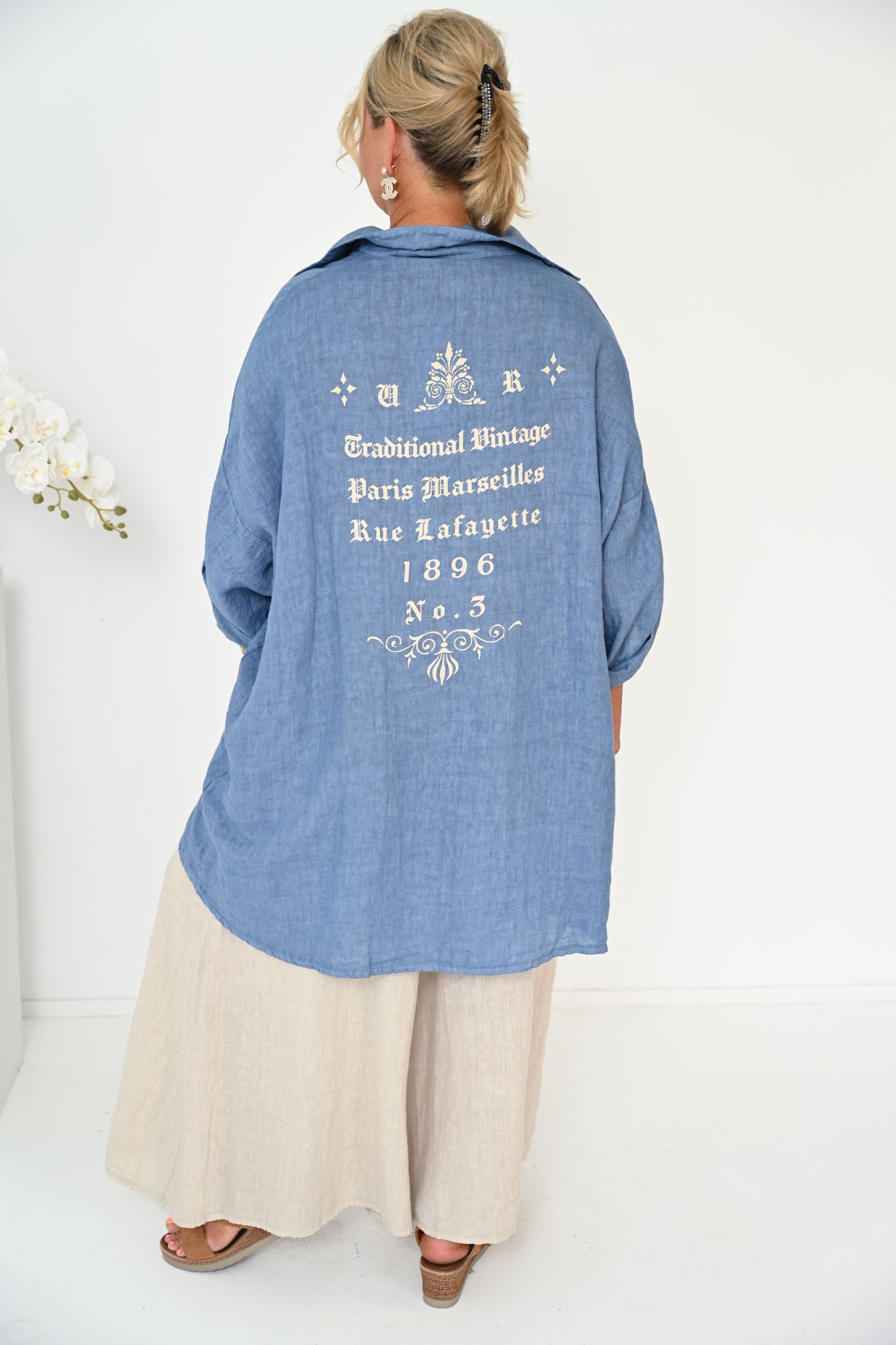 The Vintage Shirt in Jeans Blue blends relaxed styling with timeless appeal. Made from 100% linen, this oversized piece is designed to sit somewhere between a shirt and a dress, offering an easy, laid-back silhouette that falls just above the knee and drapes naturally over the body.